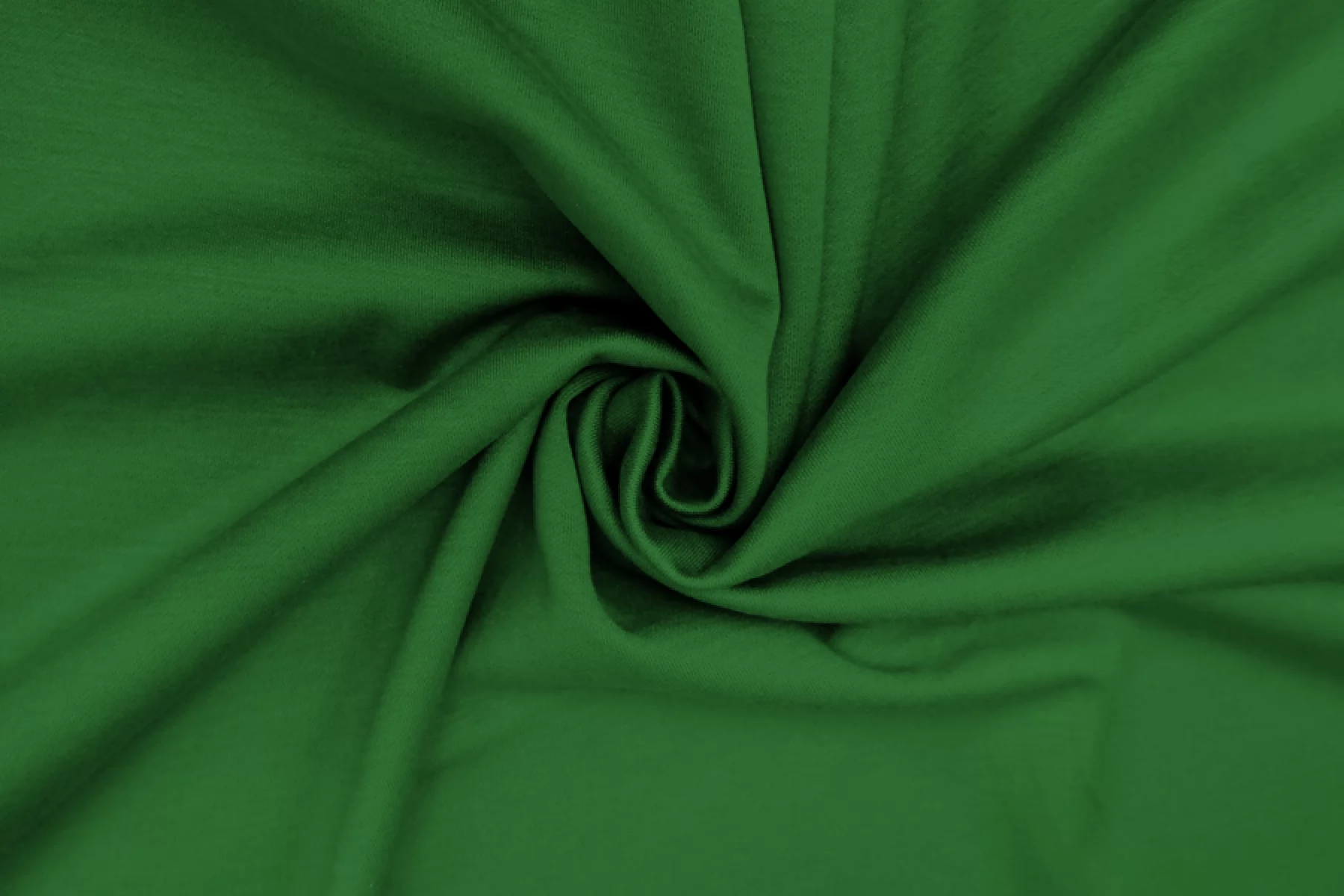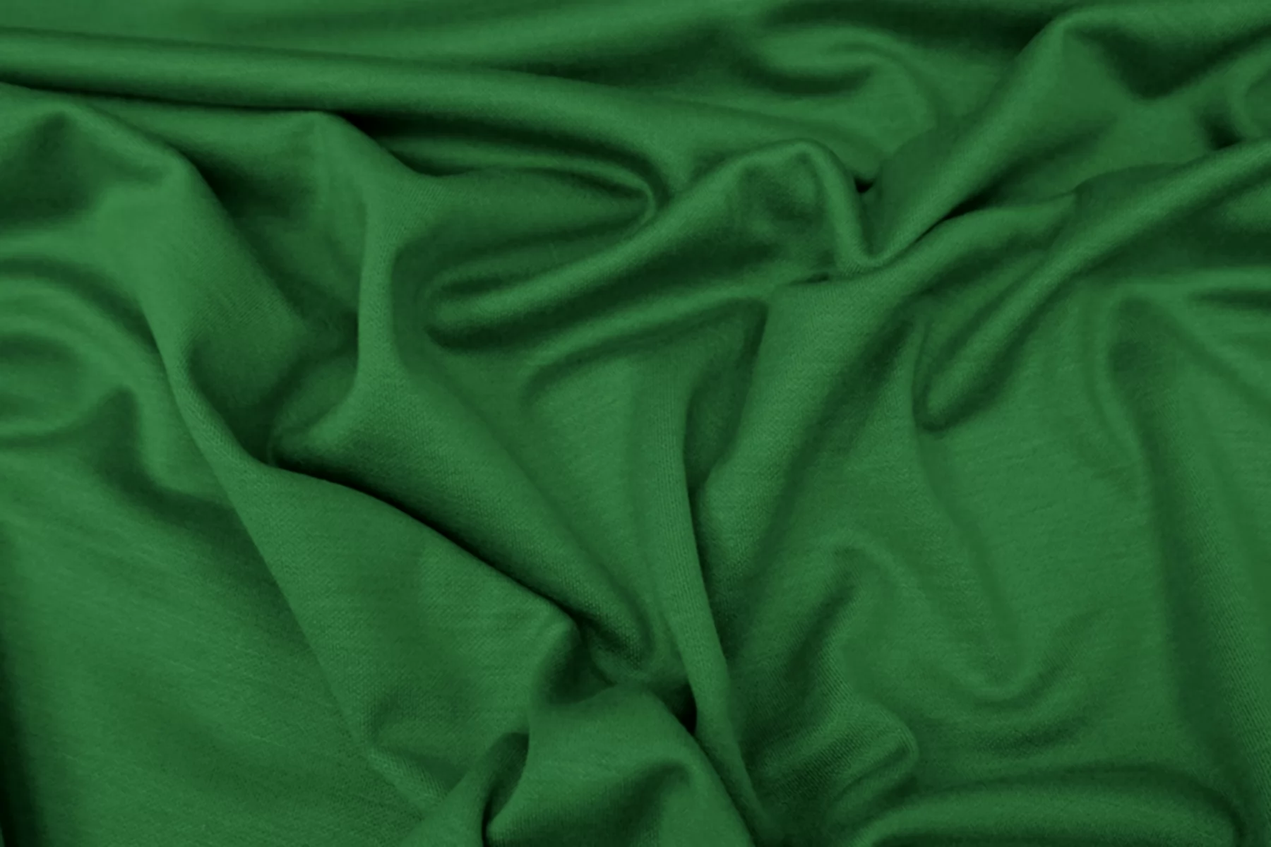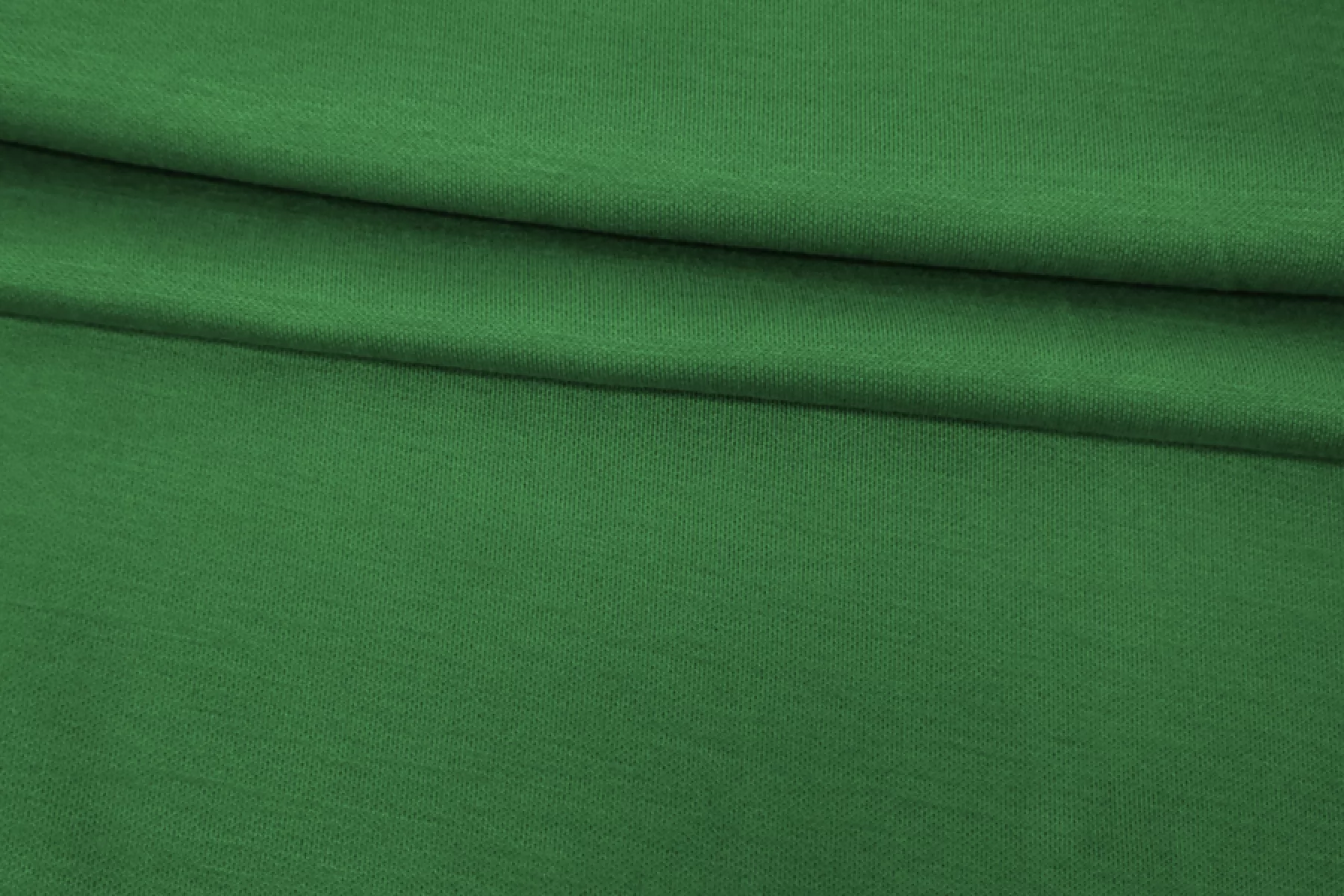Трикотаж-джерси вискозный в зеленом цвете. Гладкий. Эластичный, пластичный, плотный, не просвечивает. Подойдет для пошива платья, юбки, топа, кофты или кардигана. Учитывайте возможную усадку.