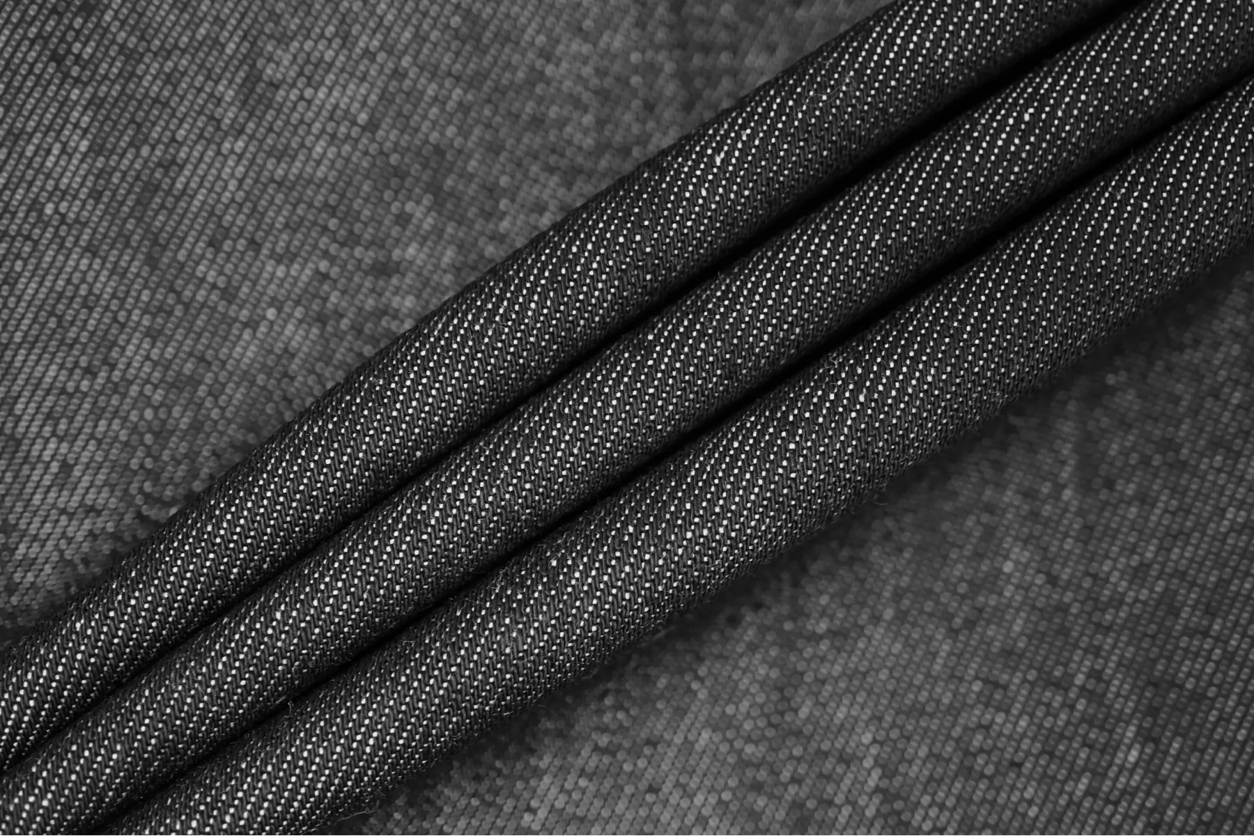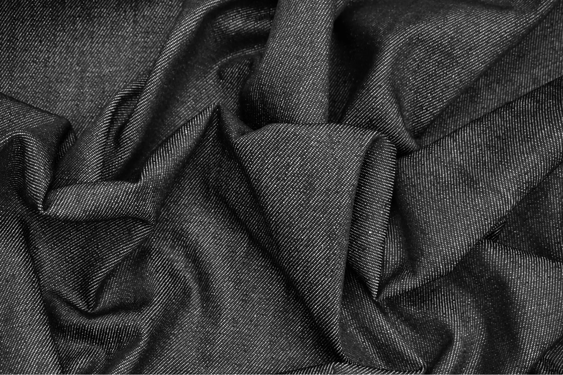 Хлопковая джинса черного оттенка с белыми нитями в плетении диагоналей. Тактильно ткань слегка шероховатая, средней плотности. Пластичная, хорошо драпируется и отлично держит форму. Не просвечивает, тянется. Отличный вариант на куртки, жакеты, платья, брюки, костюм или юбку. Учитывайте усадку.
