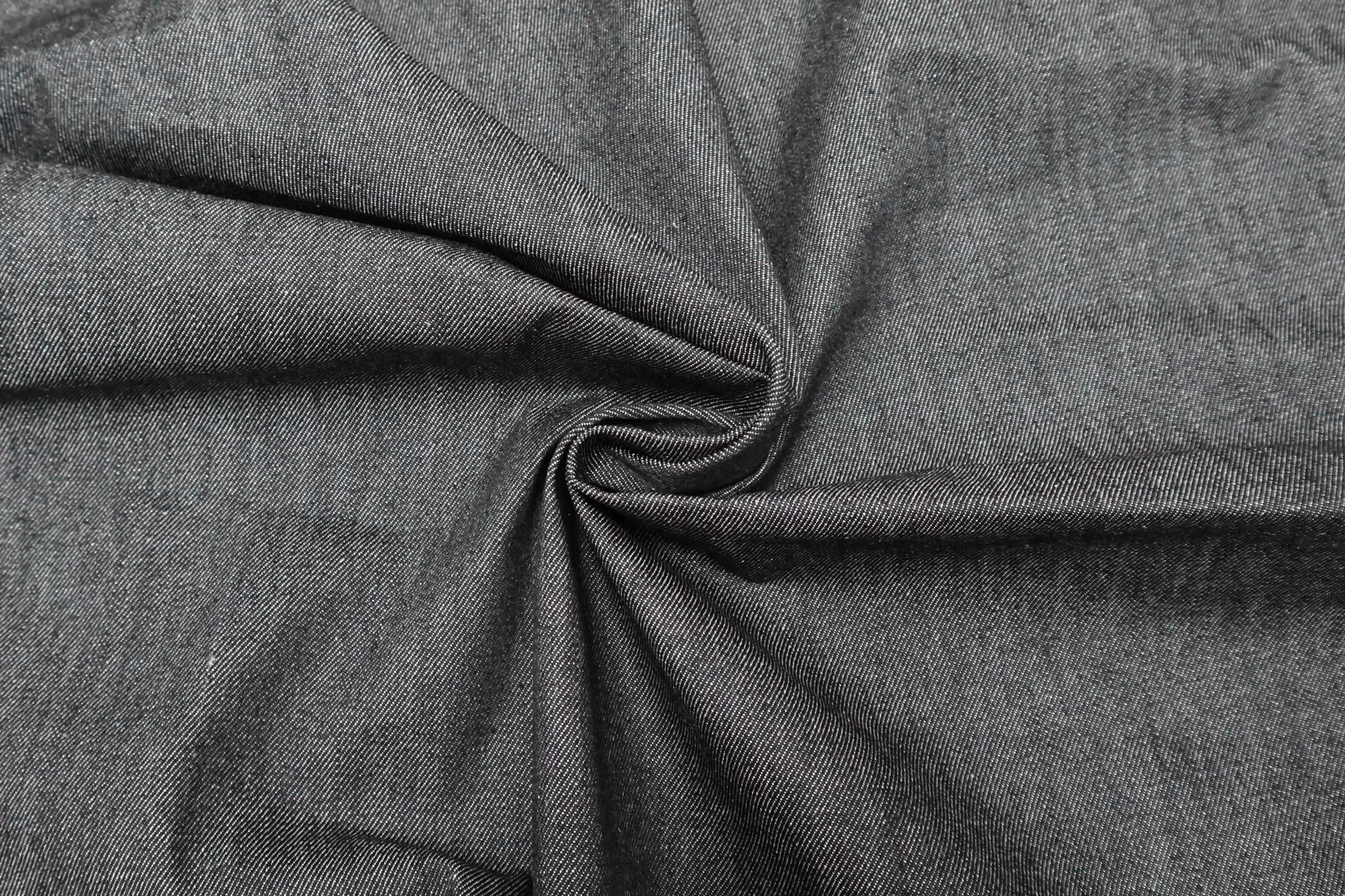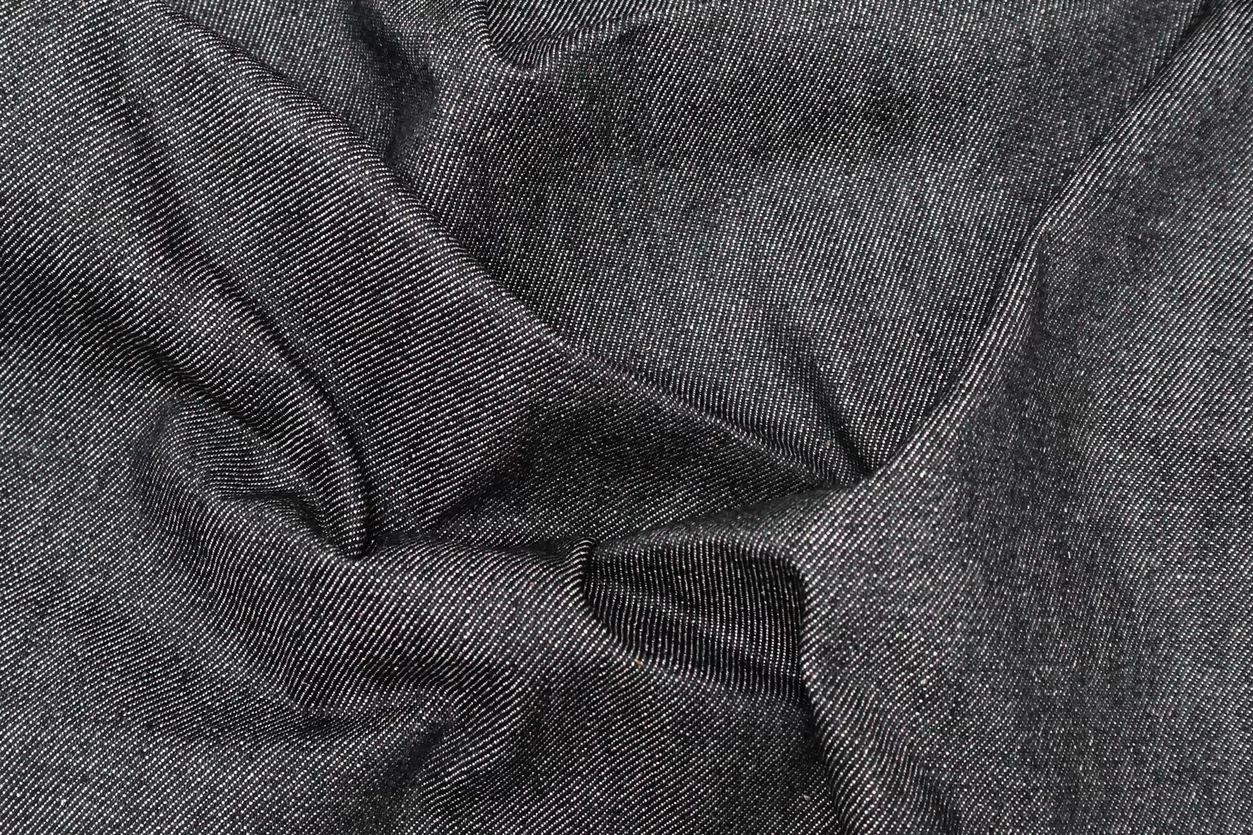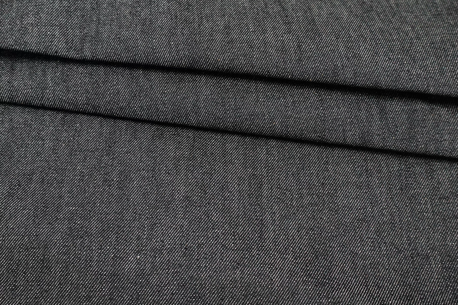 Хлопковая итальянская джинса диагонального плетения иссиня-чёрного цвета, с молочными нитями в плетении. Материал плотный, умеренной пластичности, чувствуется фактура наощупь. Не тянется. Не просвечивает. Сминается средне, форму держит. Отличный вариант на джинсовки, джинсы, юбки. Учитывайте усадку.