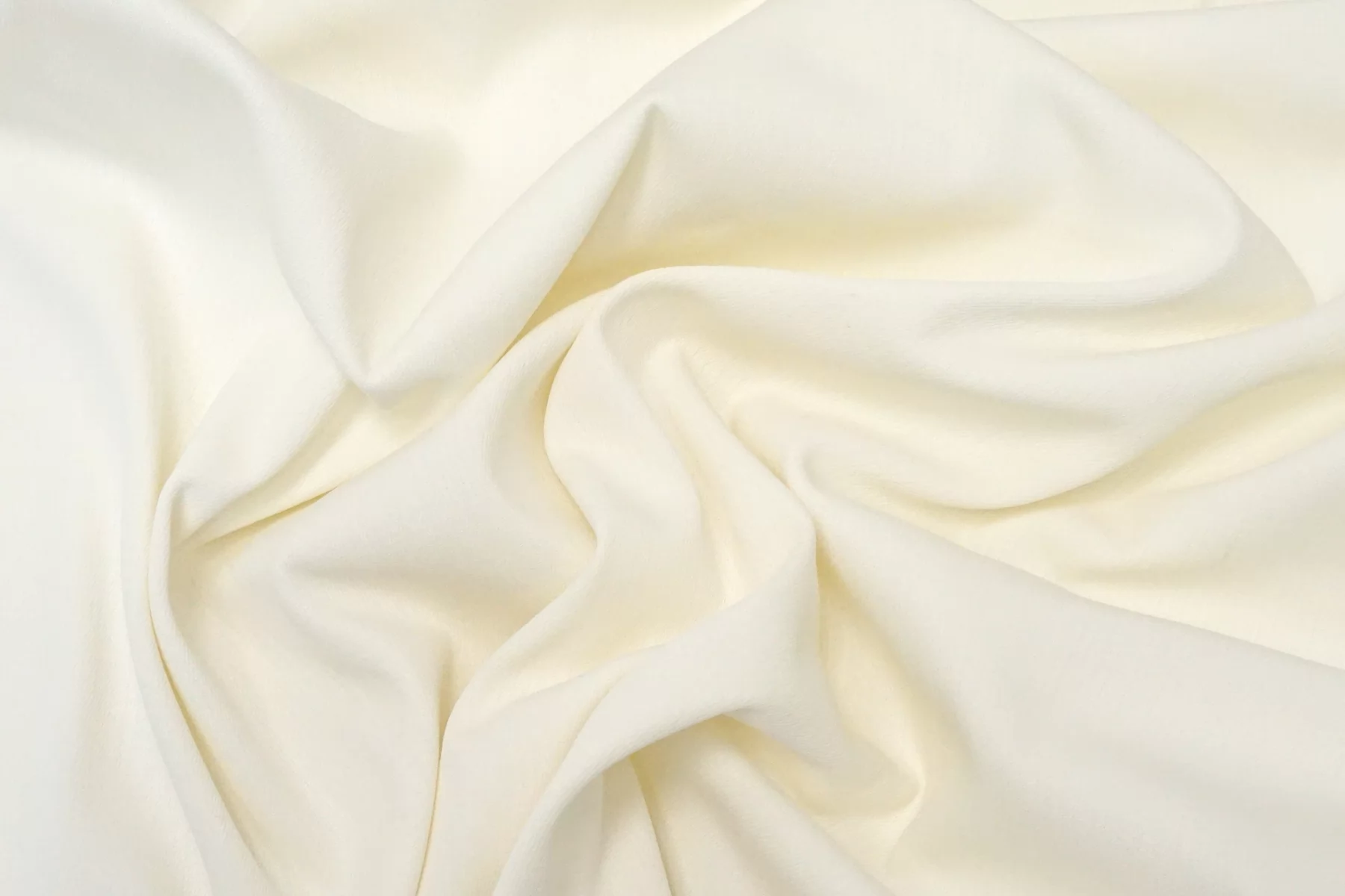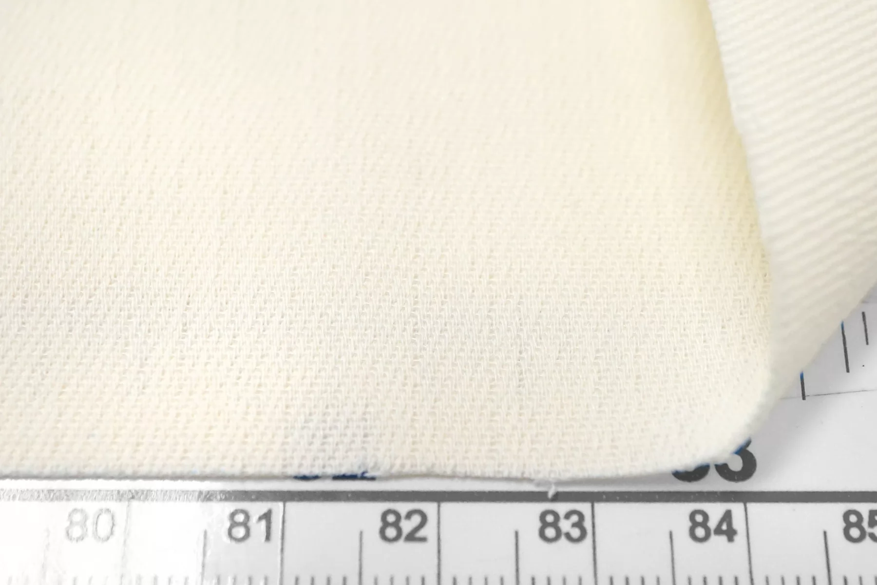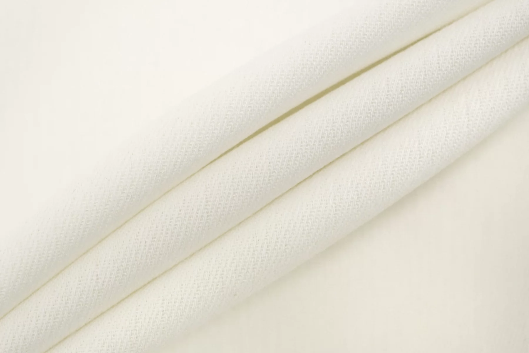 Хлопковая джинса диагонального плетения в бело-молочном оттенке. Плотная, тактильно приятная. Хорошо держит форму и отлично драпируется. Не тянется, минимально просвечивает тёмное в один слой. Немного сминается. Отличный вариант на куртки, жакеты, юбки, шорты, джинсы.