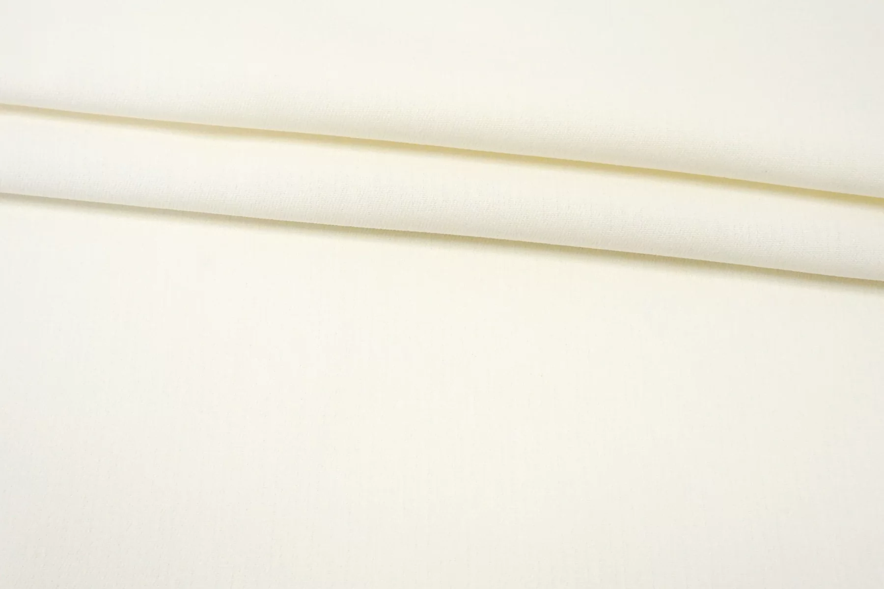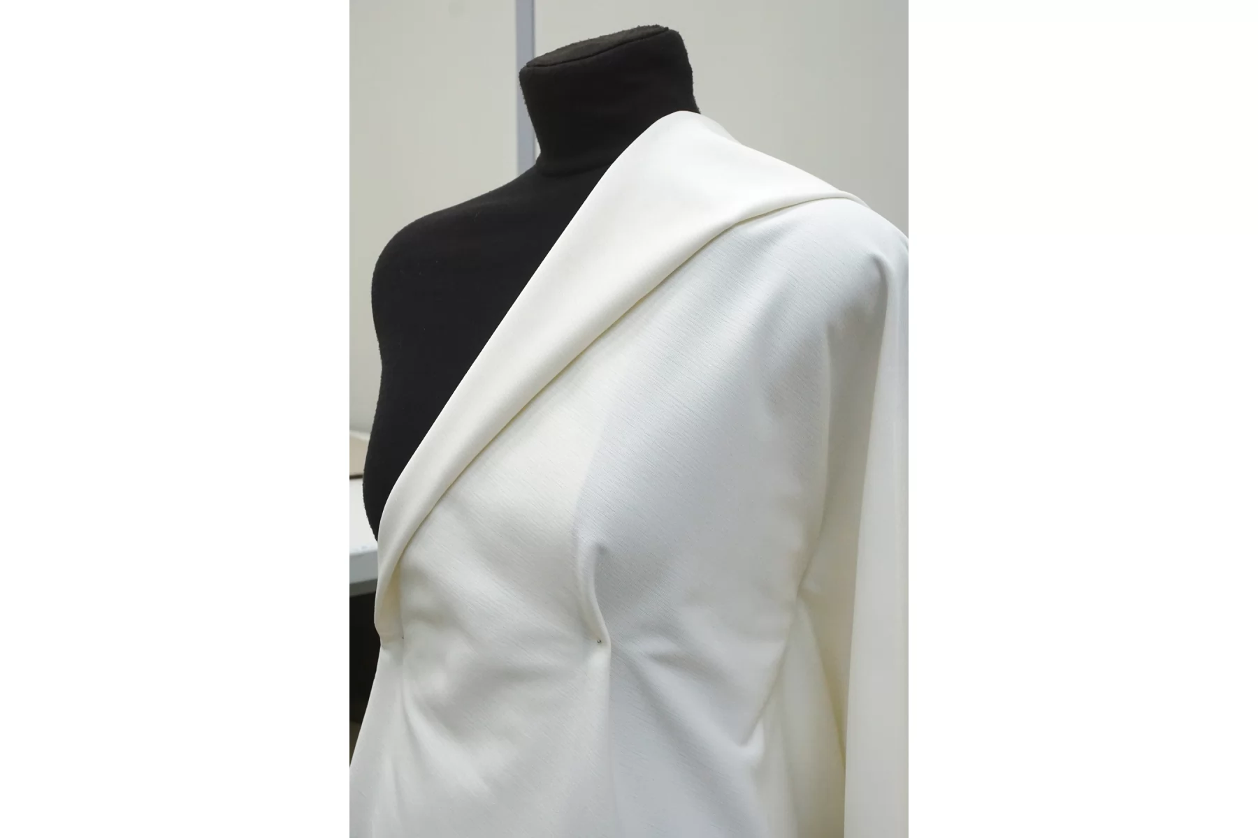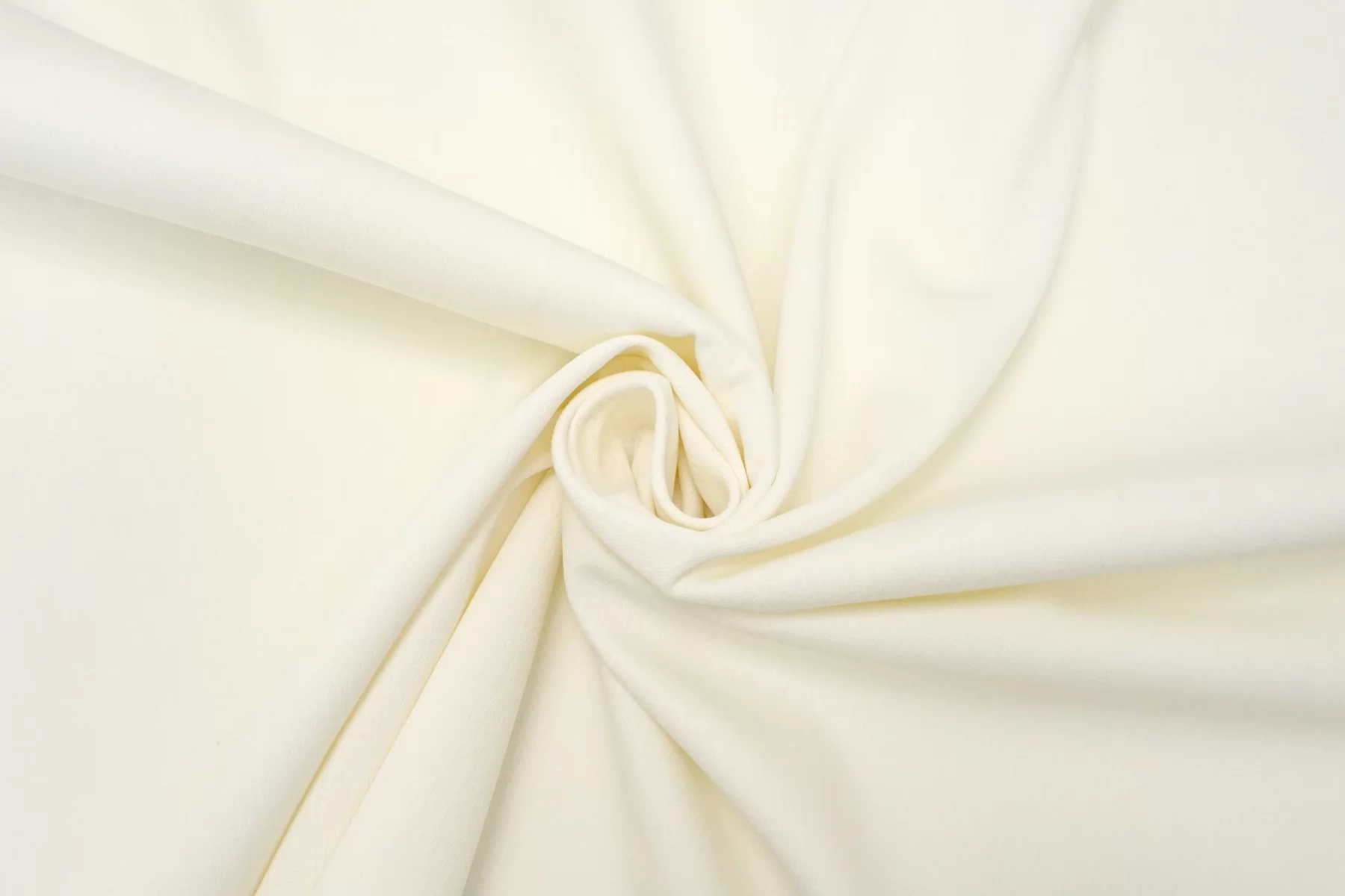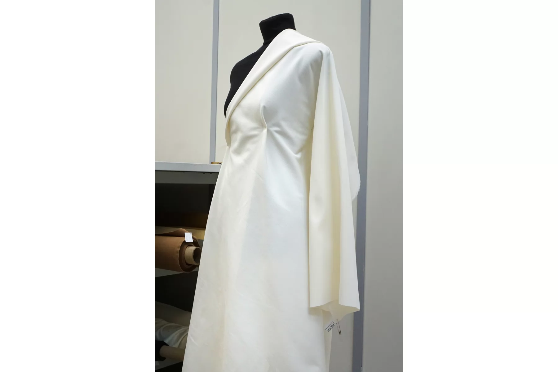 Хлопковая джинса диагонального плетения в бело-молочном оттенке. Плотная, тактильно приятная. Хорошо держит форму и отлично драпируется. Не тянется, минимально просвечивает тёмное в один слой. Немного сминается. Отличный вариант на куртки, жакеты, юбки, шорты, джинсы.