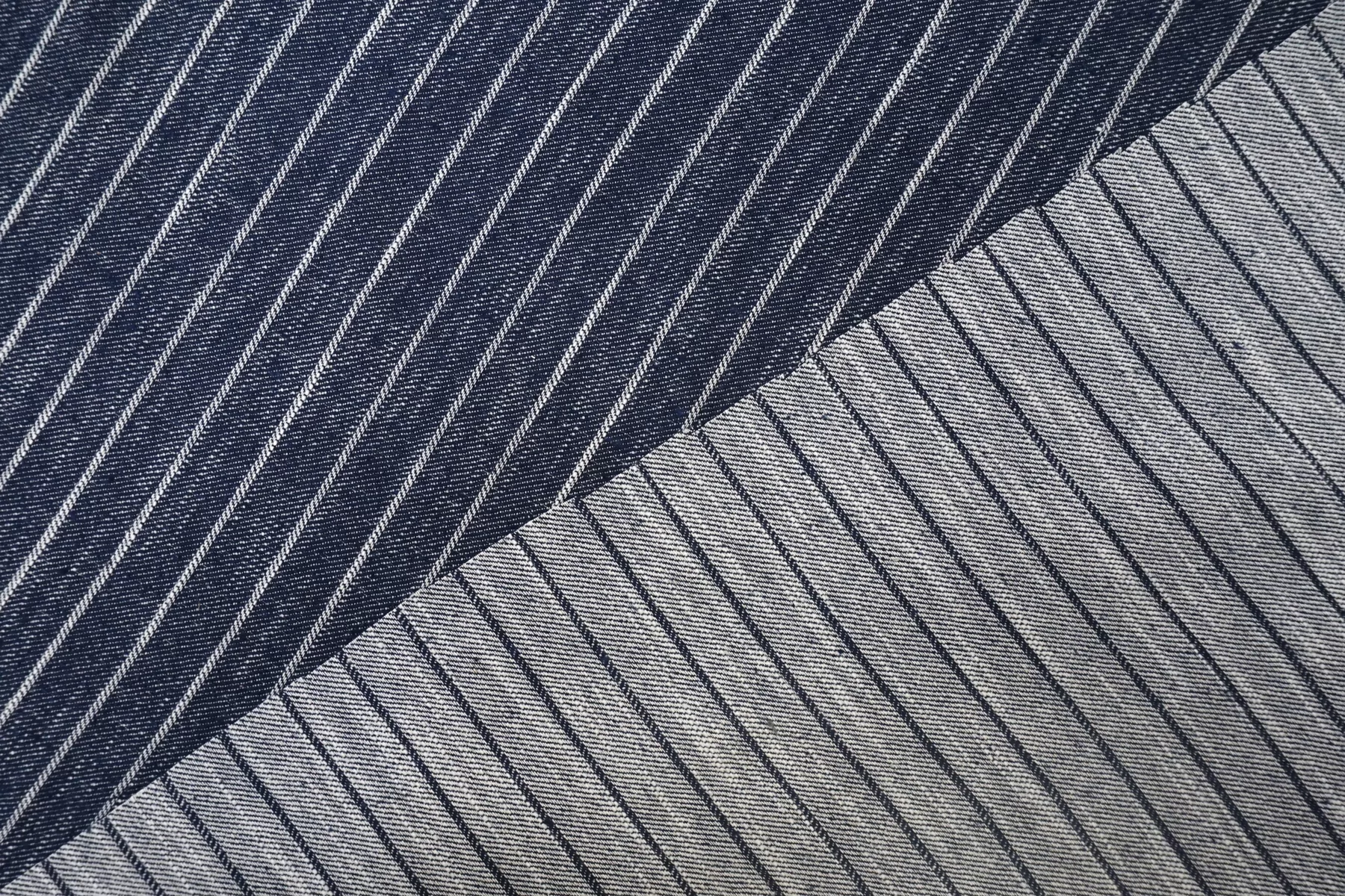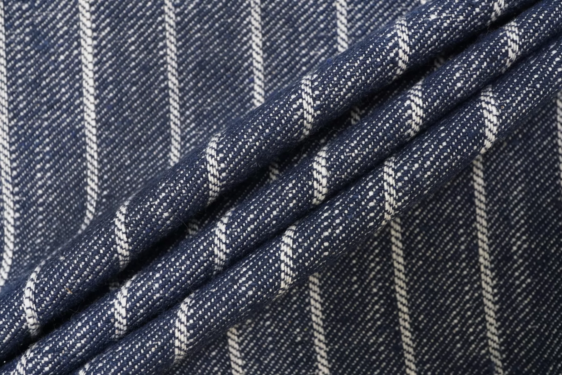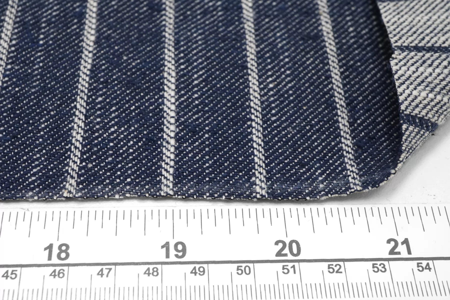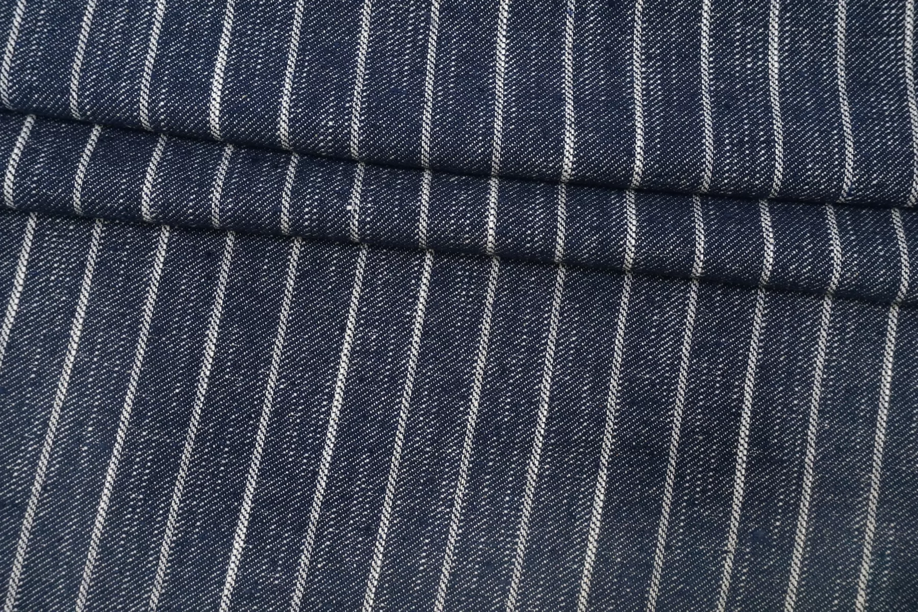 Джинса из хлопка с небольшой добавкой льна, в полоску. Тактильно приятная. Пластичная, форму держи умеренно. Не тянется. Слегка сминается, но восстанавливается. Не просвечивает. Отлично подойдет на джинсовые куртки, жакеты и юбки, а также свободные джинсы.