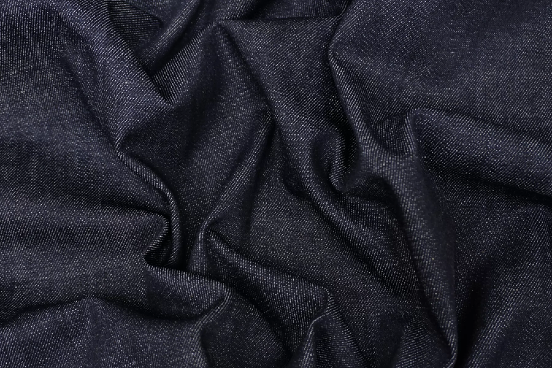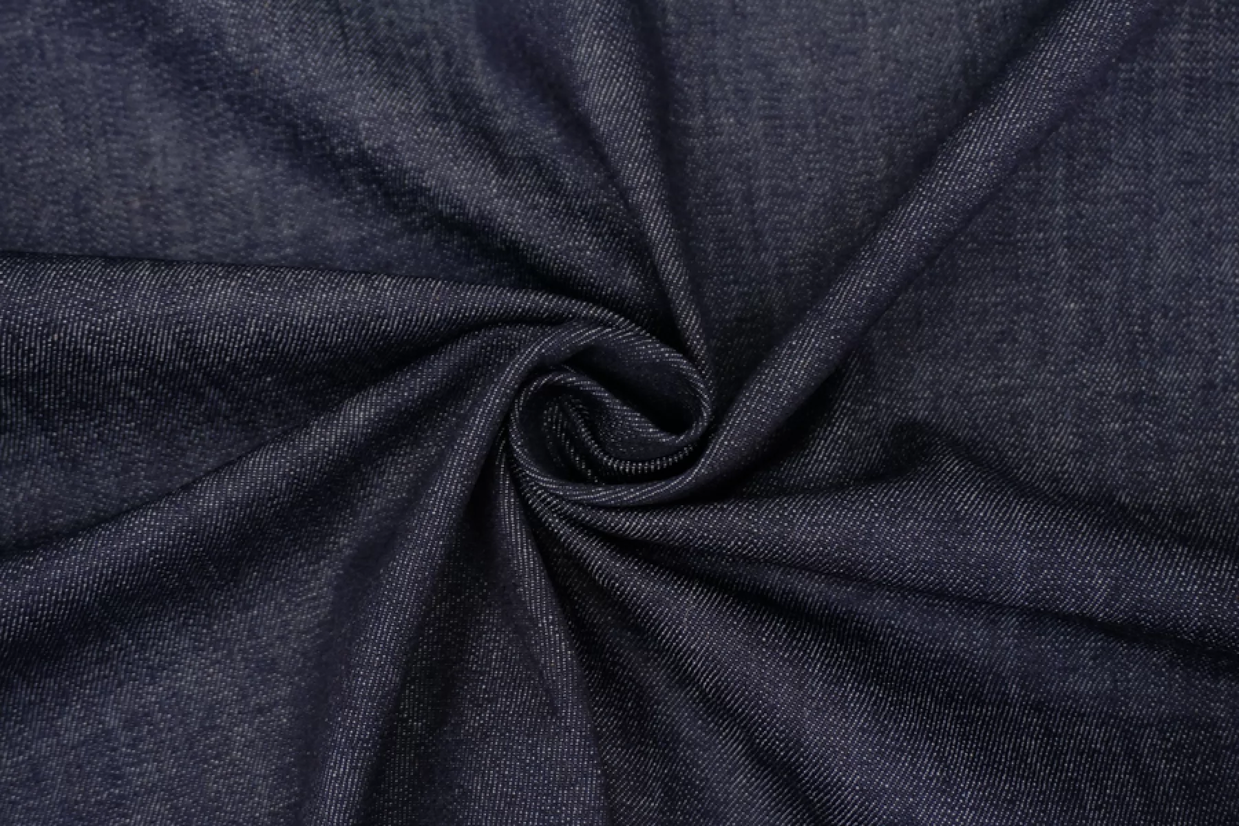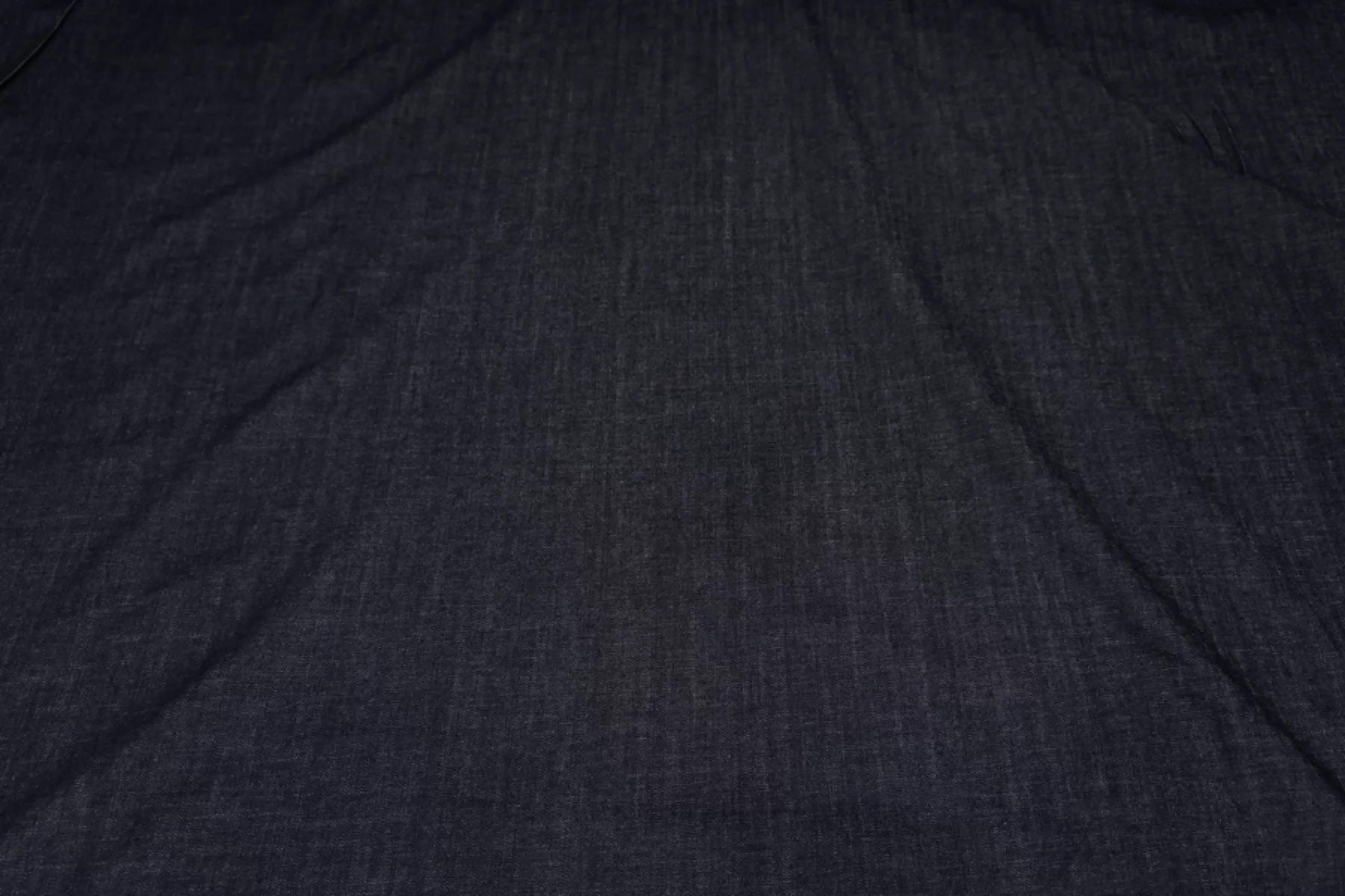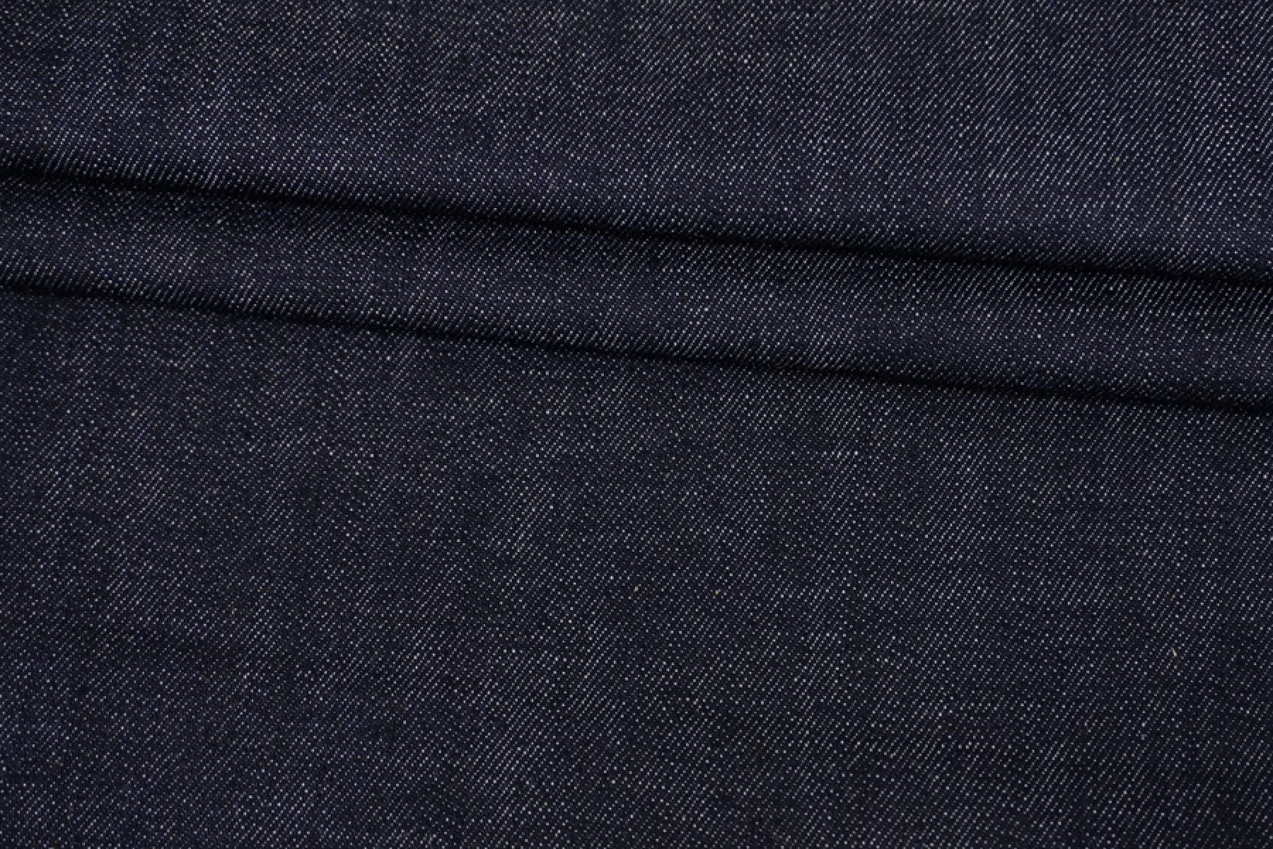 Хлопковая джинса стрейч глубокого темно-синего оттенка. Приятная тактильно, плотная, слегка шероховатая. Проглядывают в плетении диагоналей белые нити. Формодержащая. Не просвечивает. Немного мнется, но почти полностью восстанавливается. Тянется за счет добавления эластана. Отличный вариант на куртки, свободные джинсы, жакеты, плащи, юбки, шорты и бомберы.