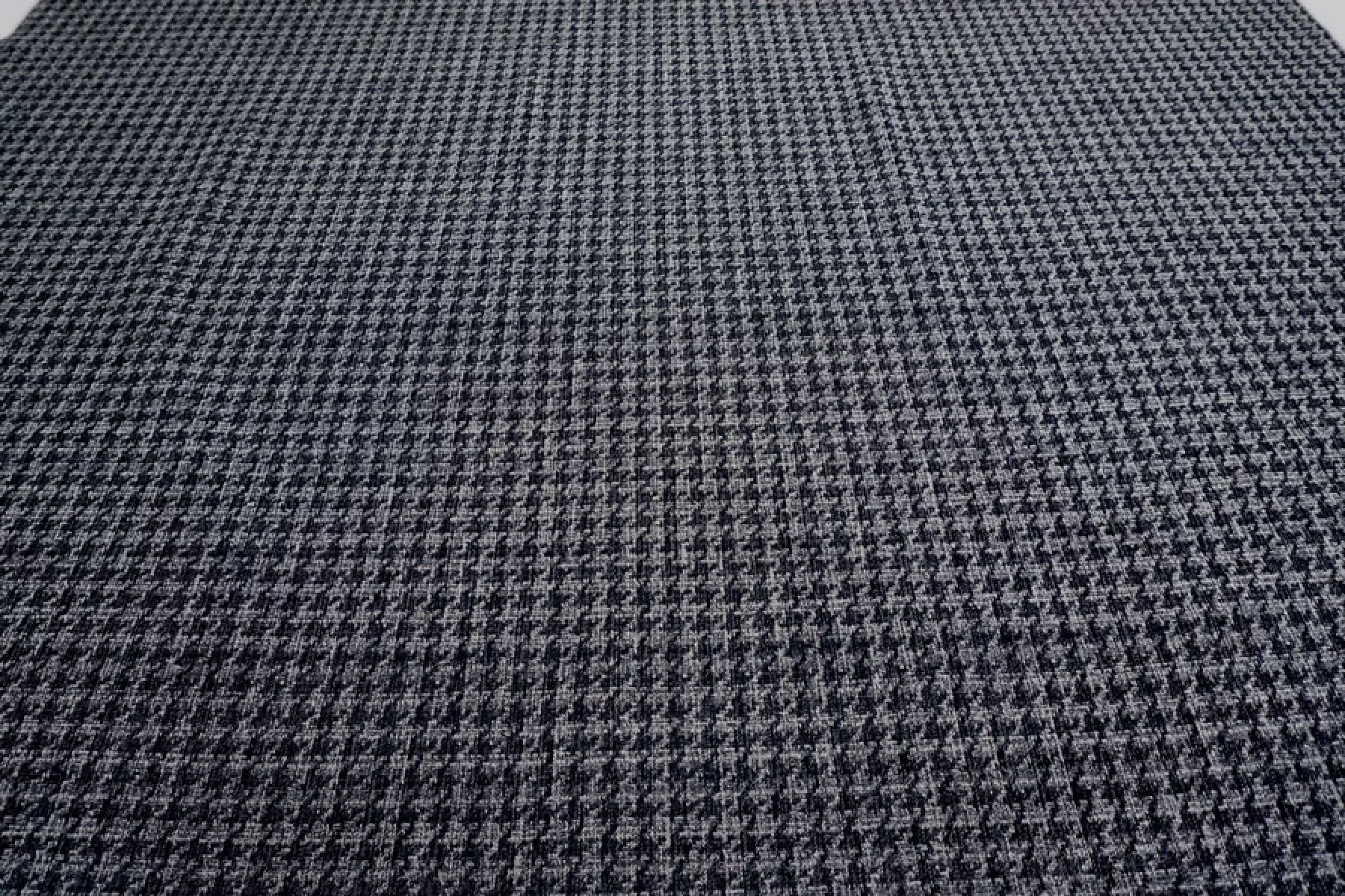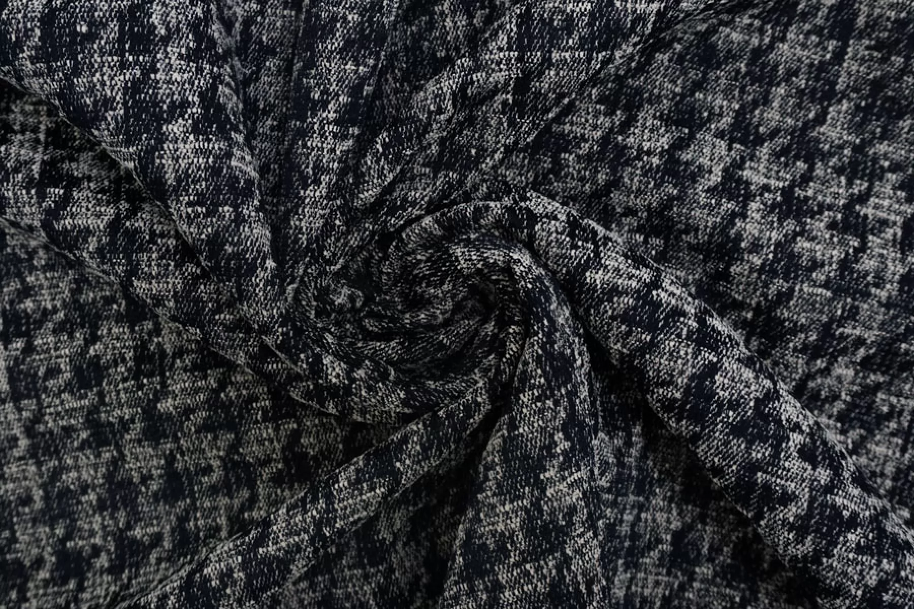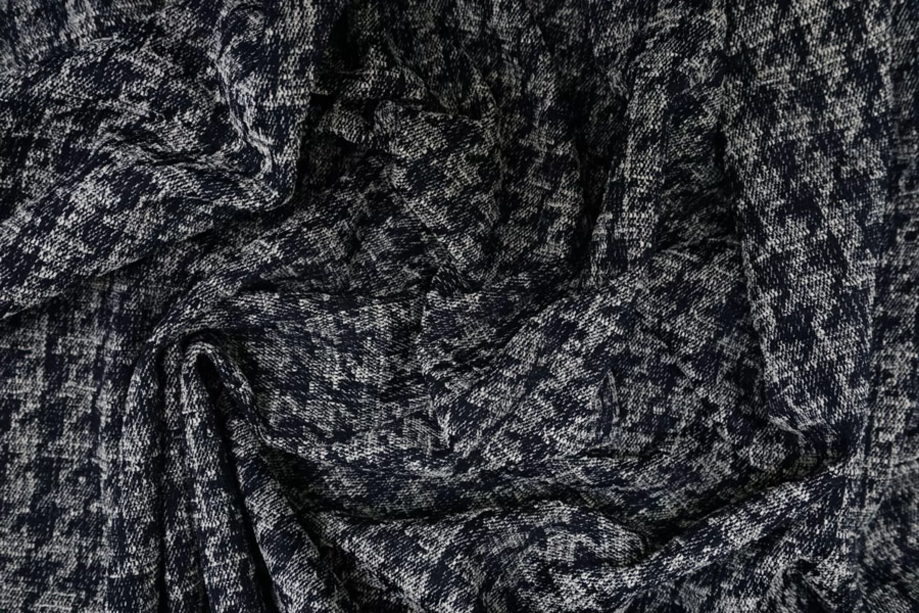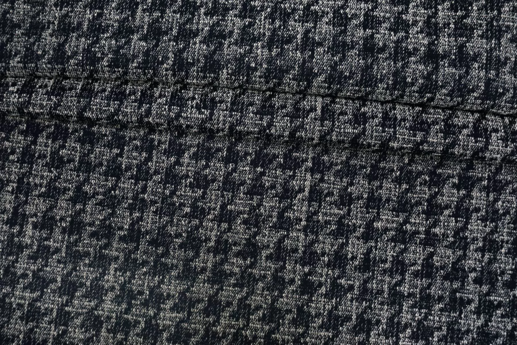 Интересная хлопковая жаккардовая джинса плетения нитей темно-синего и молочного цвета с выработкой в виде среднего размера гусиной лапки. Очень мягкая и приятная наощупь, пластичная.. Немного чувствуется фактурность. Не тянется и не просвечивает. Форму держит. Практически не мнется. Отлично подойдет на жакеты, плащи, куртки, юбки и другие варианты.