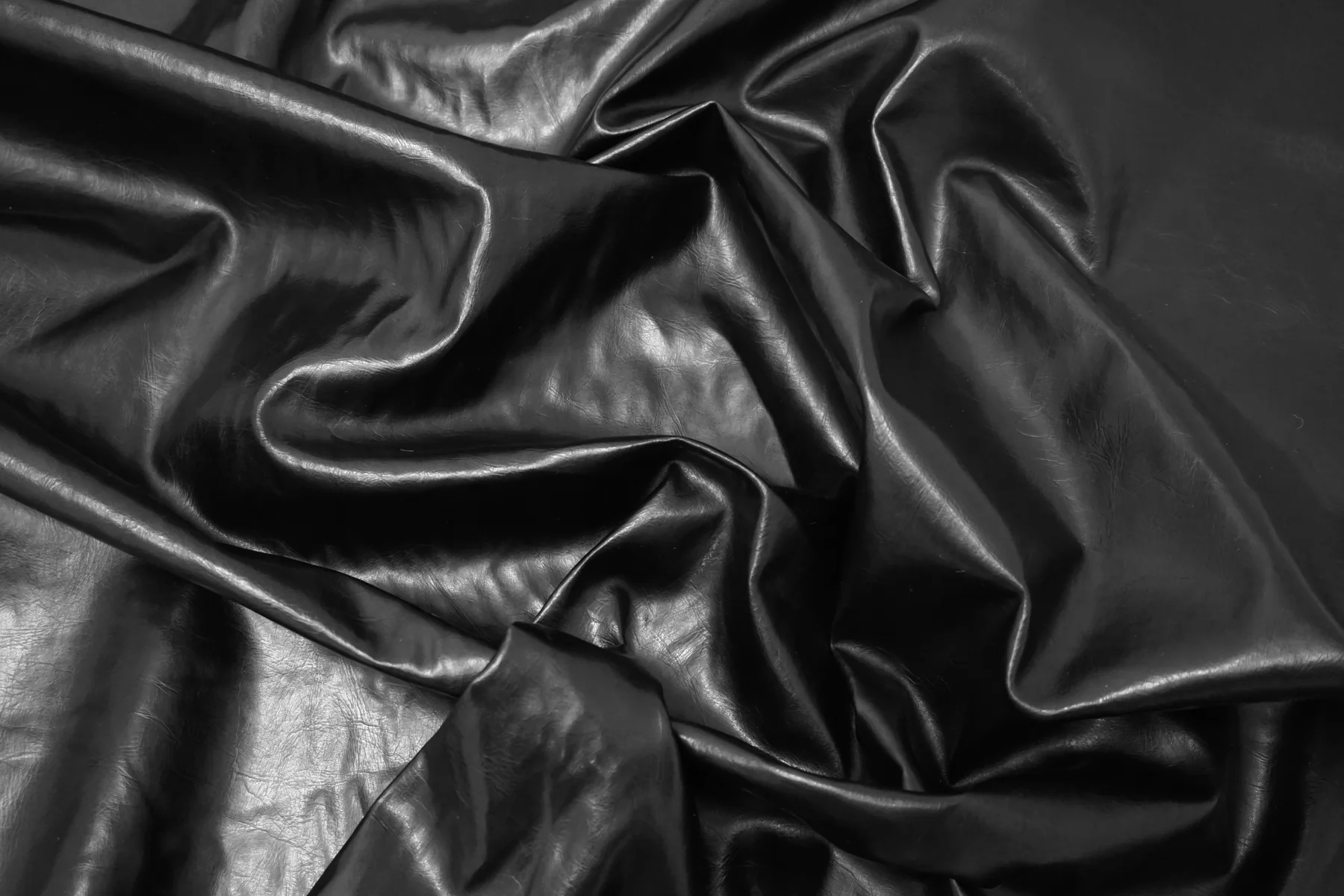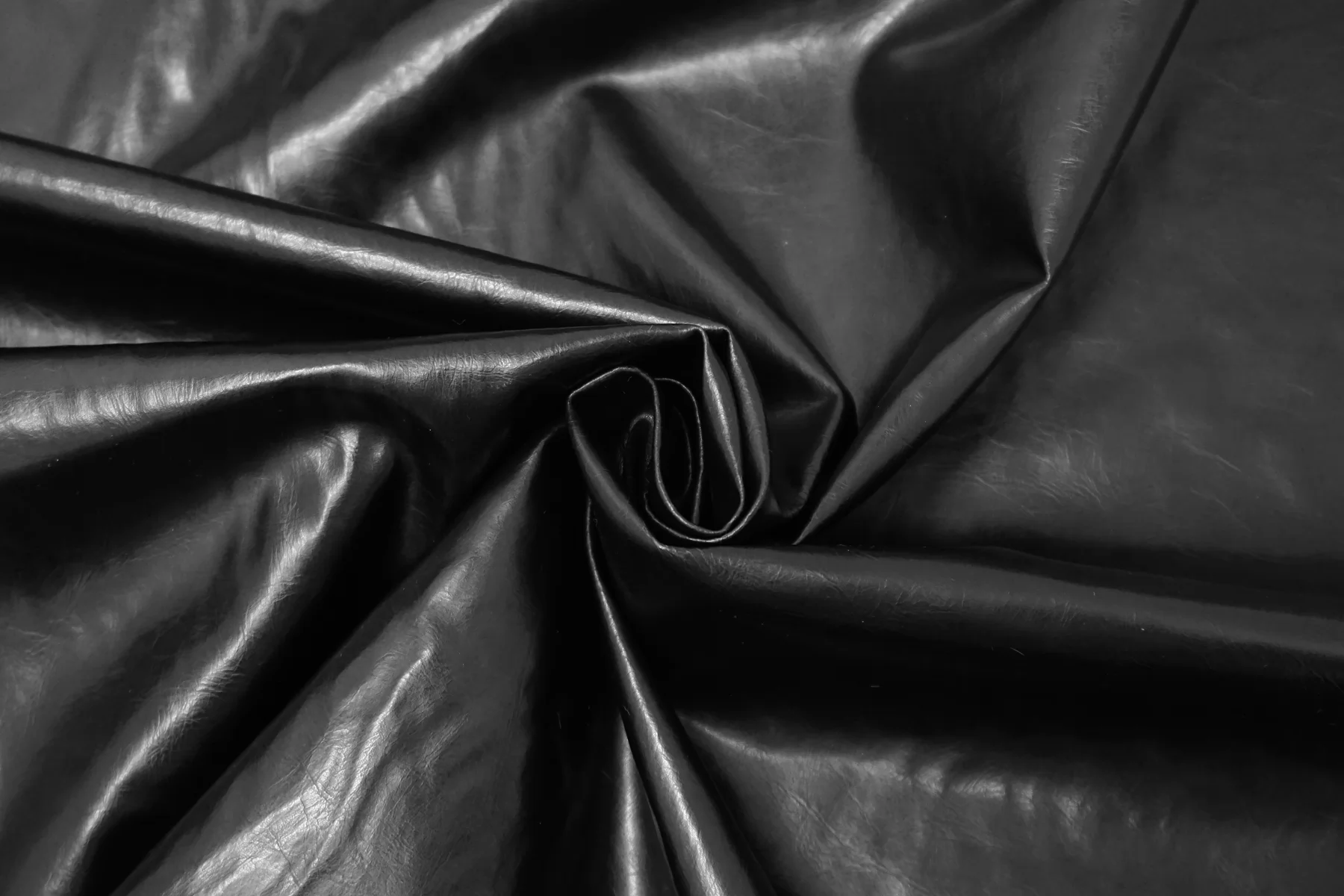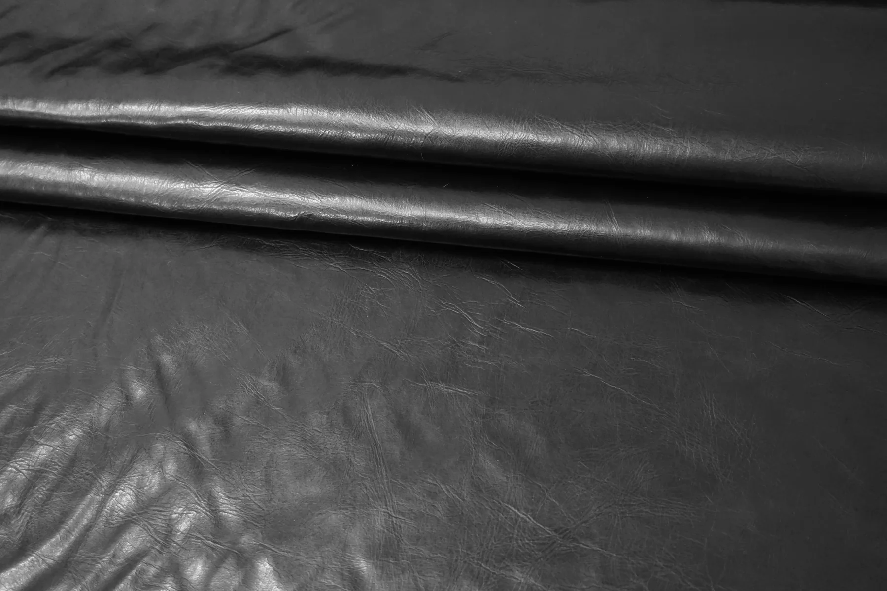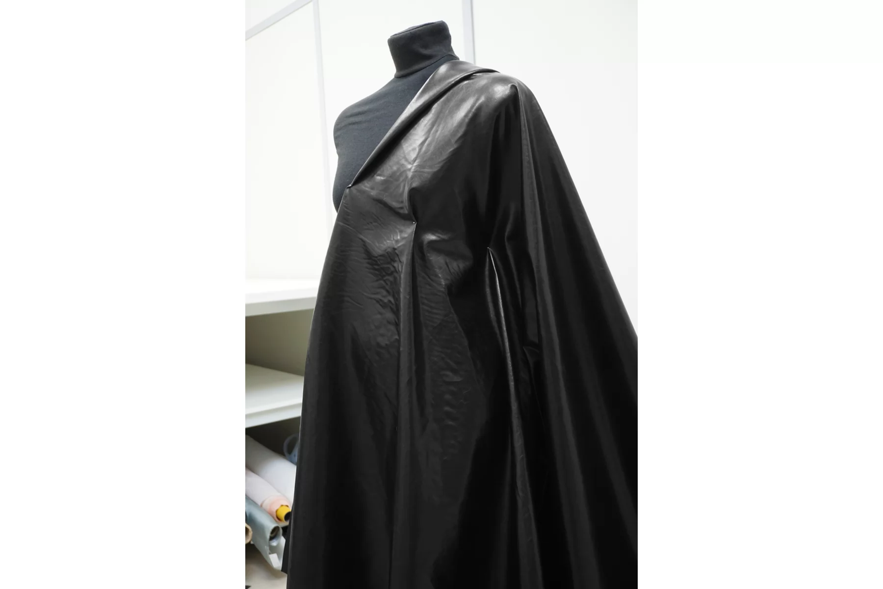 Итальянская чёрная экокожа, костюмной плотности. Не просвечивает. С тиснением, матовый отблеск. Форму держит. Можно сшить тонкую кожанку для теплой погоды, плотную рубашку, платье. Советуем изделия без сильного прилегания, т.к. эта кожа мало-эластичная.