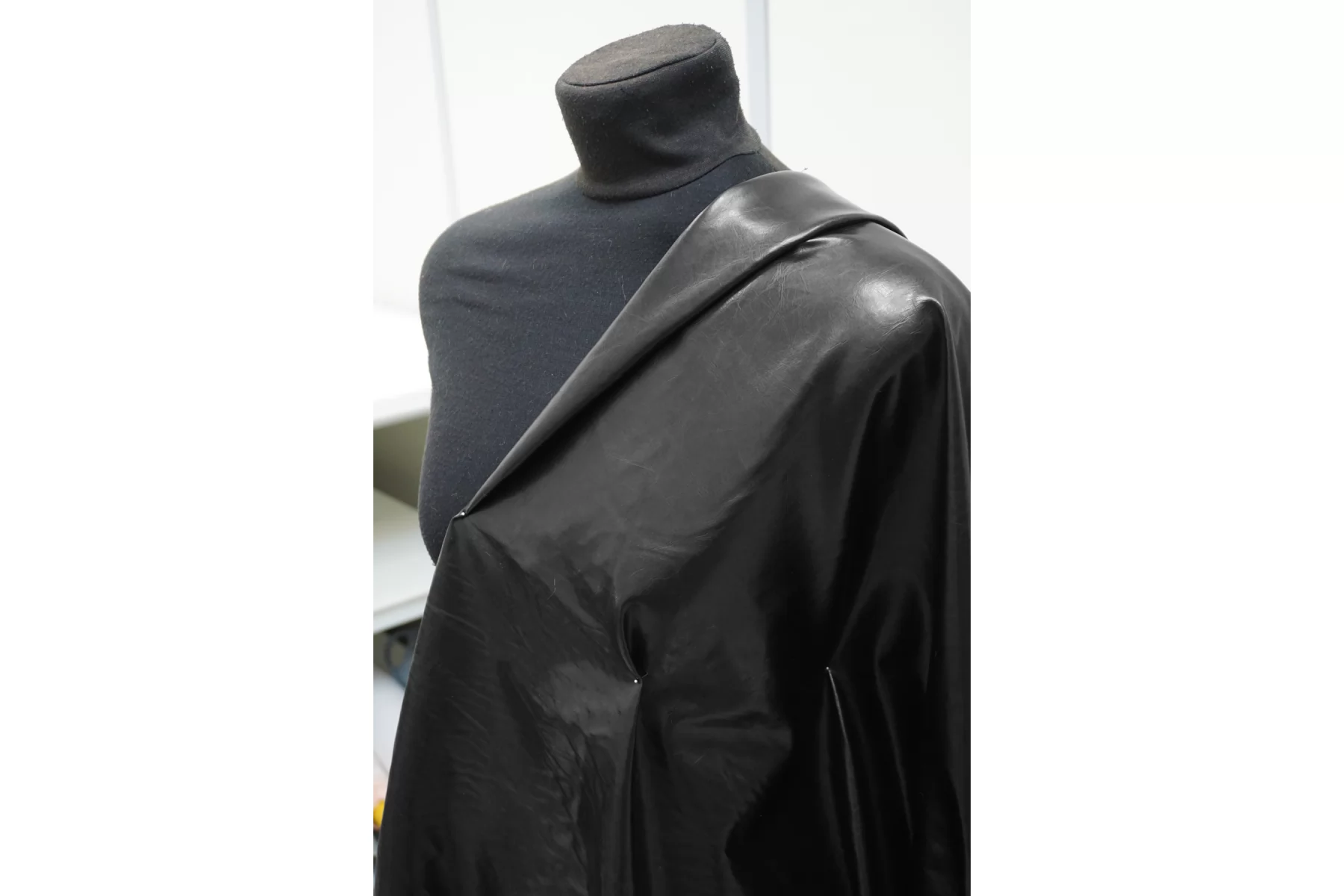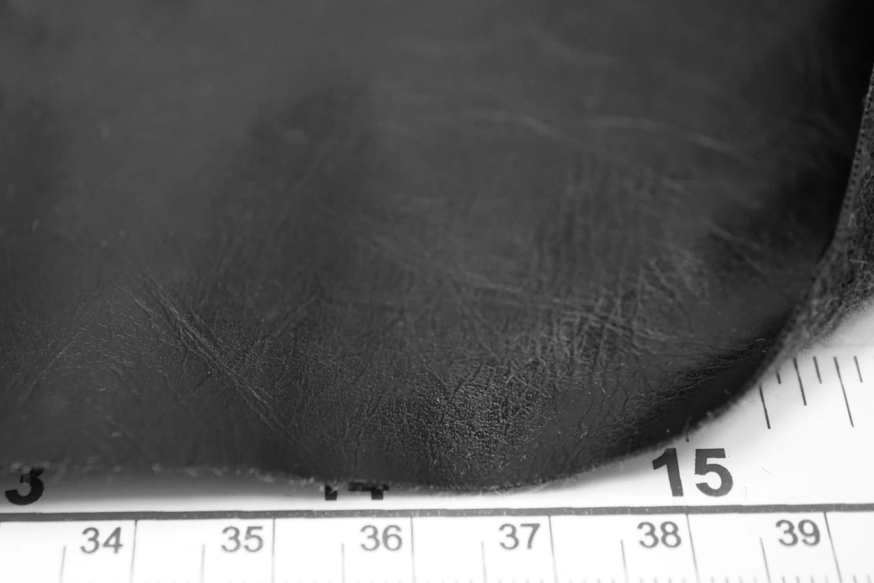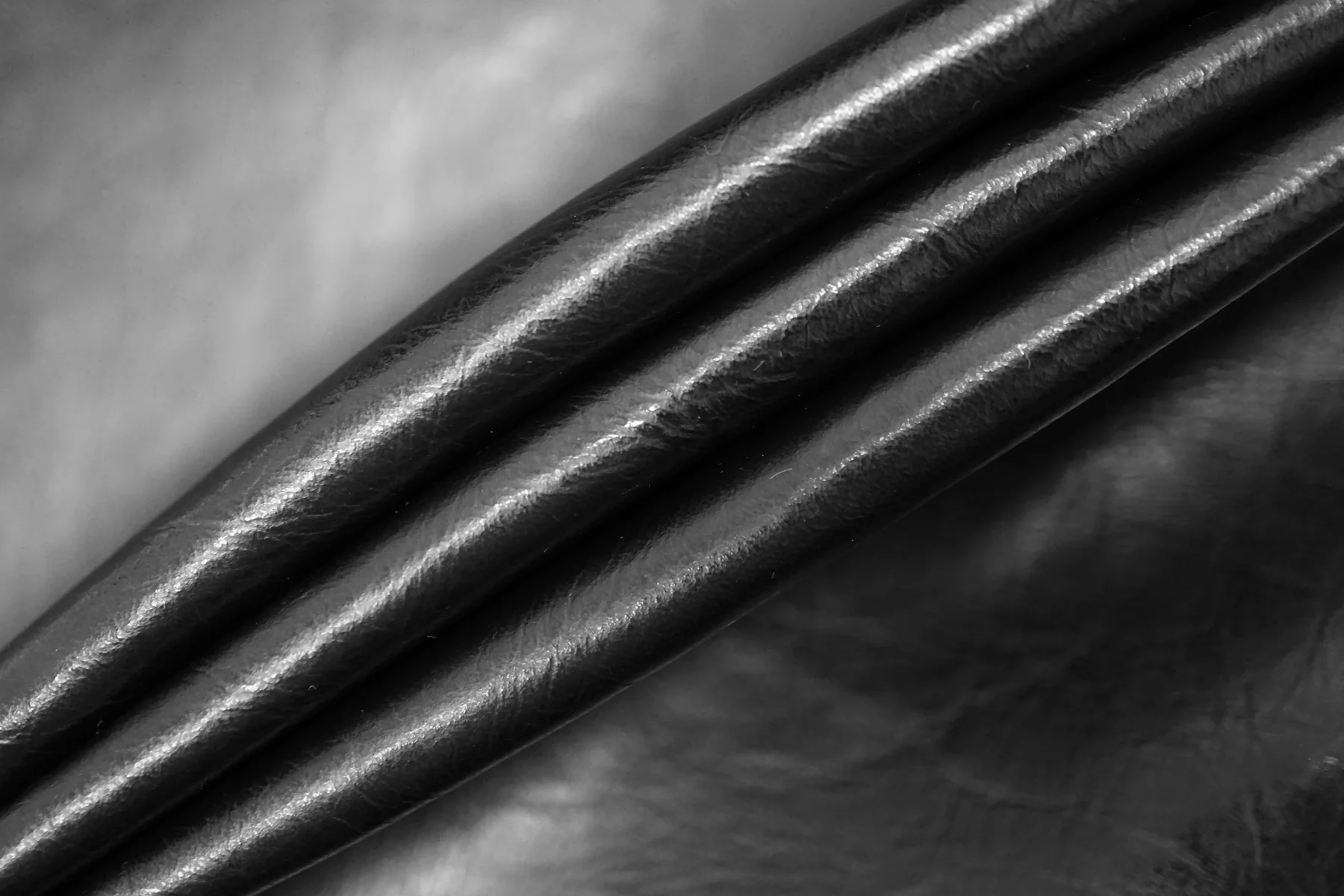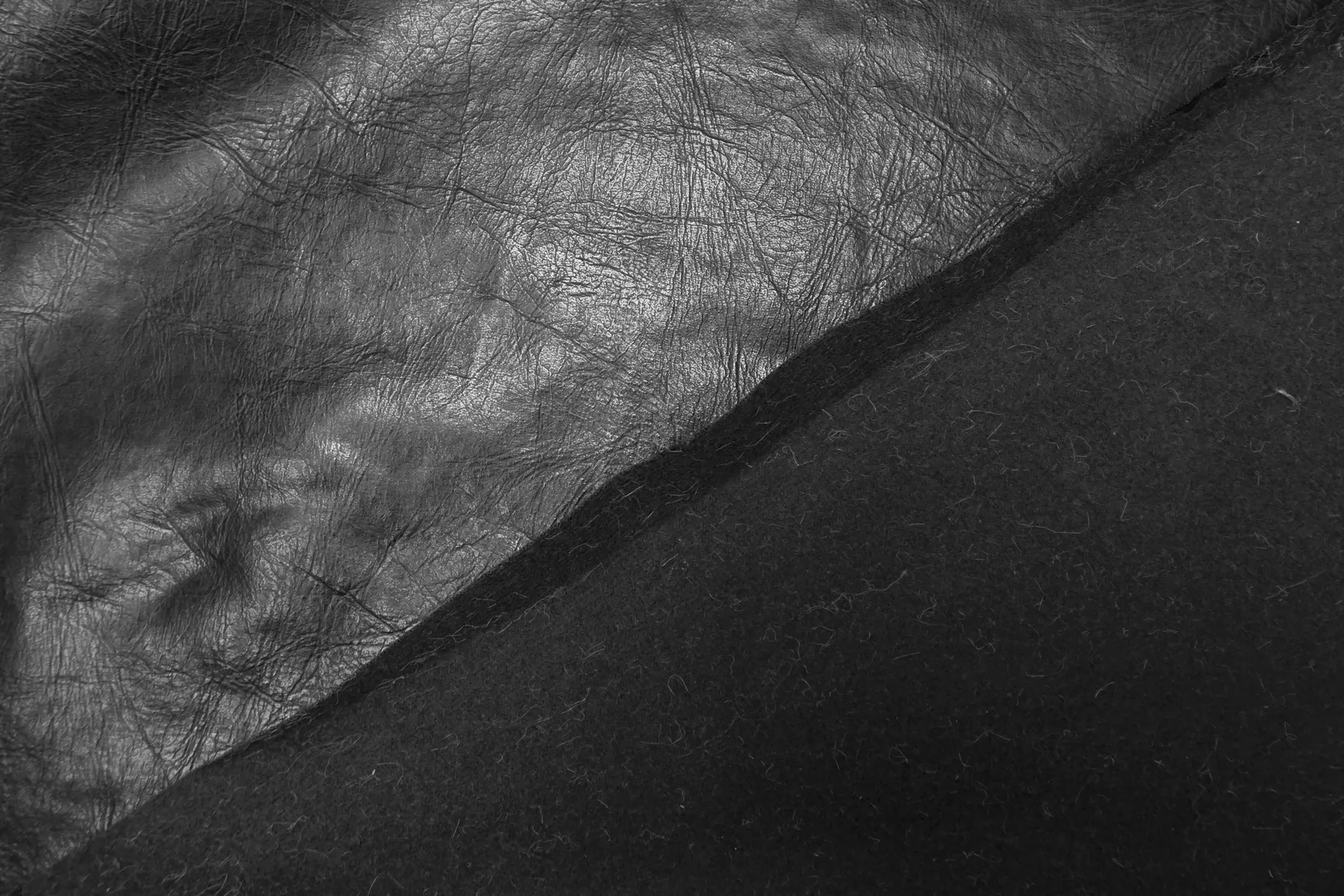 Итальянская чёрная экокожа, костюмной плотности. Не просвечивает. С тиснением, матовый отблеск. Форму держит. Можно сшить тонкую кожанку для теплой погоды, плотную рубашку, платье. Советуем изделия без сильного прилегания, т.к. эта кожа мало-эластичная.