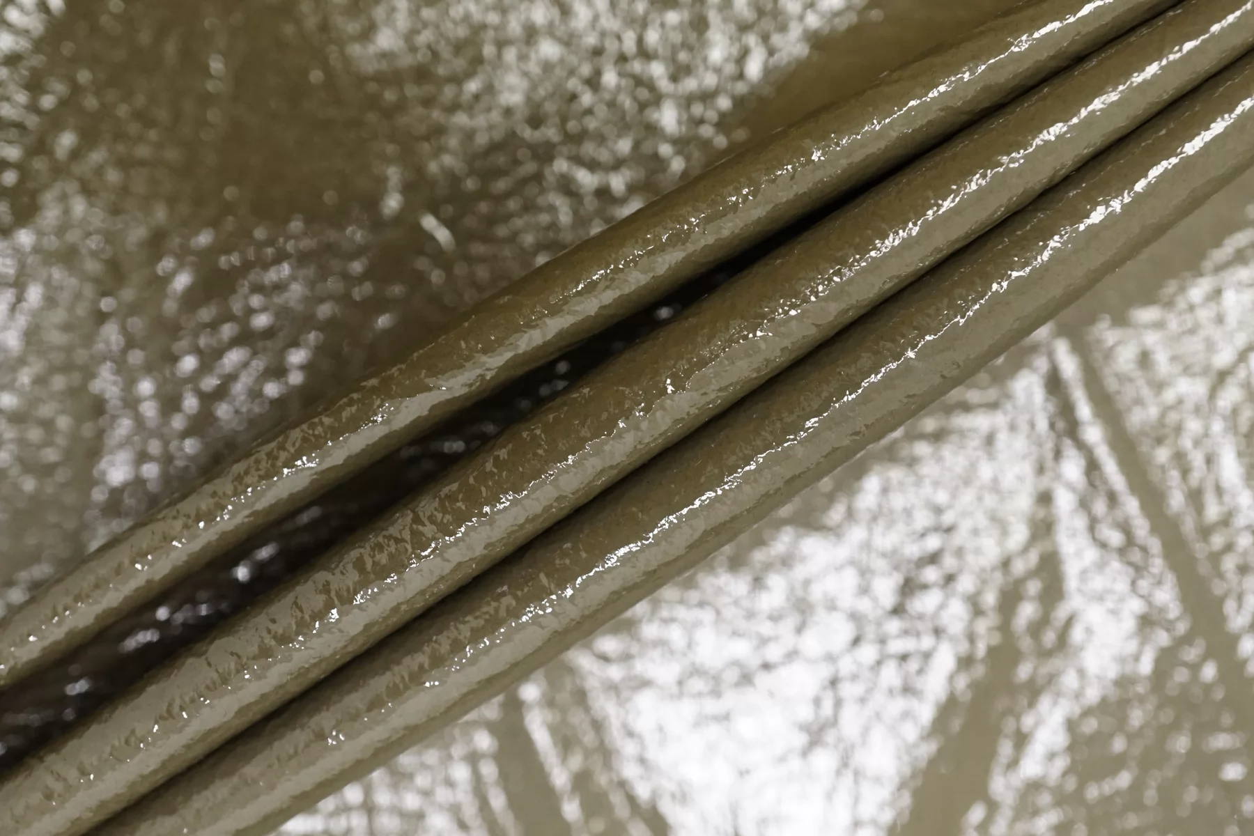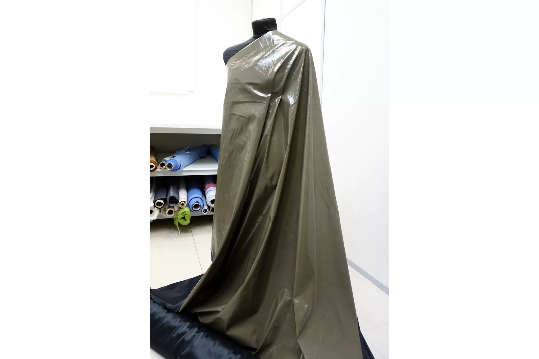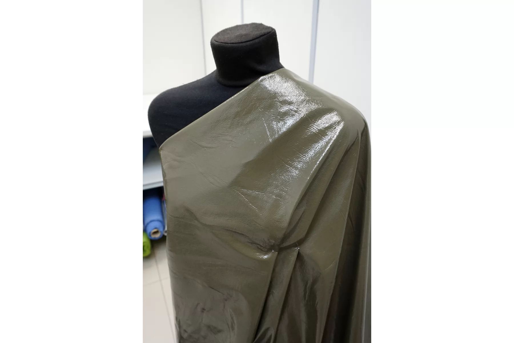 Экокожа лаке в красивом, неярком оттенке хаки, на чёрном трикотаже. Не просвечивает, умеренно тянется. Форму держит но при этом пластичная. Не промокает. Можно сшить плащ, куртку, юбку, интересную рубашку верхнего слоя.