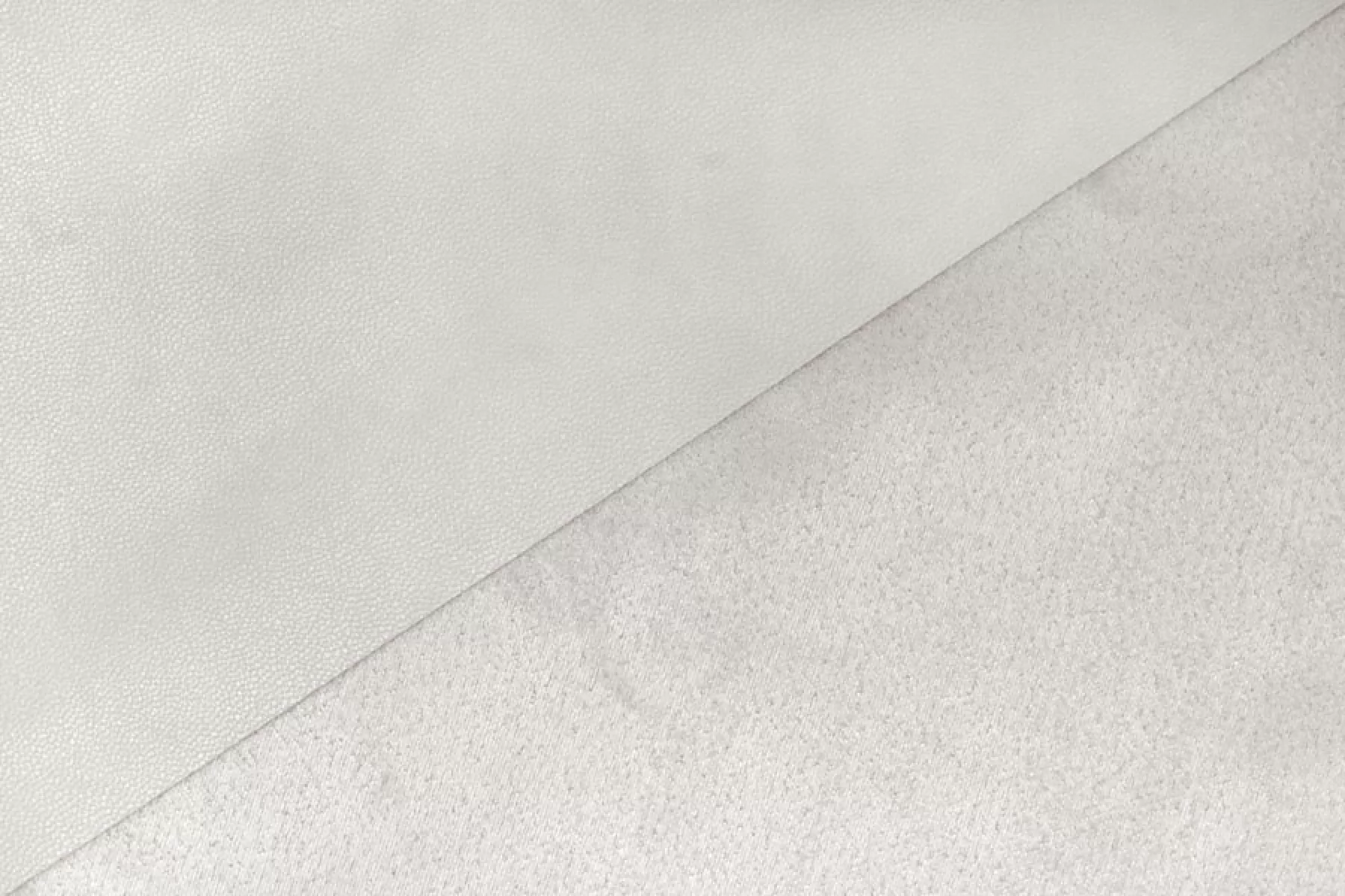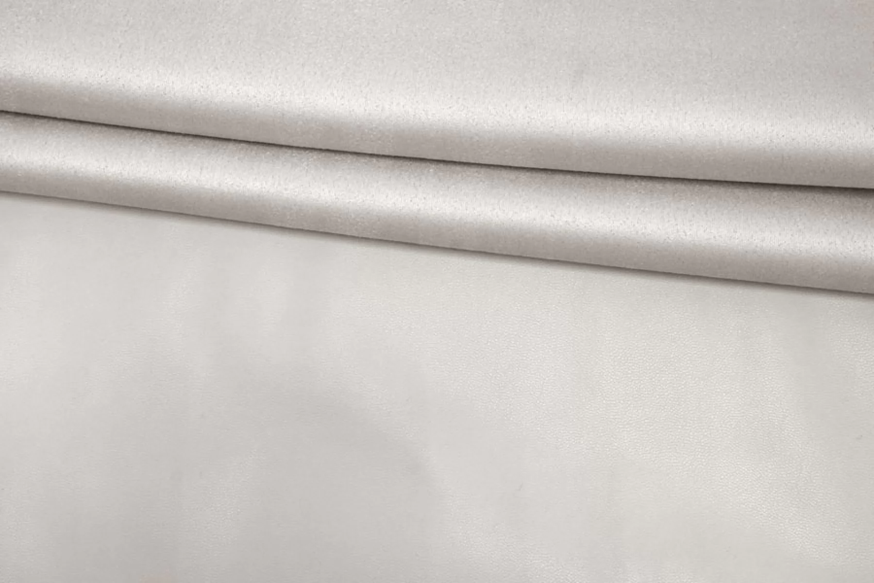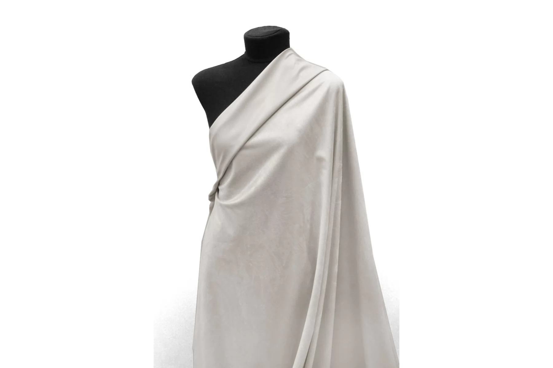 Итальянская двусторонняя экокожа с замшей, в очень красивом, светлом холодном серо-бежевом оттенке (с подтоном как у кофе с молоком). Сторона с экокожей, гладкая, скользящая, с красивым лоском и мелким тиснением, замшевая сторона с коротким ворсом. Слои склеены междый собой, не разделяются. Материал очень пластичный и эластичный. Тянется. Форму держит, а также очень красив в складках. Не просвечивает. Слегка мнется, но восстанавливается. Отличный вариант на демисезонные юбки, брюки, платья, куртки-рубашки.