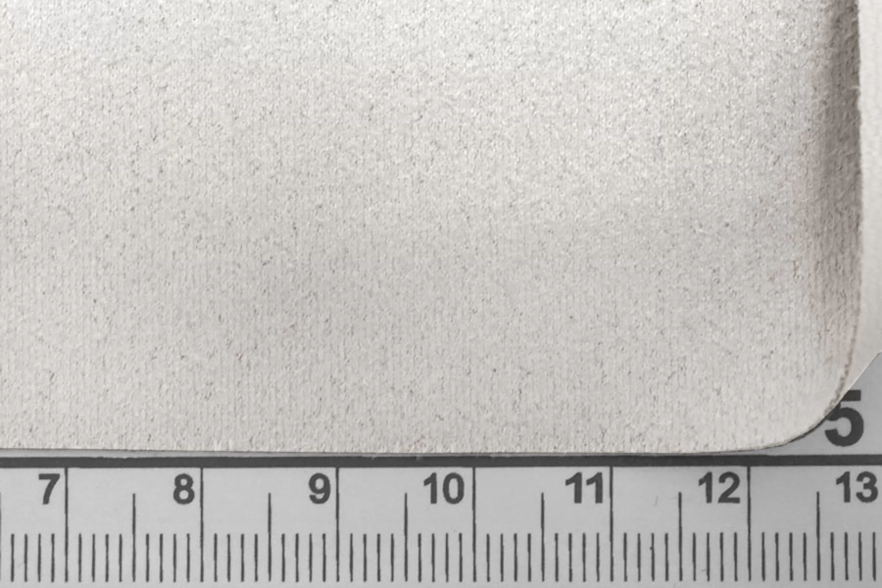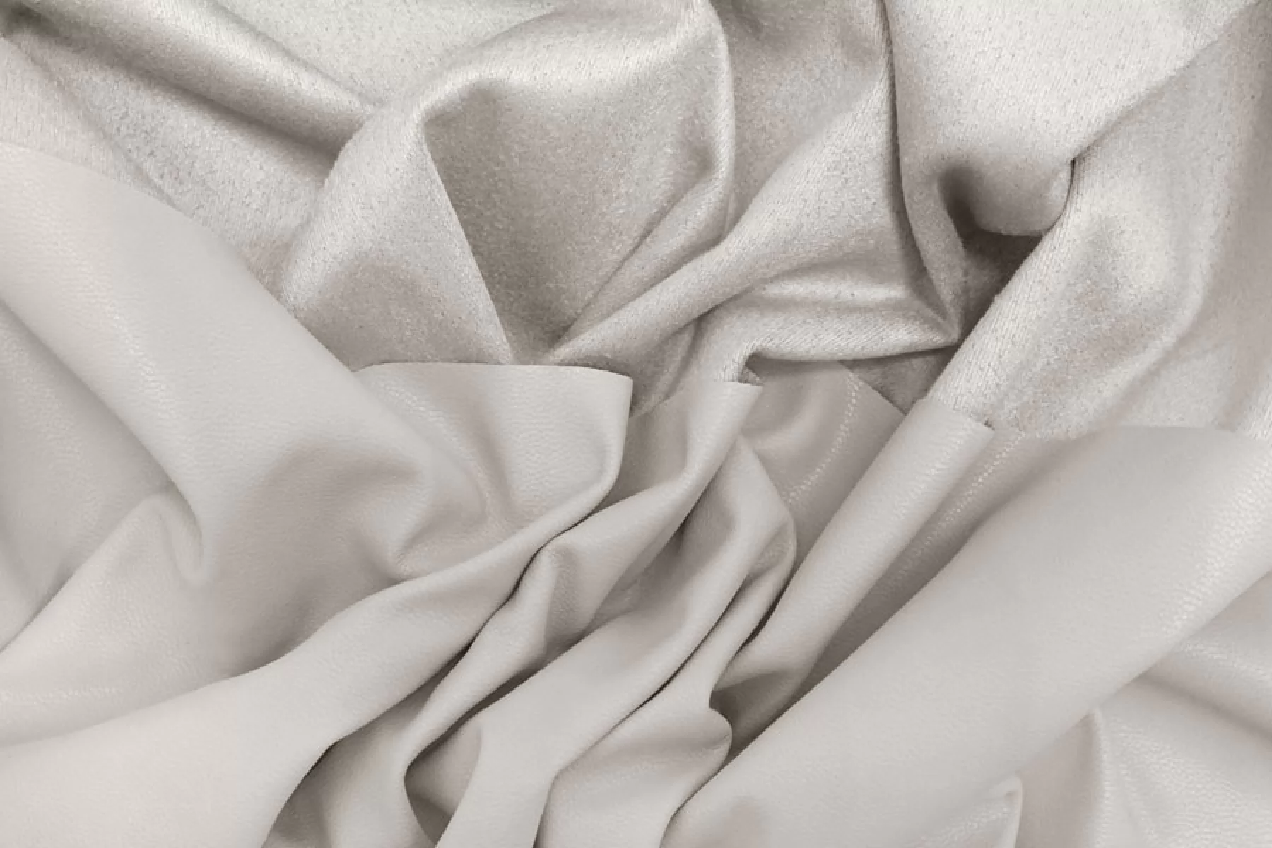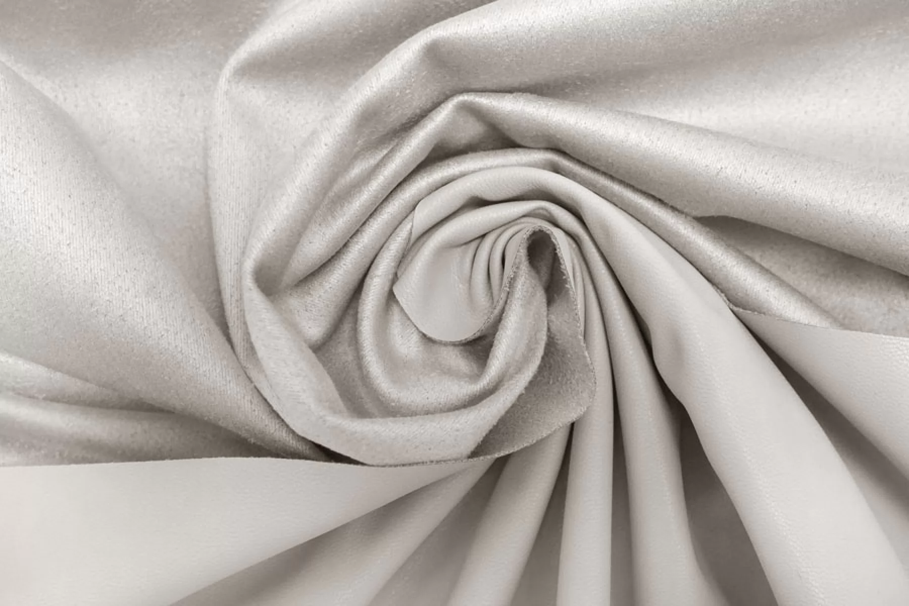 Итальянская двусторонняя экокожа с замшей, в очень красивом, светлом холодном серо-бежевом оттенке (с подтоном как у кофе с молоком). Сторона с экокожей, гладкая, скользящая, с красивым лоском и мелким тиснением, замшевая сторона с коротким ворсом. Слои склеены междый собой, не разделяются. Материал очень пластичный и эластичный. Тянется. Форму держит, а также очень красив в складках. Не просвечивает. Слегка мнется, но восстанавливается. Отличный вариант на демисезонные юбки, брюки, платья, куртки-рубашки.