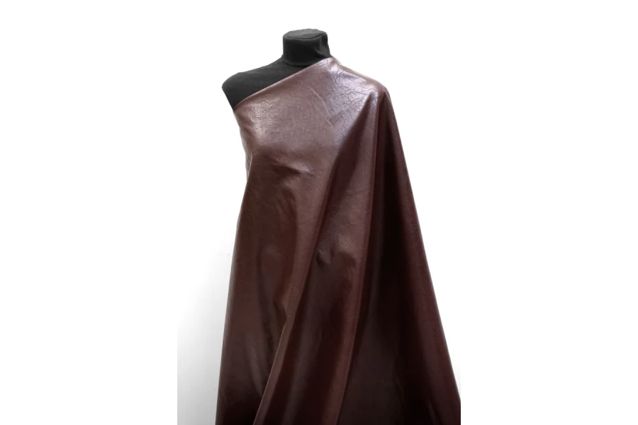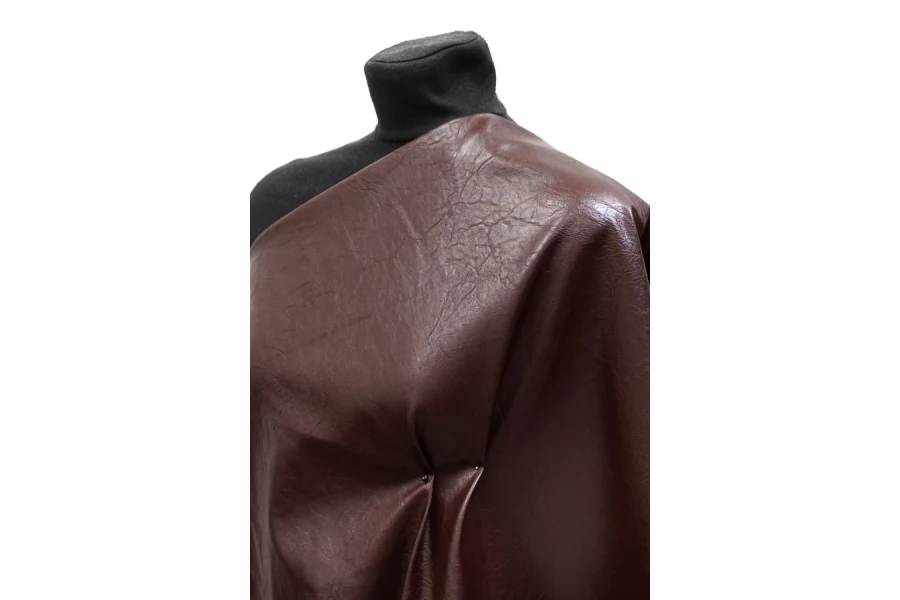 Экокожа на хлопковой основе от бренда Max Mara в насыщенном, затемнённом коричневом цвете (есть очень лёгкий бордовый подтон). Изнаночная сторона - чёрная. Не просвечивает. Средней плотности, из-за натуральной основы может слегка мяться, но восстанавливается и хорошо отпаривается. Пластичная, слегка фактурная, с мелкой "зернистостью", матовая, немного тянется за счет плетения. Мягкая, приятная как с лицевой, так и с изнаночной стороны. Неплохо держит форму. Классный вариант для весенней, осенней одежды и не только. Отлично подойдет на юбки, платья, жакеты, куртки, жилеты, шорты и другие варианты.