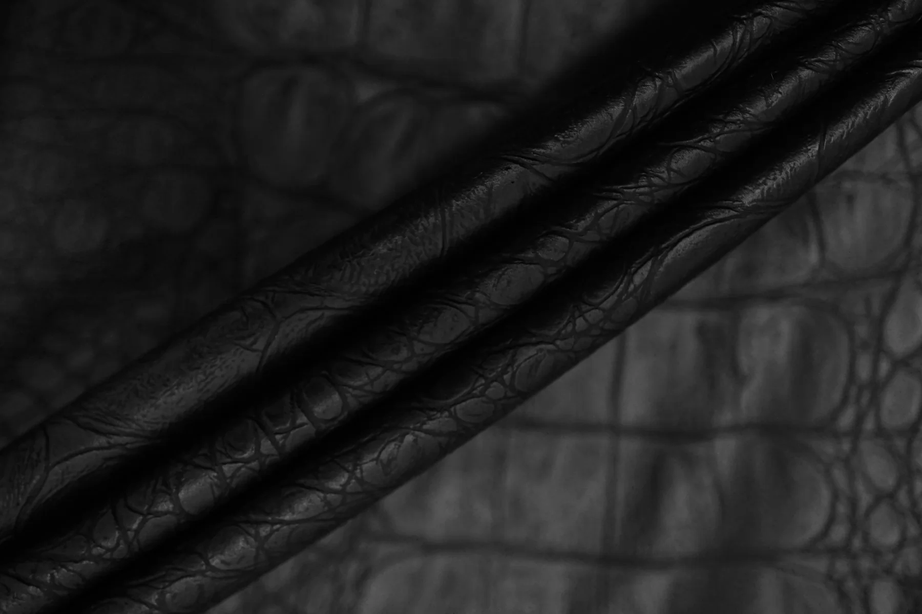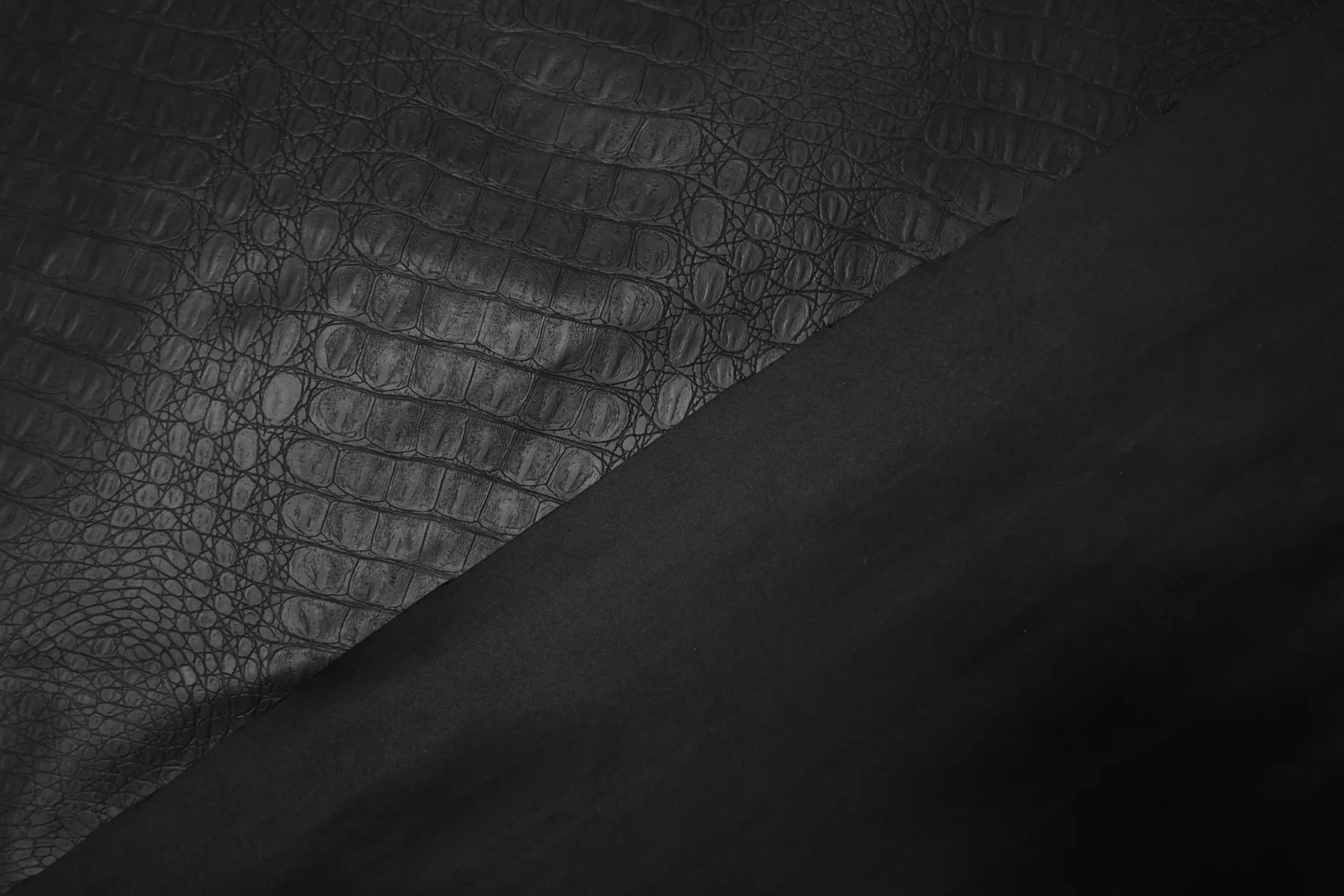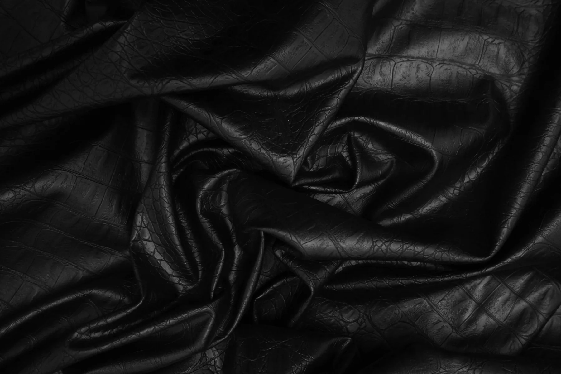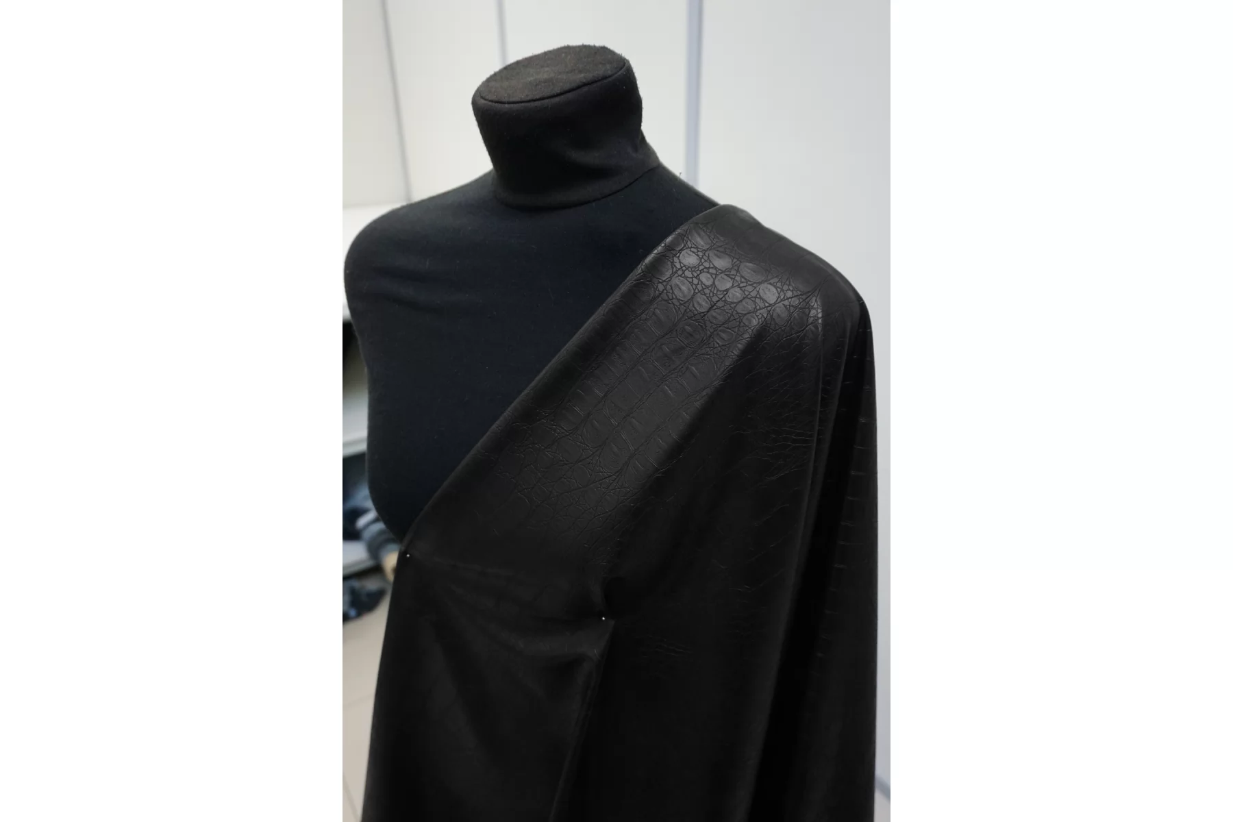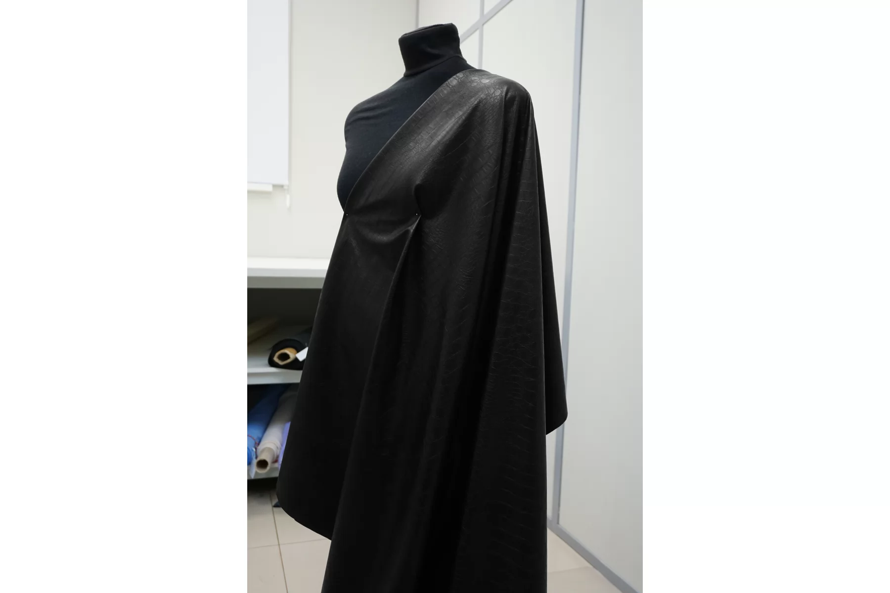 Итальянская фактурная экокожа в чёрном цвете на чёрном трикотаже. Приятная тактильно, тянется, не просвечивает, пластичная. Подойдет для пошива платья, брюк, юбки, куртки, плаща, пальто-рубашки.