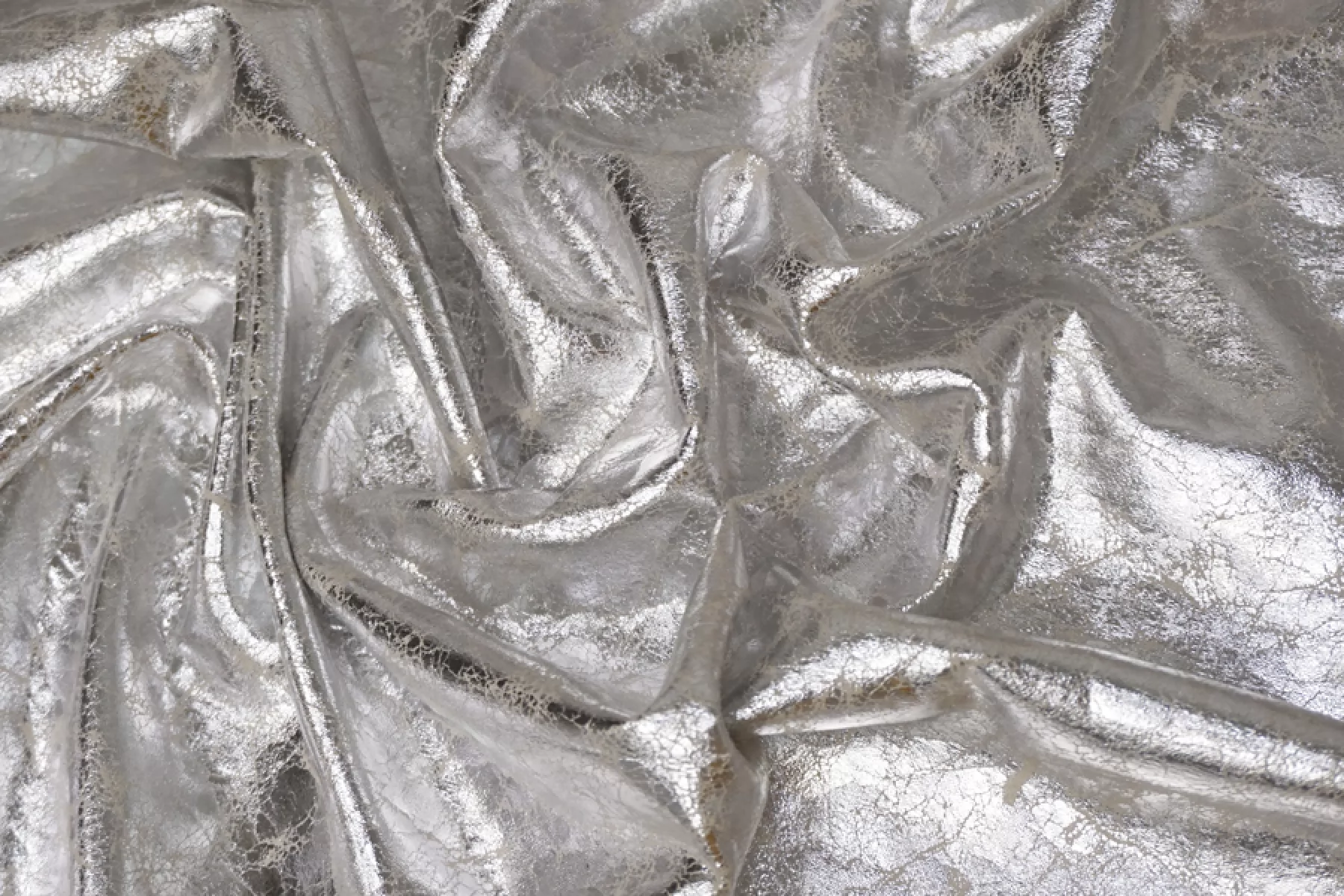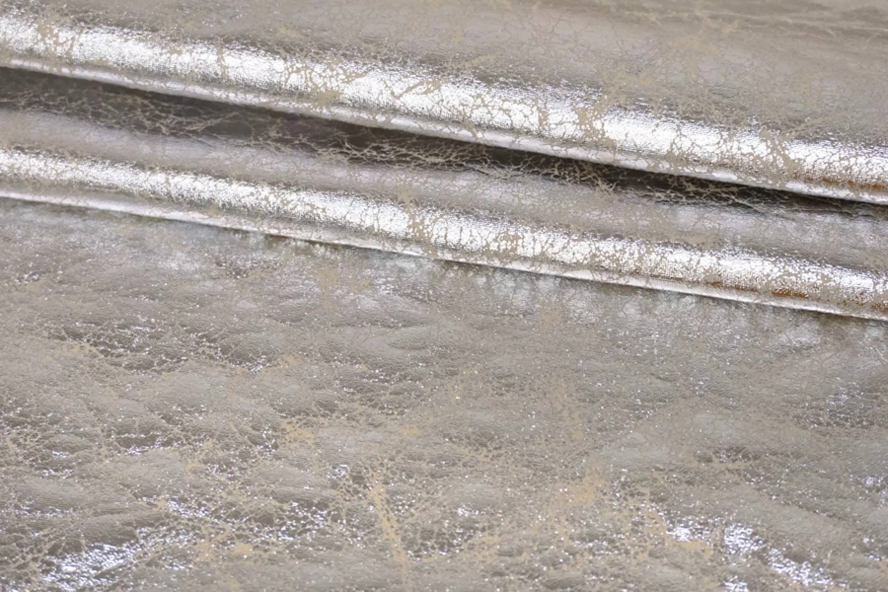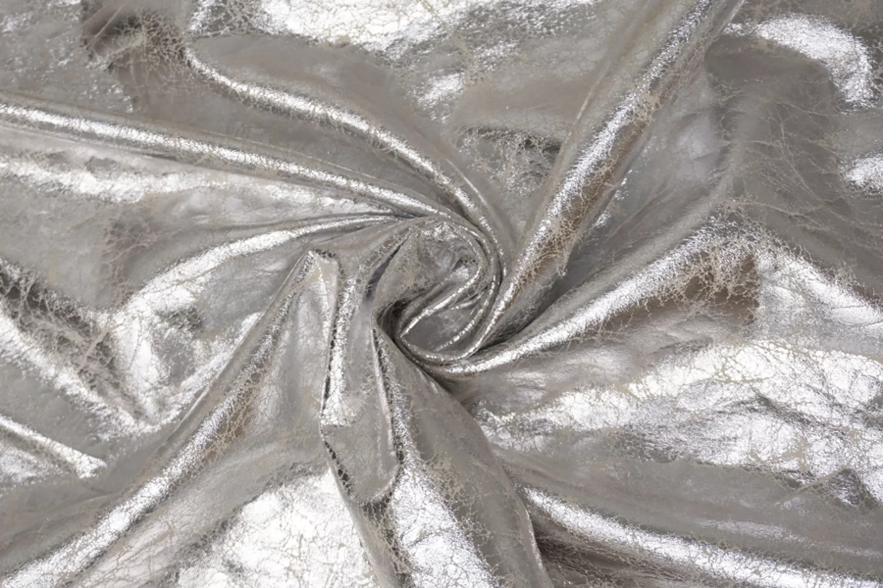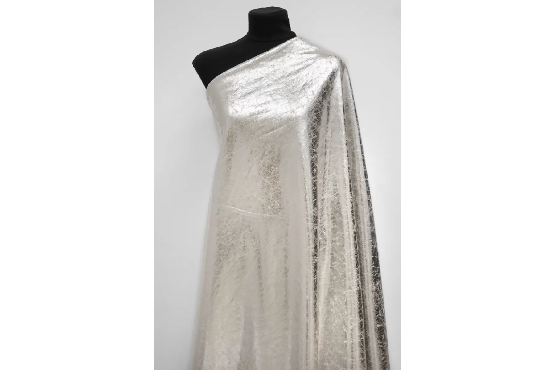 Классная итальянская экокожа на трикотажной с серебряным накатом с эффектом кракелюр (потрескивания), основа бежевого цвета. Гладкая и мягкая наоущпь. Не просвечивает. Блестящая.. Форму немного держит. Шикарно тянется. Можно сшить тонкую кожанку для теплой погоды, плотную рубашку, платье, сарафан, шорты, легинсы.