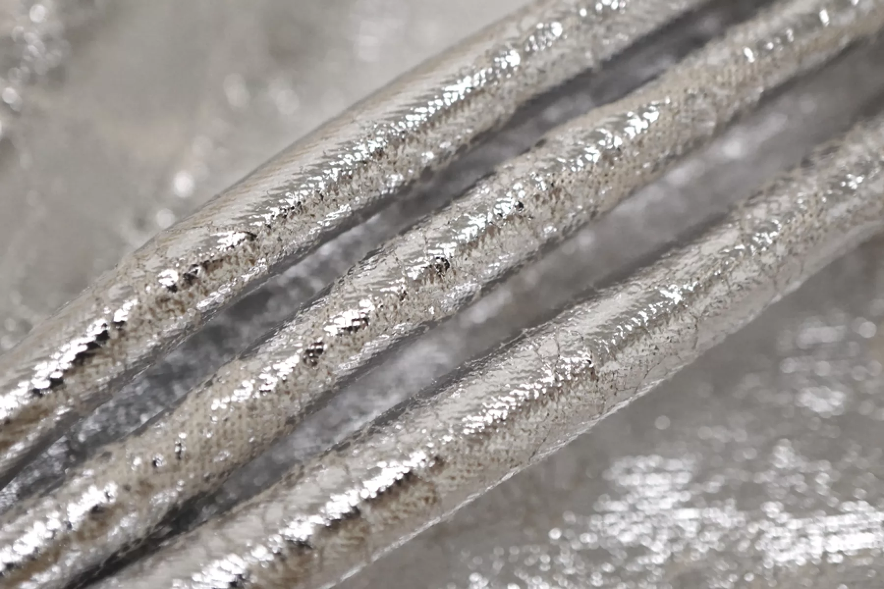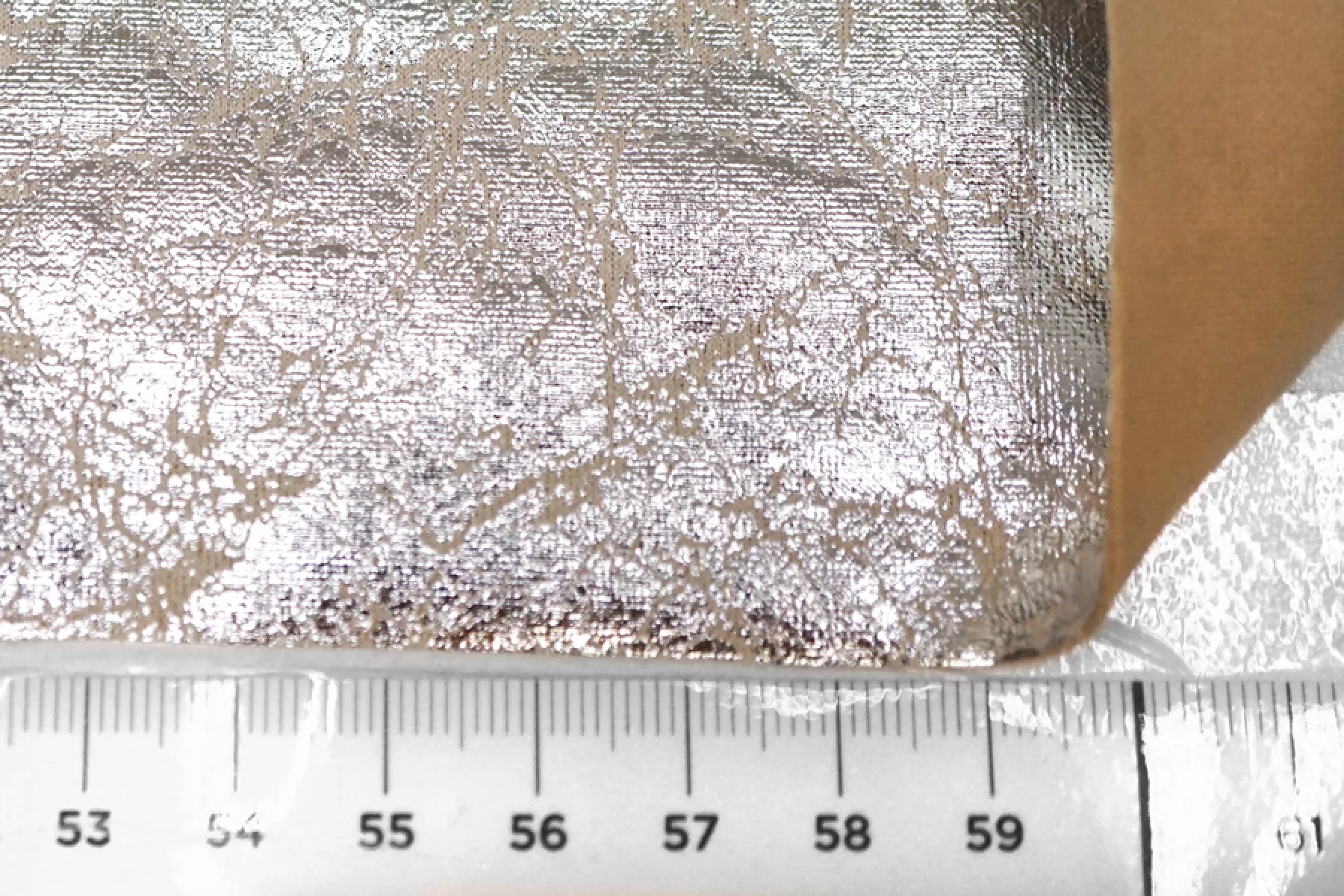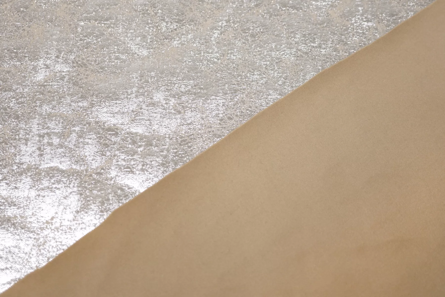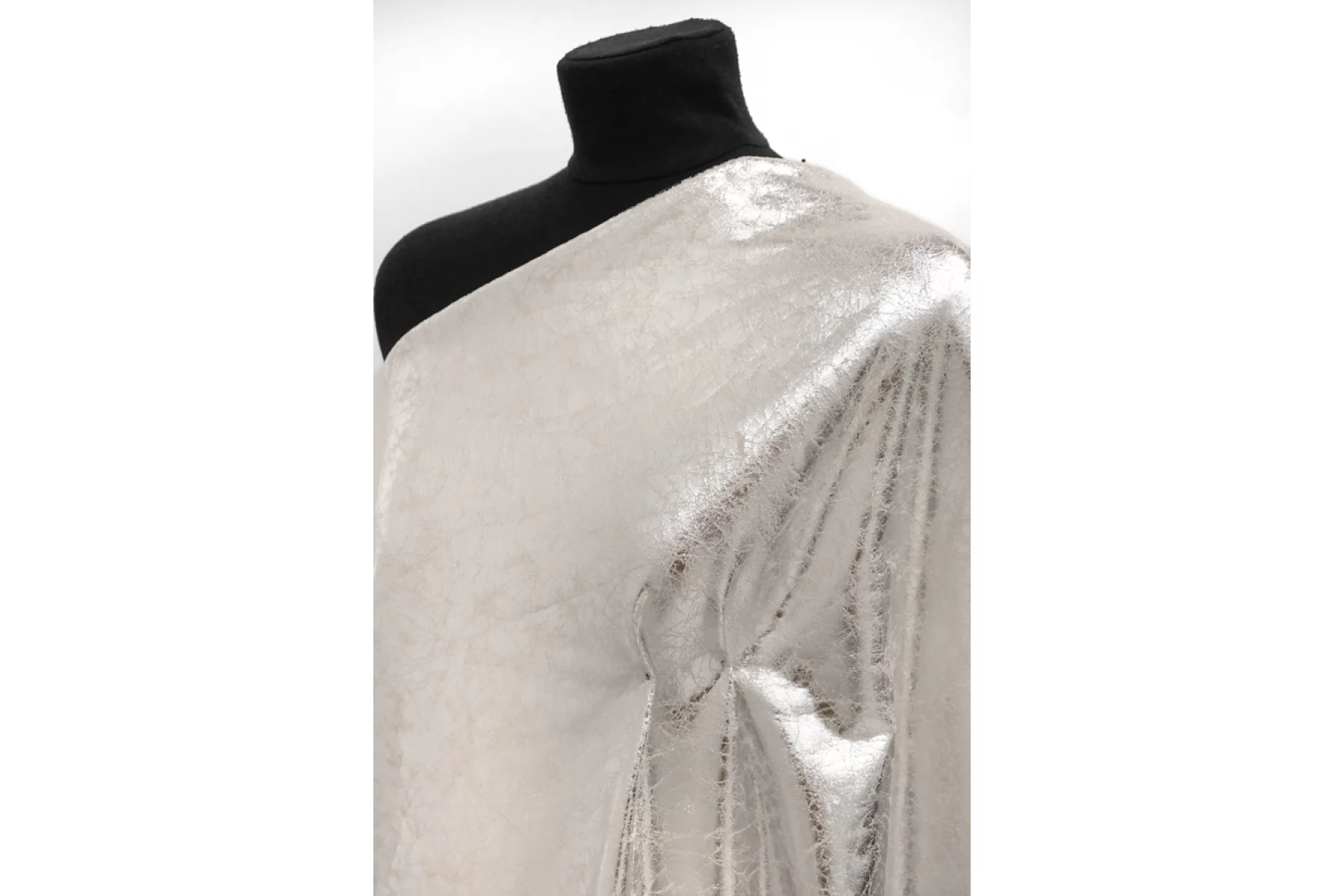 Классная итальянская экокожа на трикотажной с серебряным накатом с эффектом кракелюр (потрескивания), основа бежевого цвета. Гладкая и мягкая наоущпь. Не просвечивает. Блестящая.. Форму немного держит. Шикарно тянется. Можно сшить тонкую кожанку для теплой погоды, плотную рубашку, платье, сарафан, шорты, легинсы.