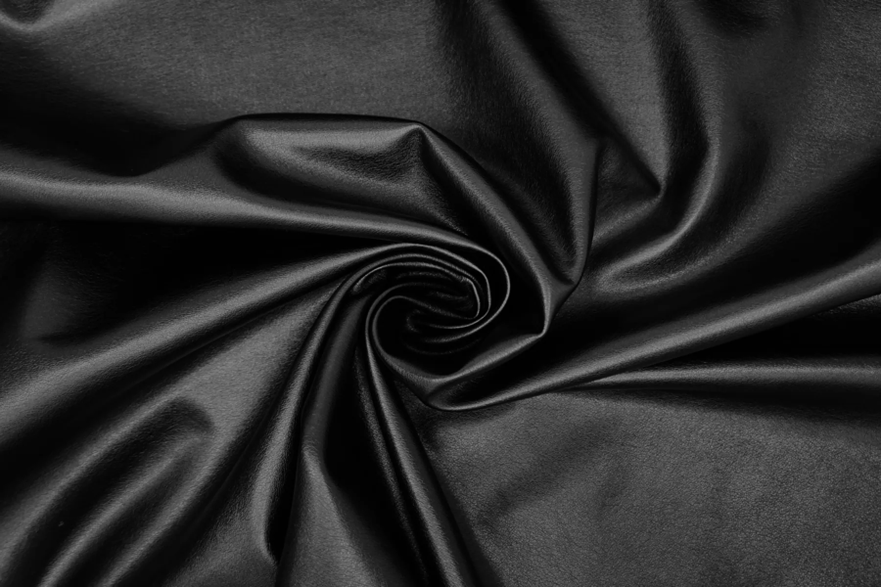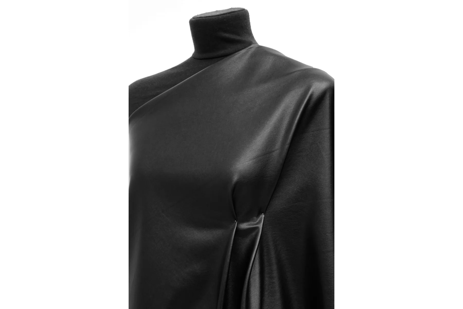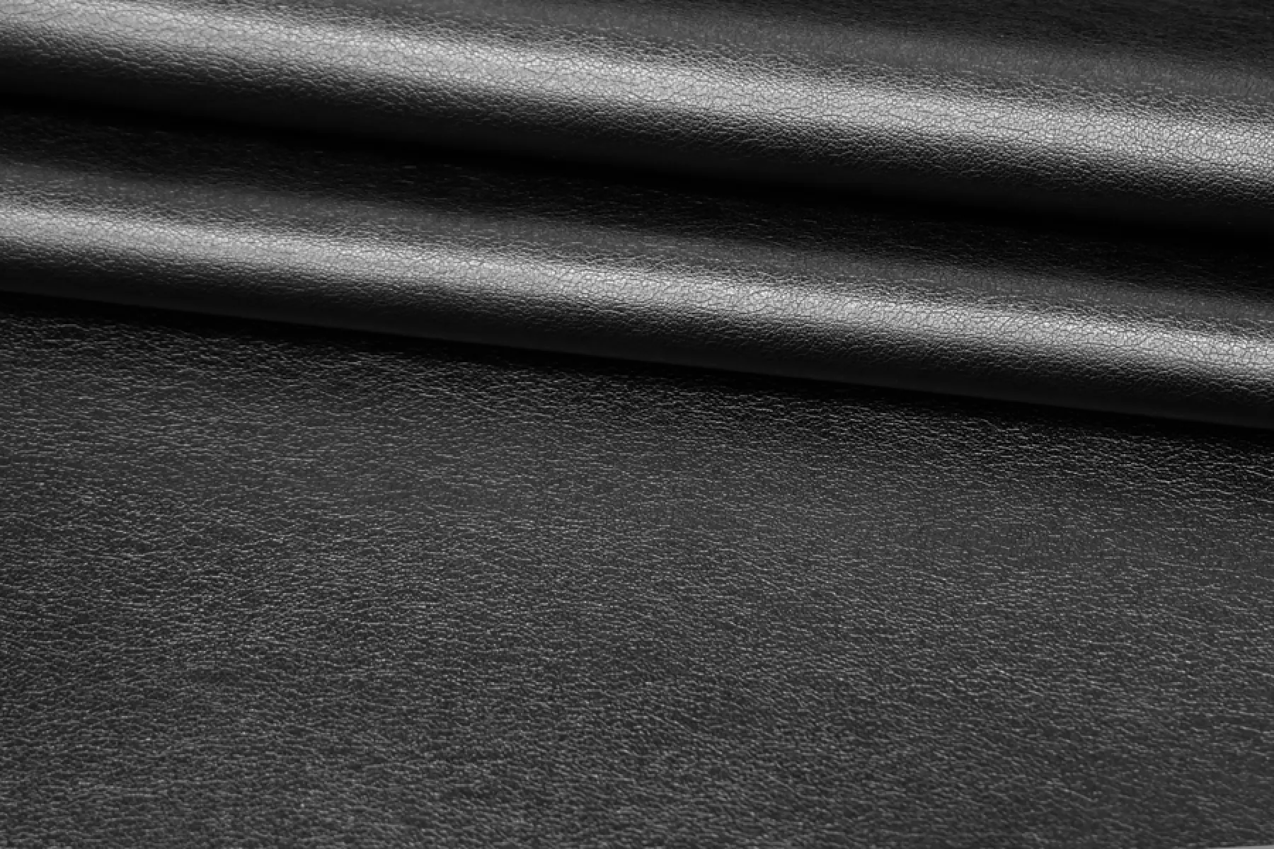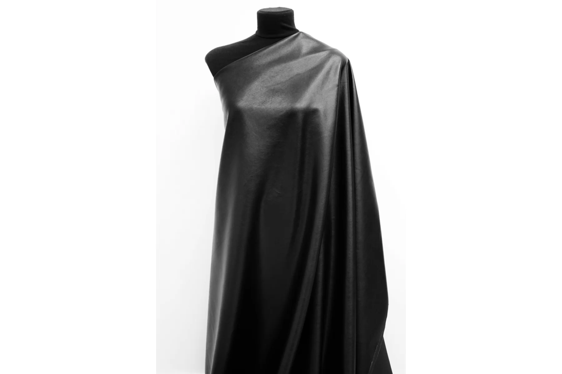 Итальянская экокожа на вискозной основе в черном цвете. Не просвечивает. Тонкая, из-за натуральной основы может мяться, но хорошо отпаривается. Пластичная, гладкая, немного тянется. Можно сшить тонкую кожанку для теплой погоды, плотную рубашку, платье, сарафан, шорты, брюк, мягкий пиджак.