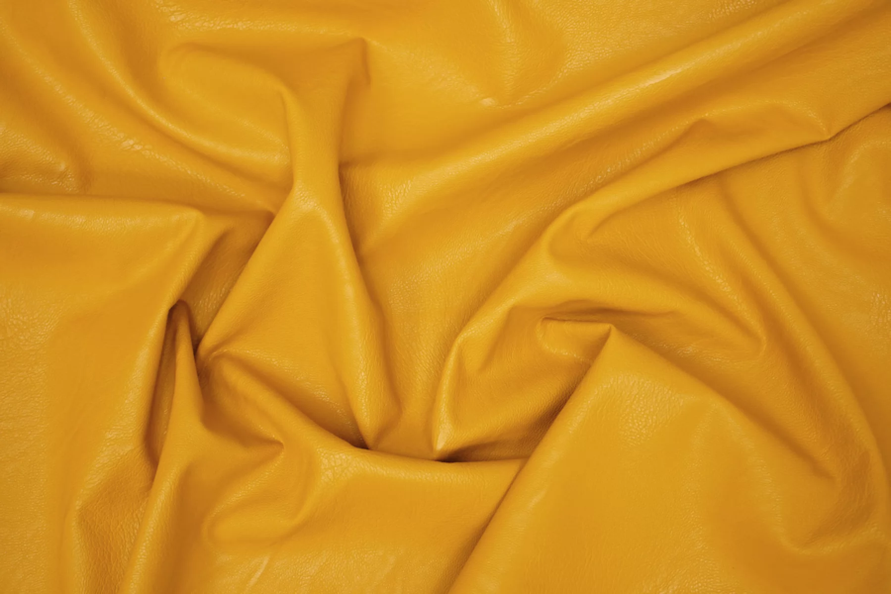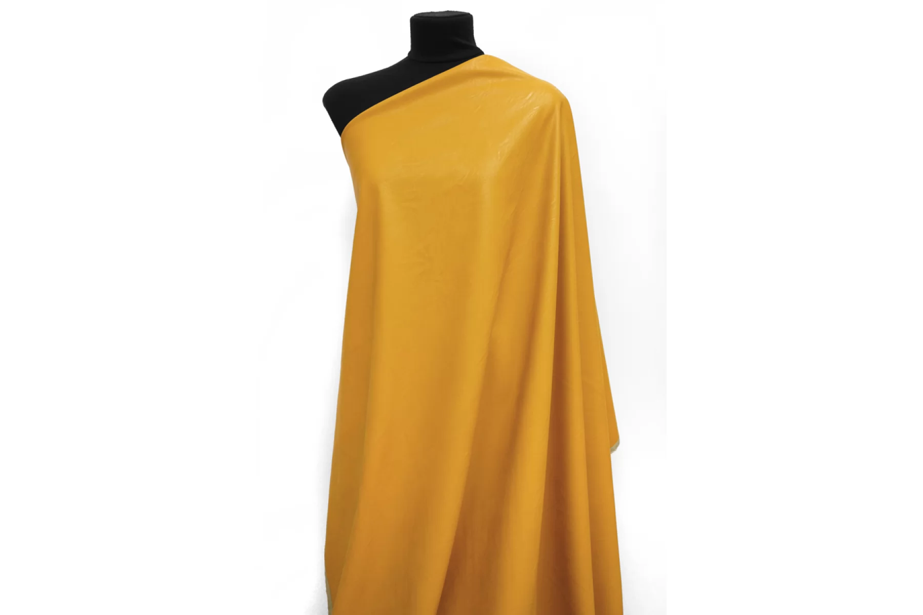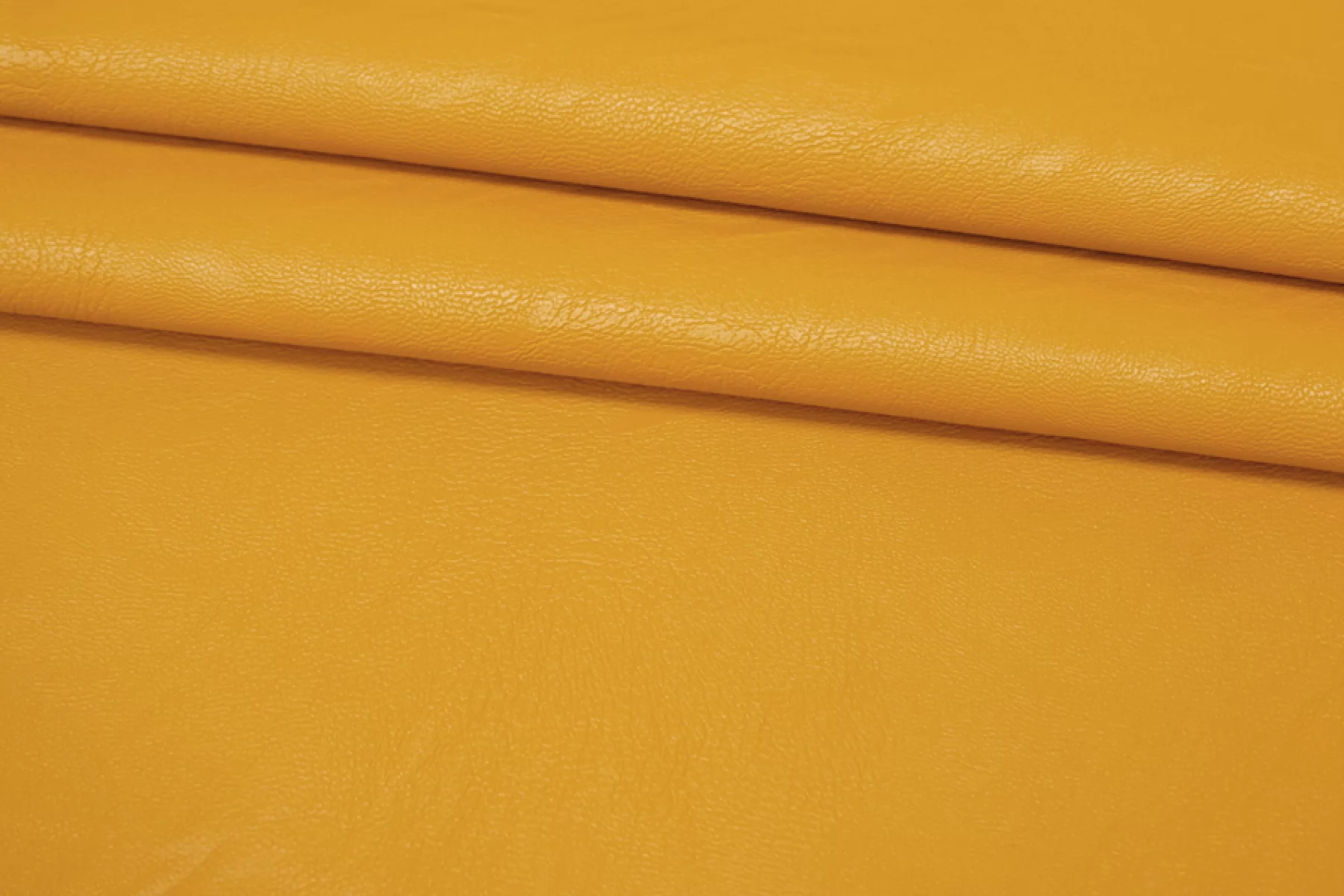 Итальянская экокожа на вискозной основе в насыщенном горчичном оттенке. Не просвечивает. Средней плотности, из-за натуральной основы может мяться, но хорошо отпаривается. Пластичная, гладкая, немного тянется. Можно сшить тонкую кожанку для теплой погоды, плотную рубашку, платье, сарафан, шорты, брюк, мягкий пиджак.