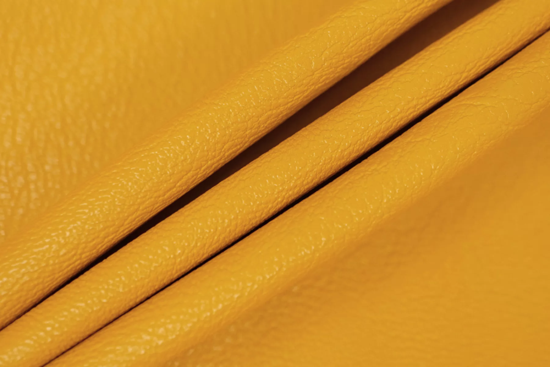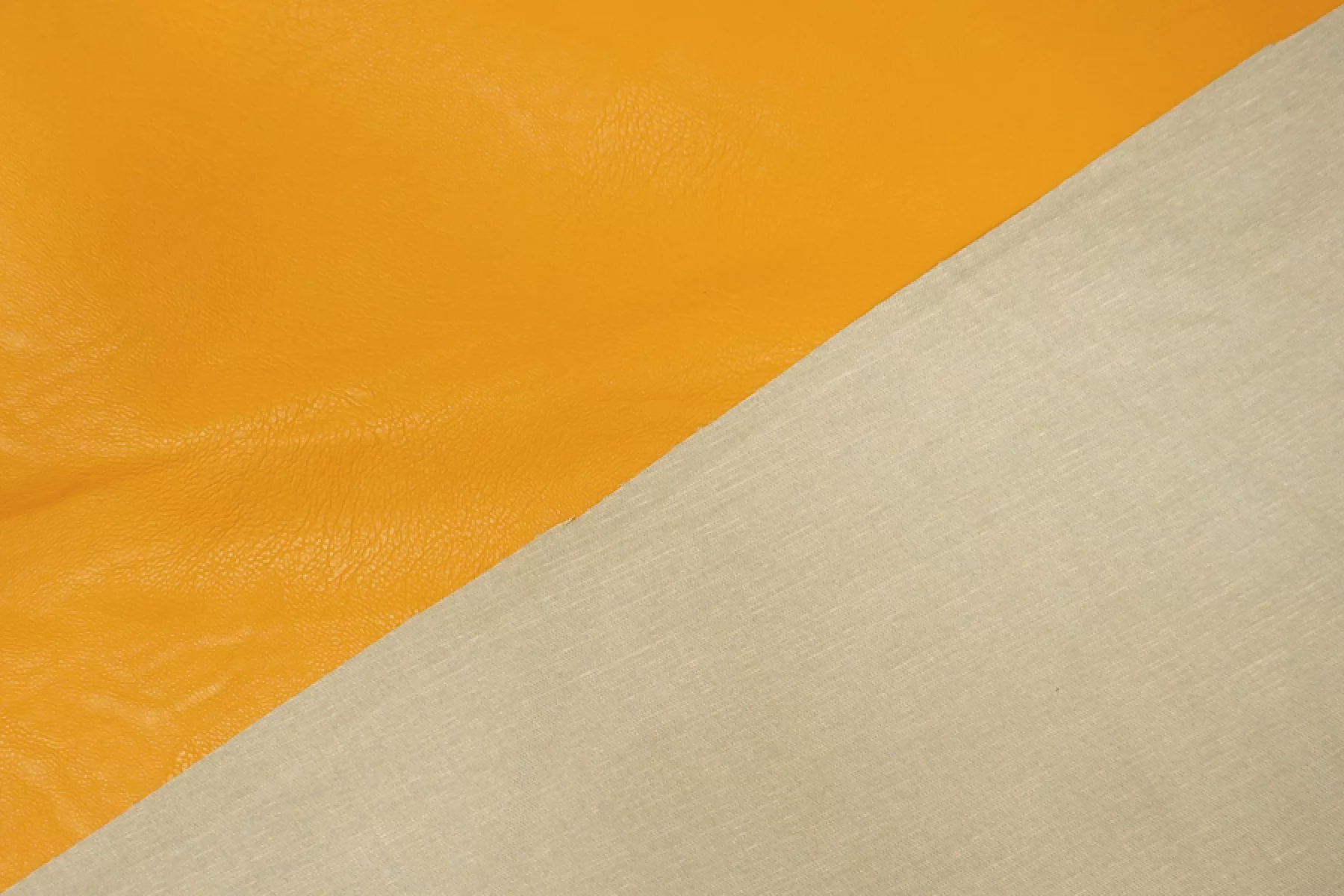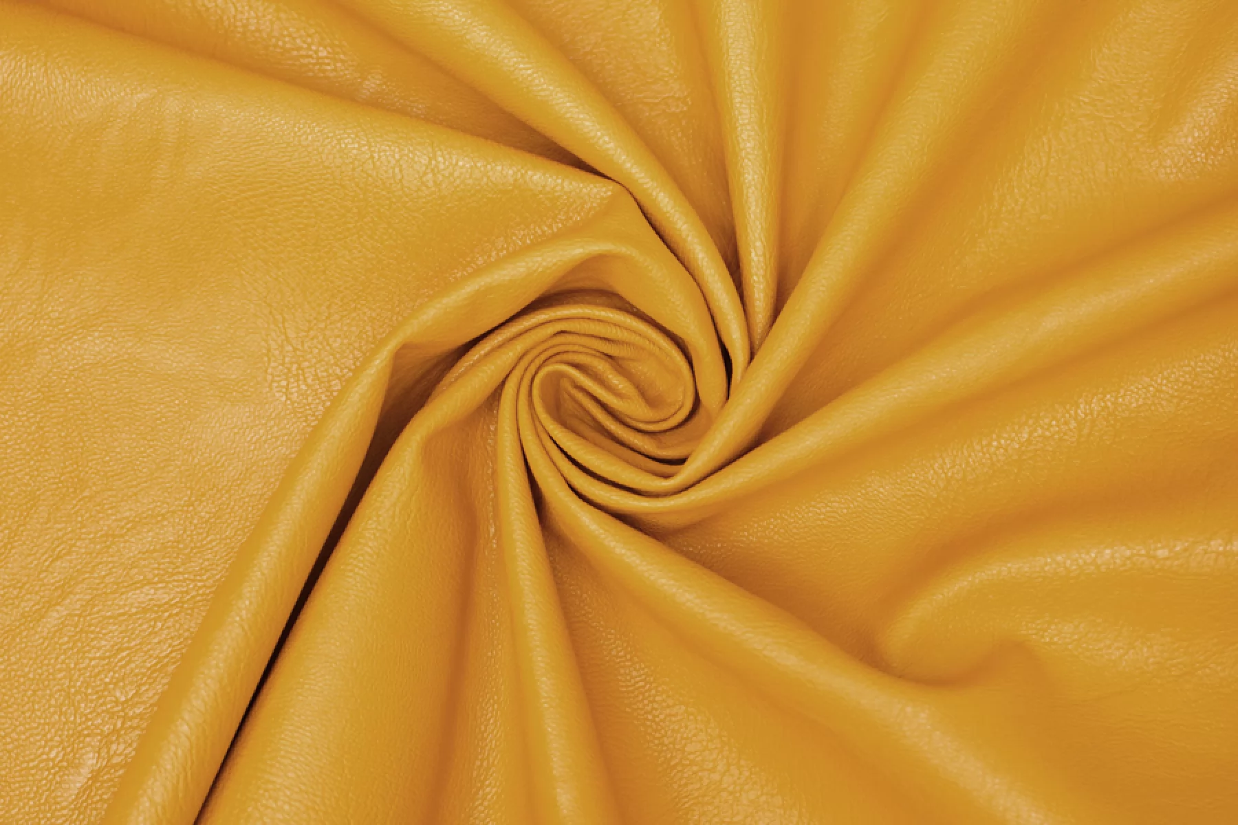 Итальянская экокожа на вискозной основе в насыщенном горчичном оттенке. Не просвечивает. Средней плотности, из-за натуральной основы может мяться, но хорошо отпаривается. Пластичная, гладкая, немного тянется. Можно сшить тонкую кожанку для теплой погоды, плотную рубашку, платье, сарафан, шорты, брюк, мягкий пиджак.