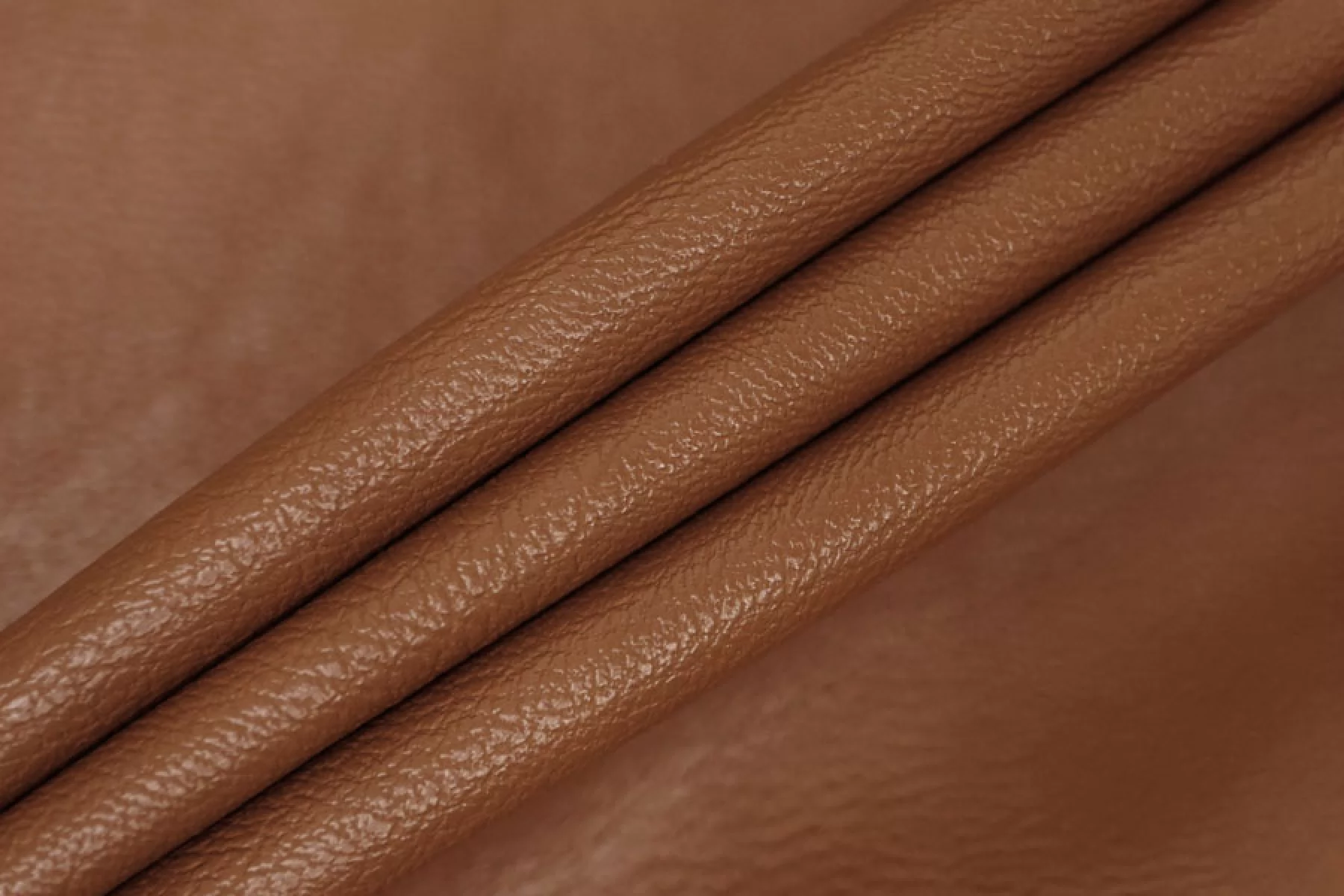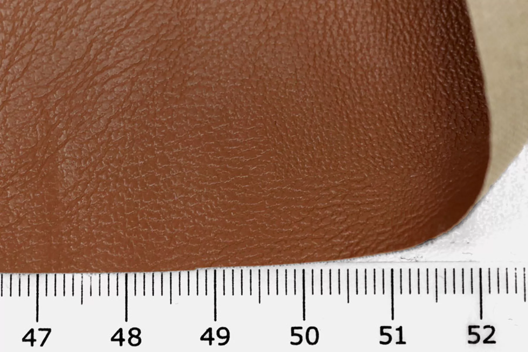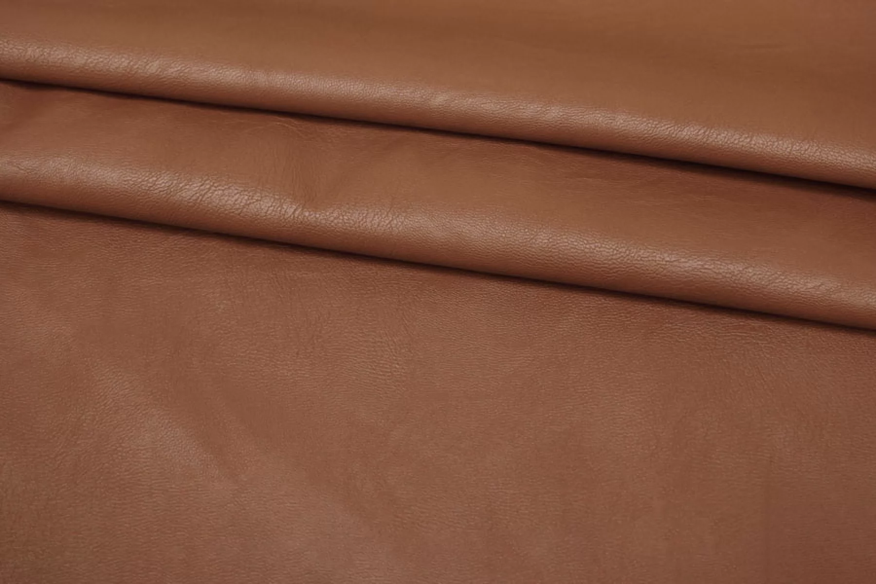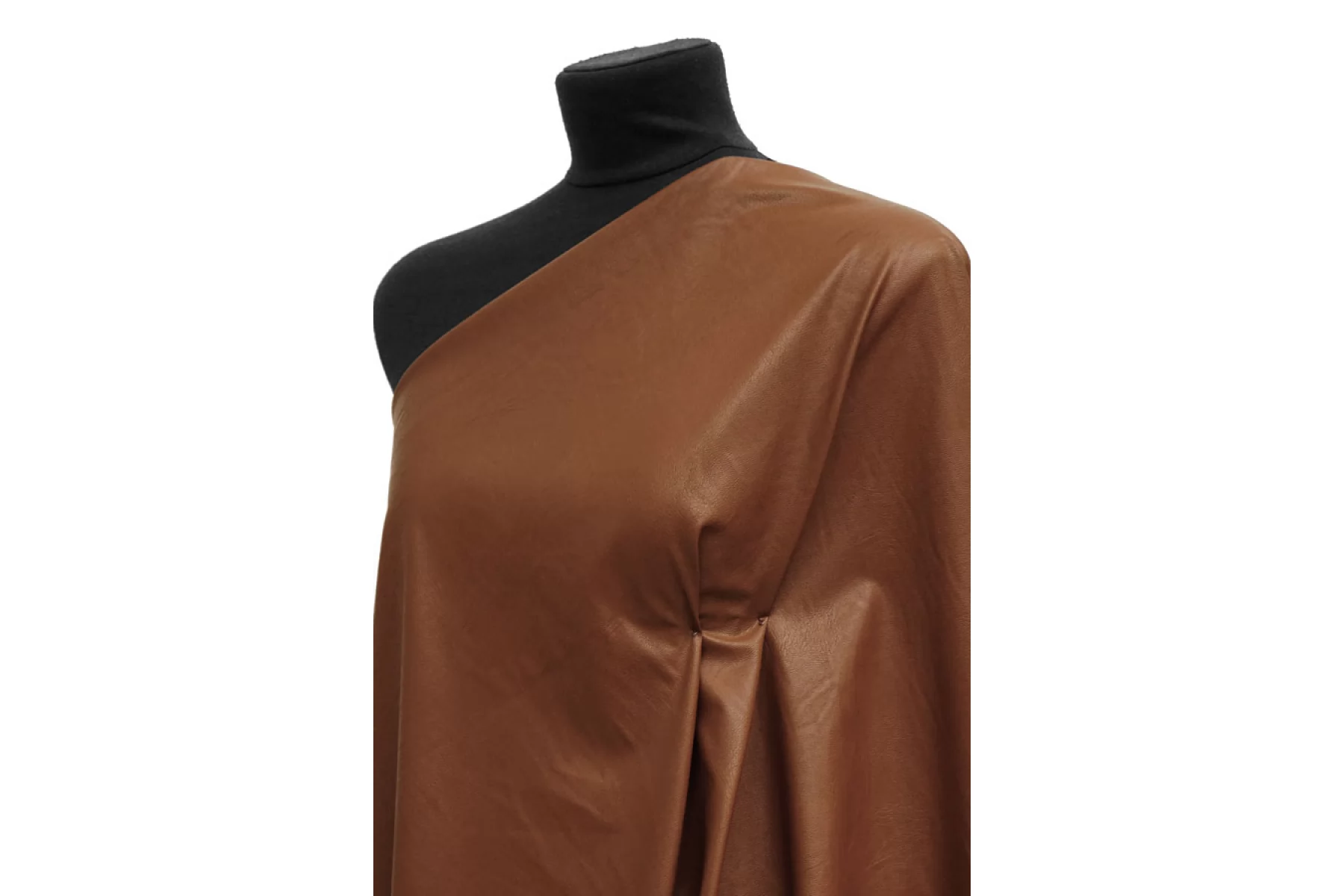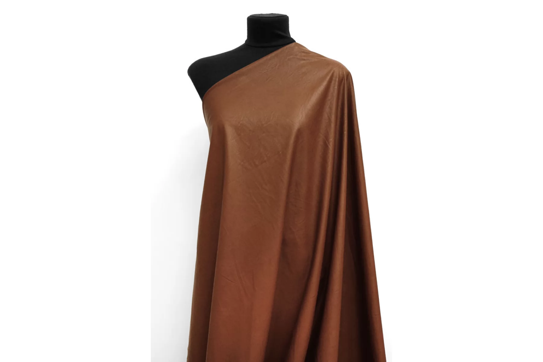 Итальянская экокожа на вискозной основе в коричневом цвете. Не просвечивает. Тонкая, из-за натуральной основы может мяться, но хорошо отпаривается. Пластичная, гладкая, немного тянется. Можно сшить тонкую кожанку для теплой погоды, плотную рубашку, платье, сарафан, шорты, брюк, мягкий пиджак.