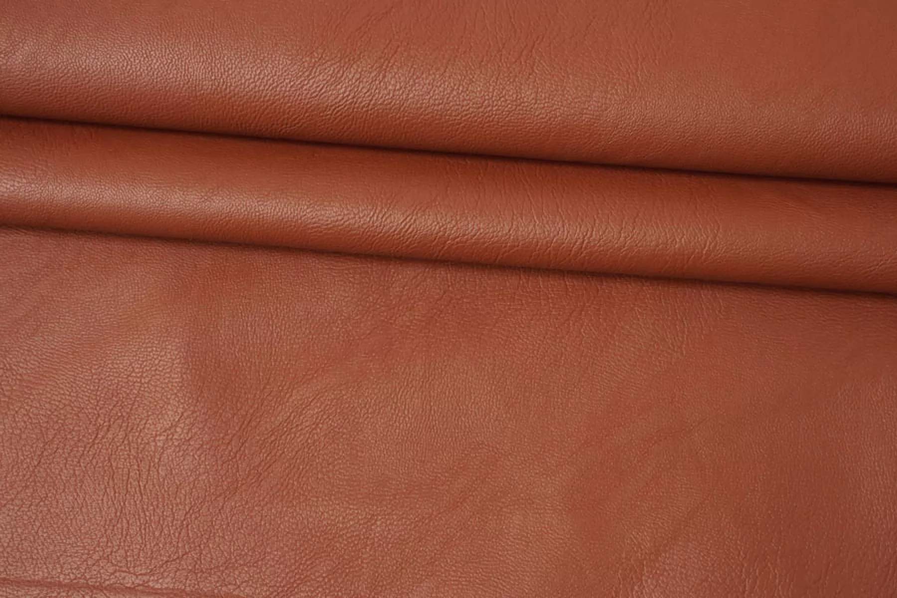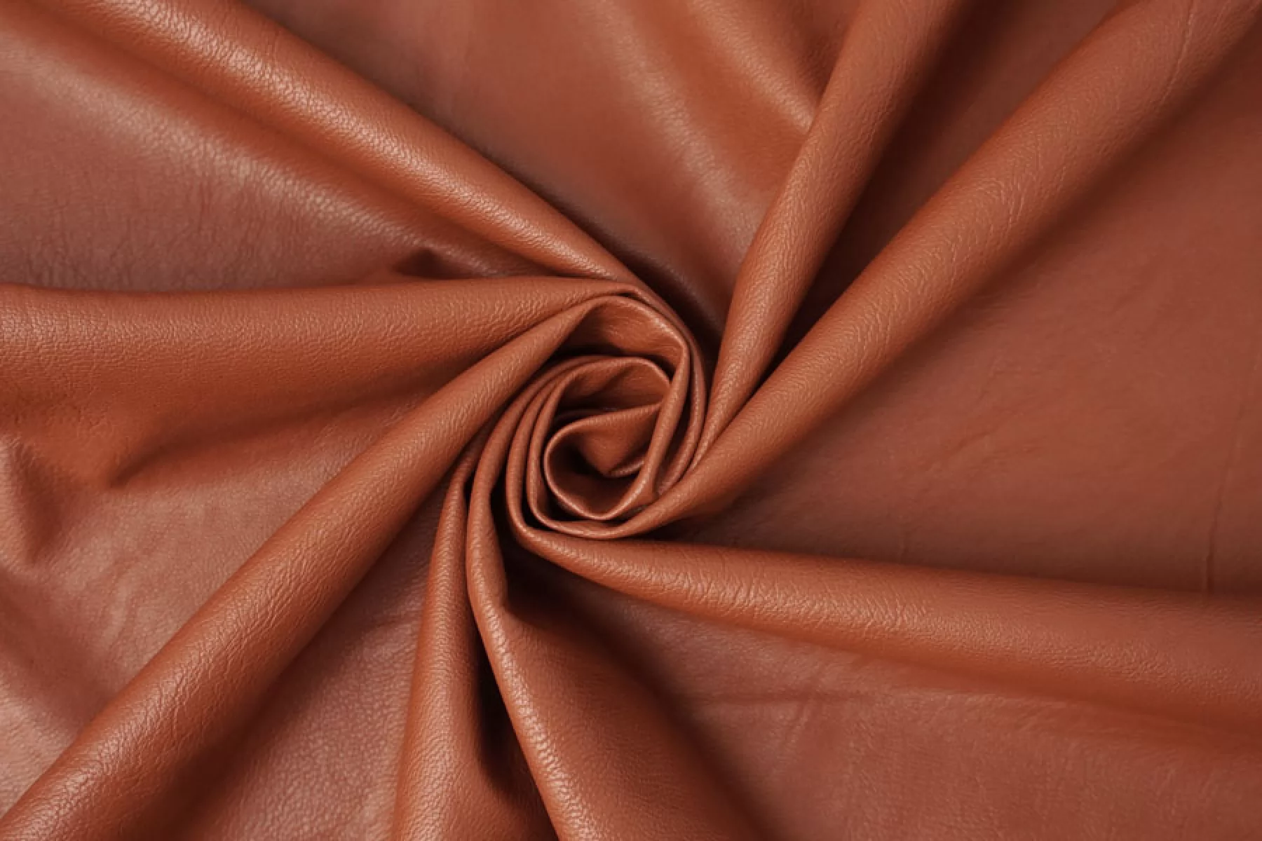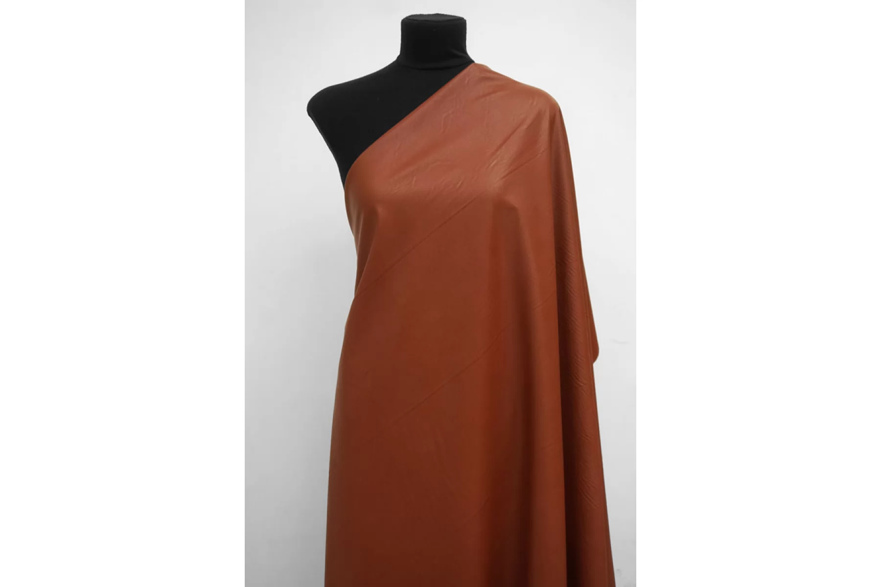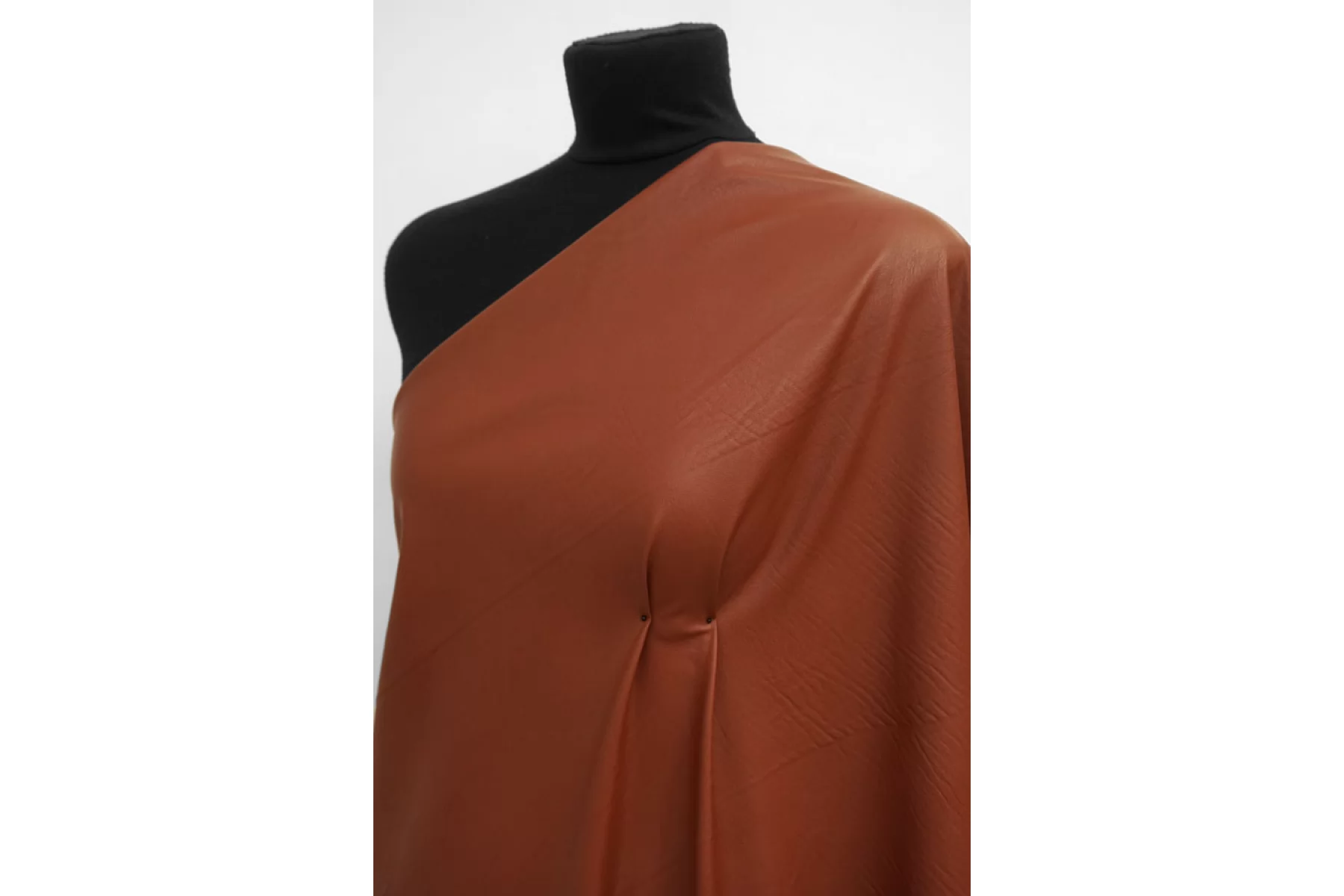 Экокожа на вискозной основе коричнево-терракотового оттенка. Не просвечивает. Достаточно тонкая и мягкая, очень приятная тактильно, из-за натуральной основы может слегка мяться, но хорошо отпаривается. Пластичная, гладкая, с мелкой "зернистостью", матовая, немного тянется за счет плетения. Красива в складке. Отличный вариант для весенней, осенней одежды и не только. Отлично подойдет на юбки, платья, жакеты, шорты и другие варианты!