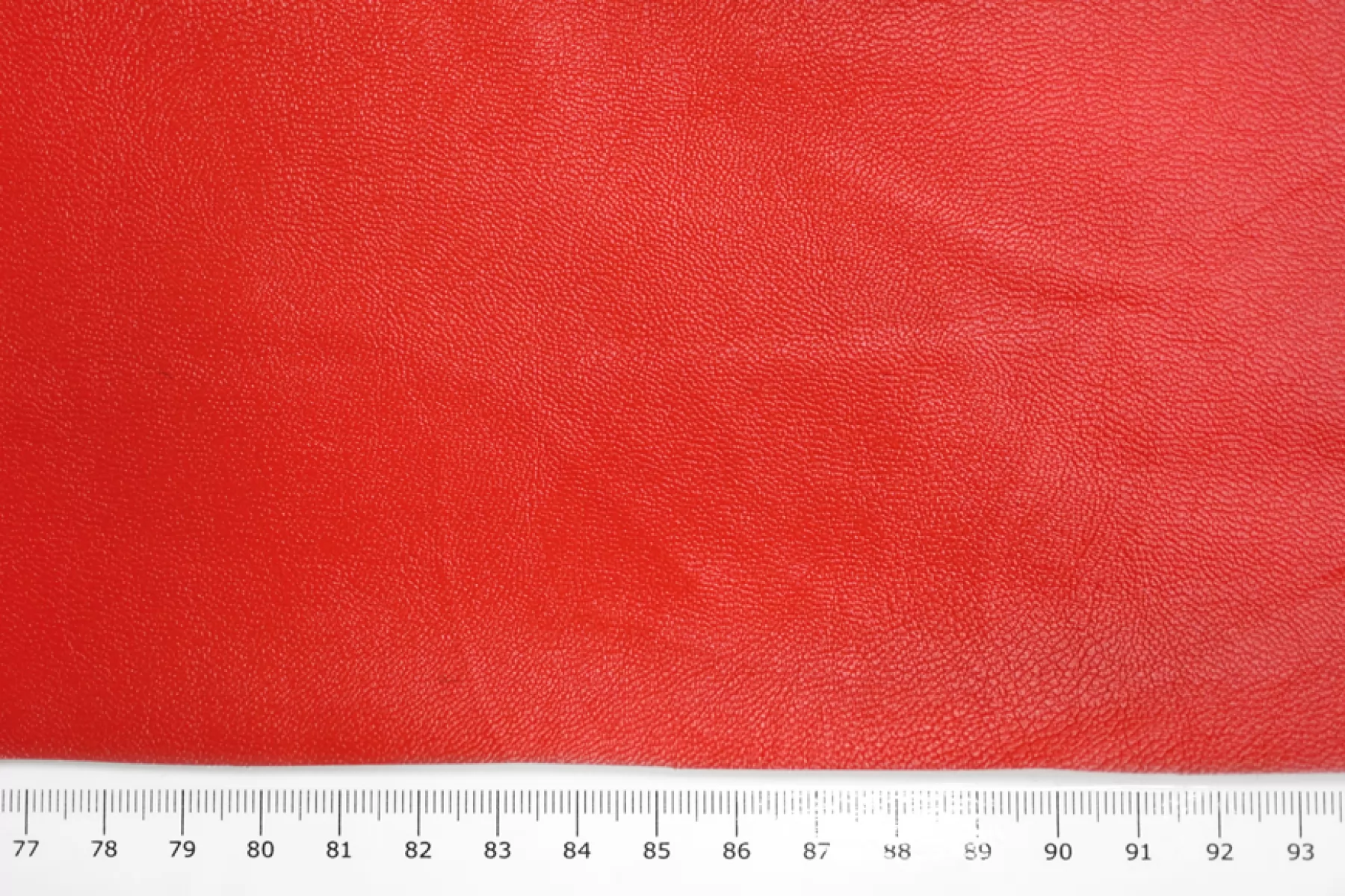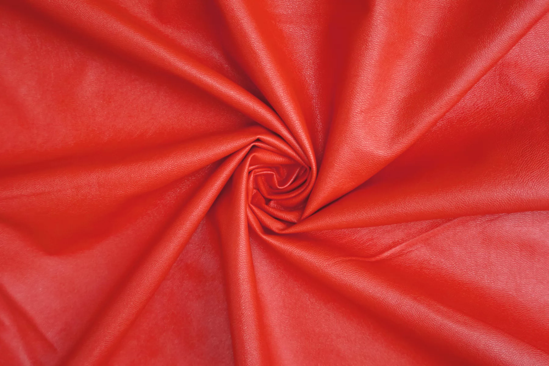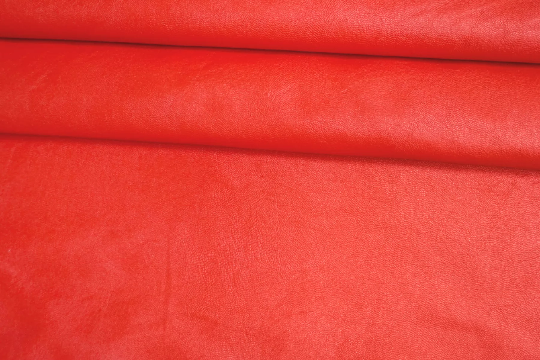 Итальянская экокожа на вискозной основе в насыщенном красном цвете. Не просвечивает. Средней плотности, из-за натуральной основы может мяться, но хорошо отпаривается. Пластичная, гладкая, немного тянется. Можно сшить тонкую кожанку для теплой погоды, плотную рубашку, платье, сарафан, шорты, брюк, мягкий пиджак.