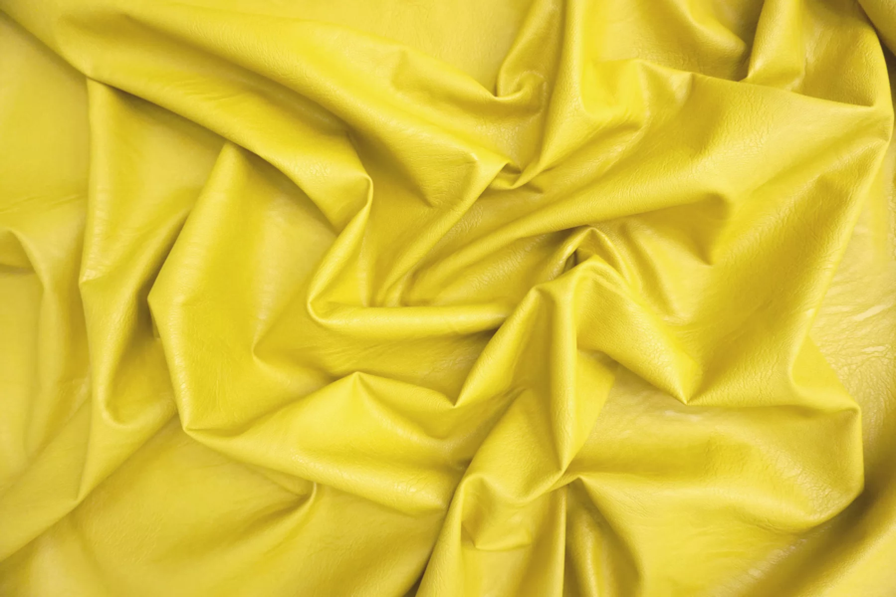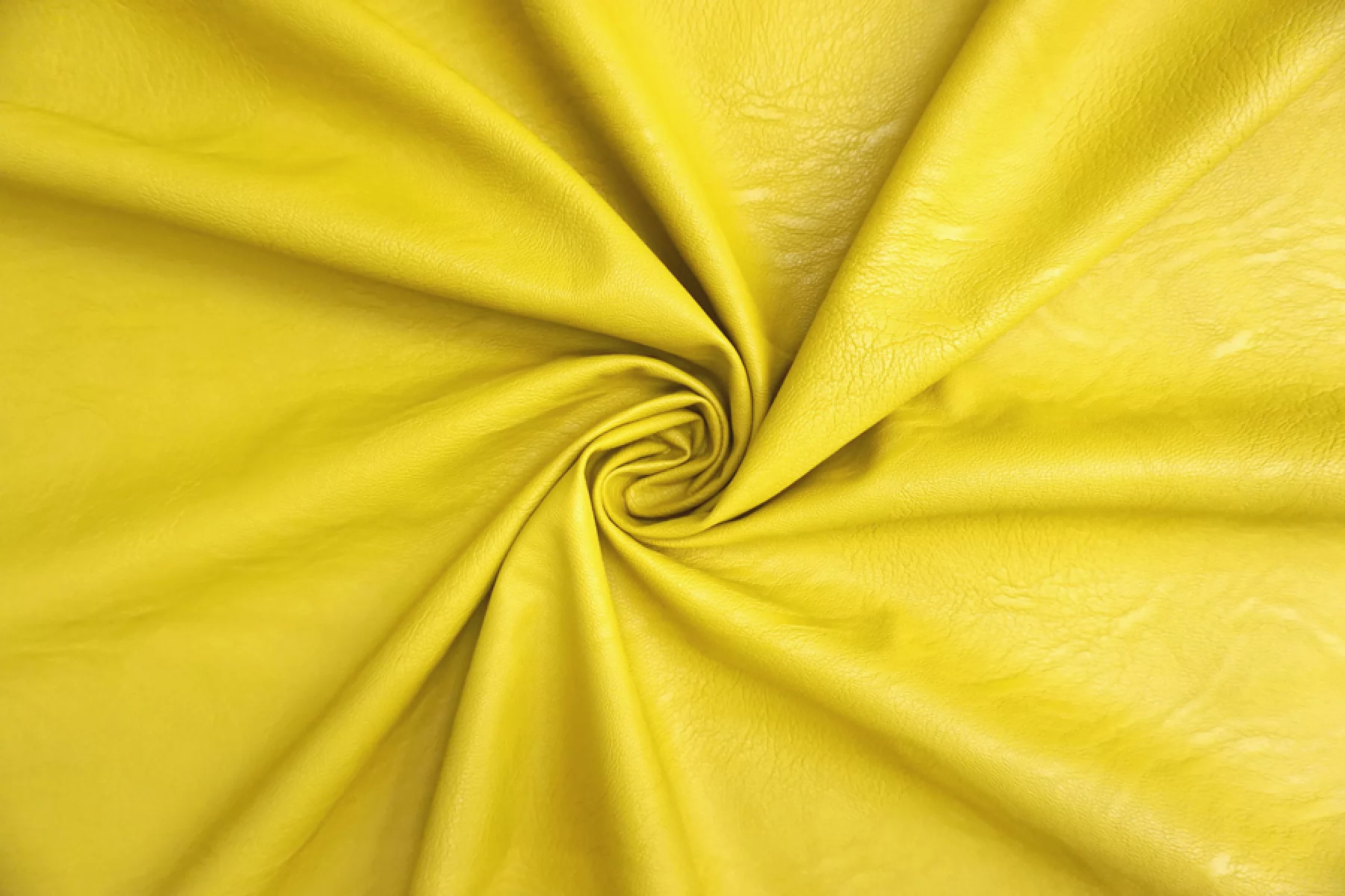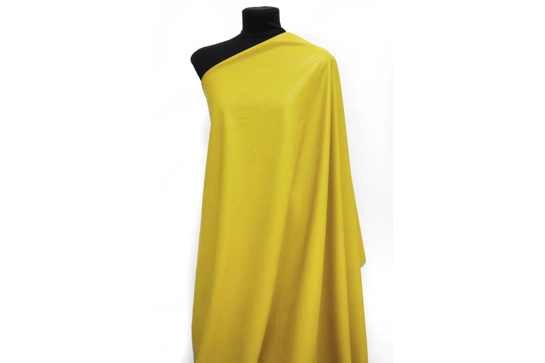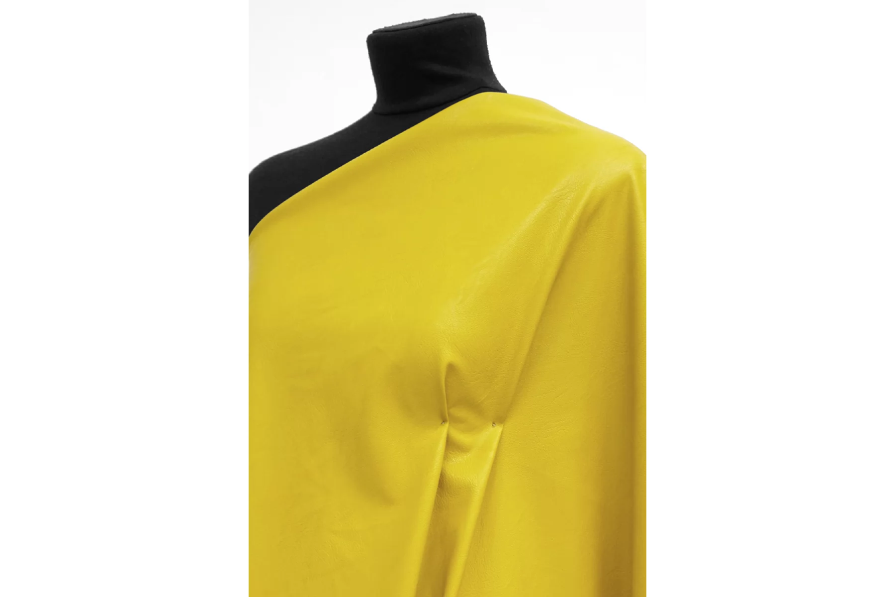 Итальянская экокожа на вискозной основе лимонного оттенка. Не просвечивает. Средней плотности, из-за натуральной основы может мяться, но хорошо отпаривается. Пластичная, гладкая, немного тянется. Можно сшить тонкую кожанку для теплой погоды, плотную рубашку, платье, сарафан, шорты, брюк, мягкий пиджак.