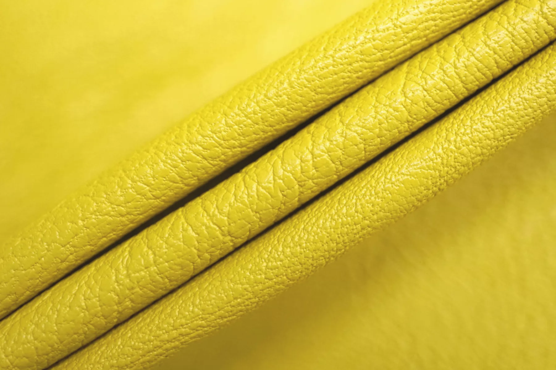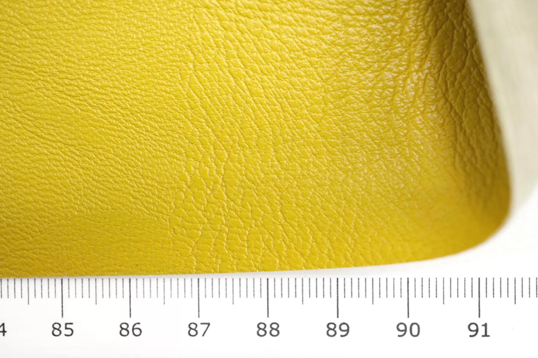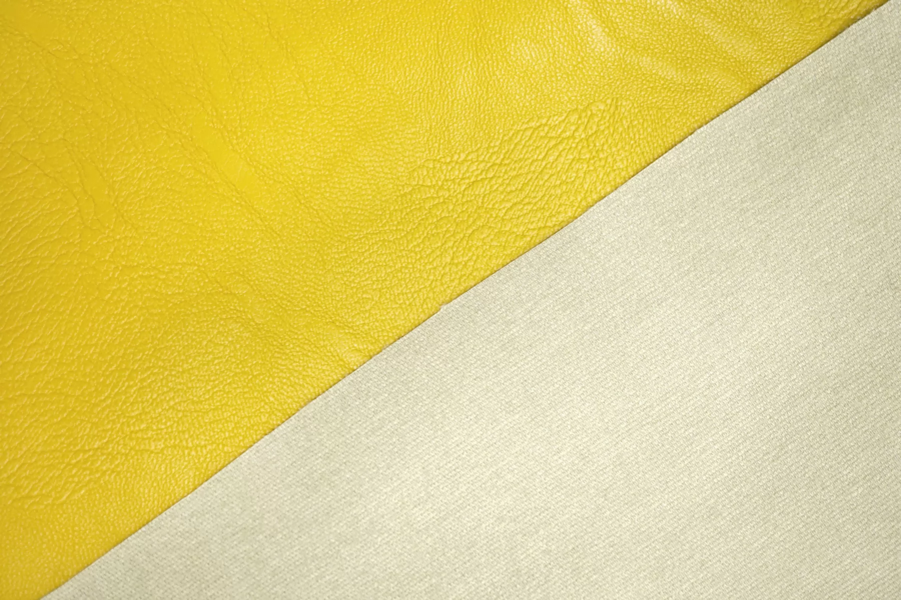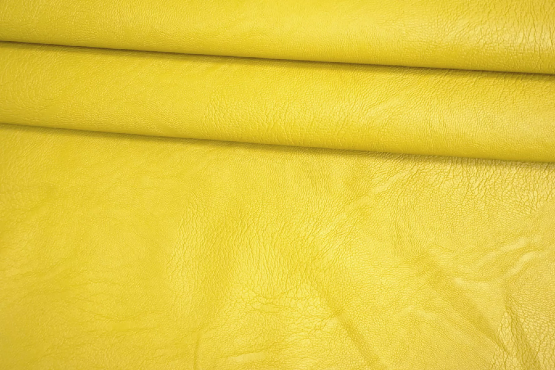 Итальянская экокожа на вискозной основе лимонного оттенка. Не просвечивает. Средней плотности, из-за натуральной основы может мяться, но хорошо отпаривается. Пластичная, гладкая, немного тянется. Можно сшить тонкую кожанку для теплой погоды, плотную рубашку, платье, сарафан, шорты, брюк, мягкий пиджак.