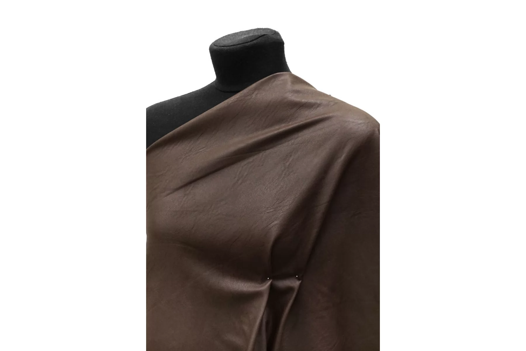 Итальянская экокожа на вискозной основе в матовом коричневом цвете. Не просвечивает. Средней плотности, из-за натуральной основы может мяться, но хорошо отпаривается. Пластичная, гладкая, немного тянется. Можно сшить тонкую кожанку для теплой погоды, плотную рубашку, платье, юбку, шорты, брюки, мягкий пиджак.