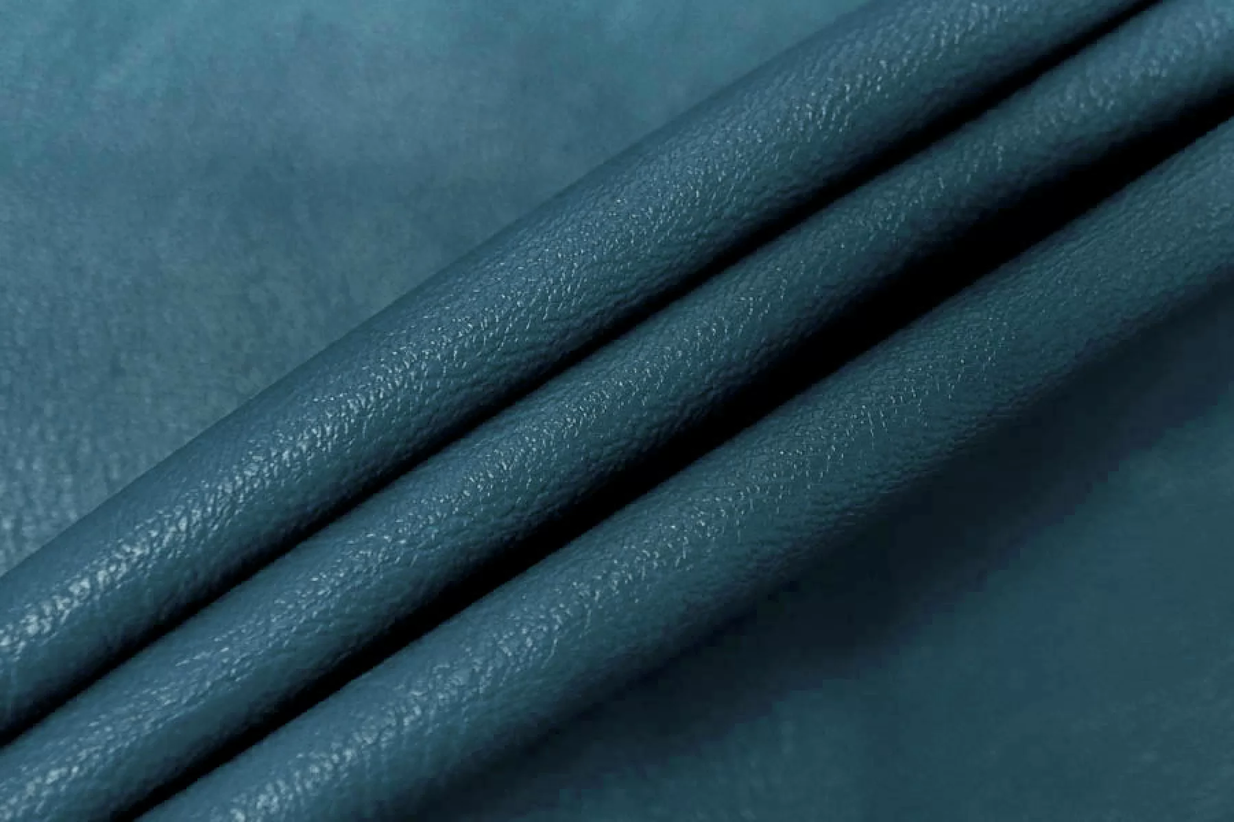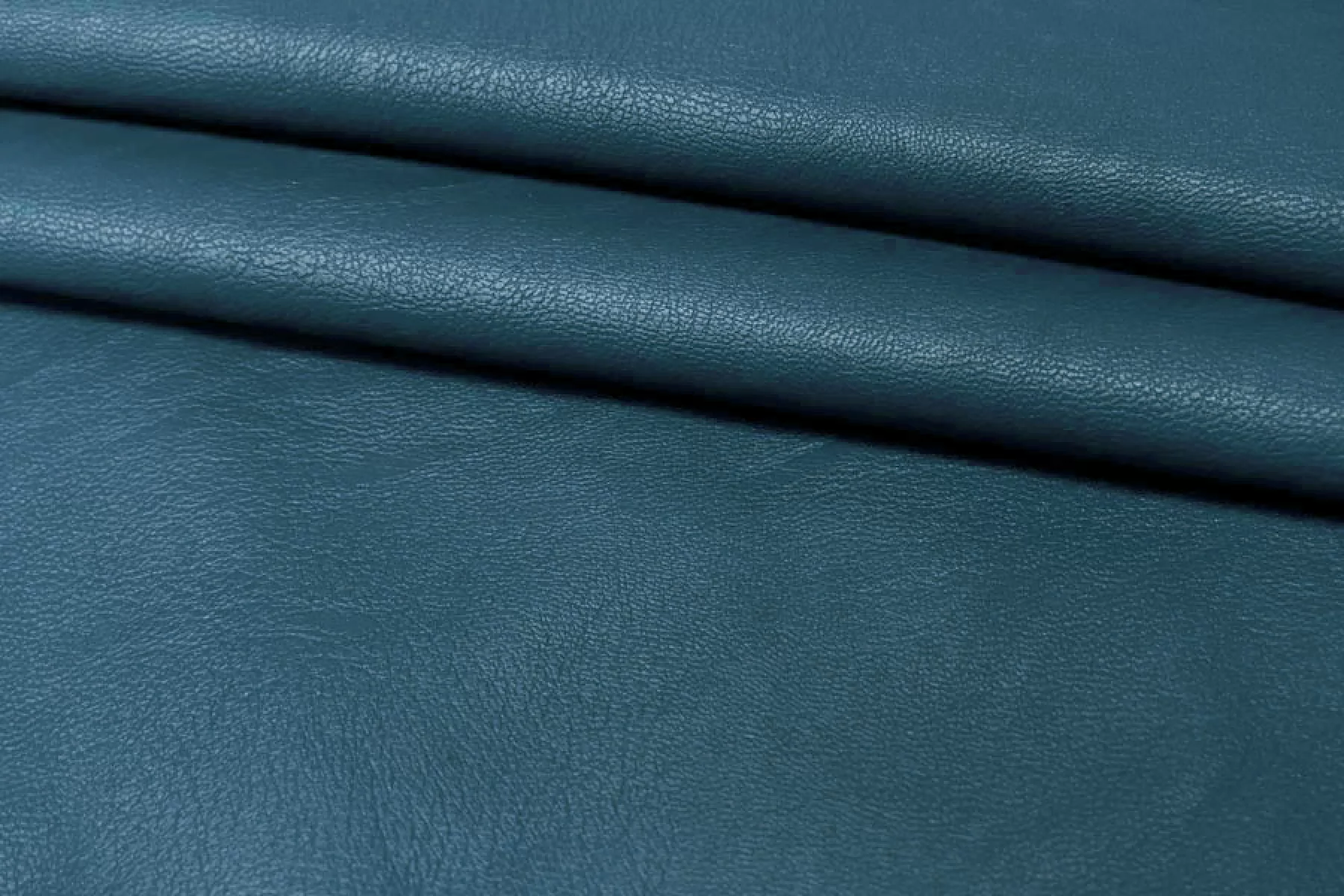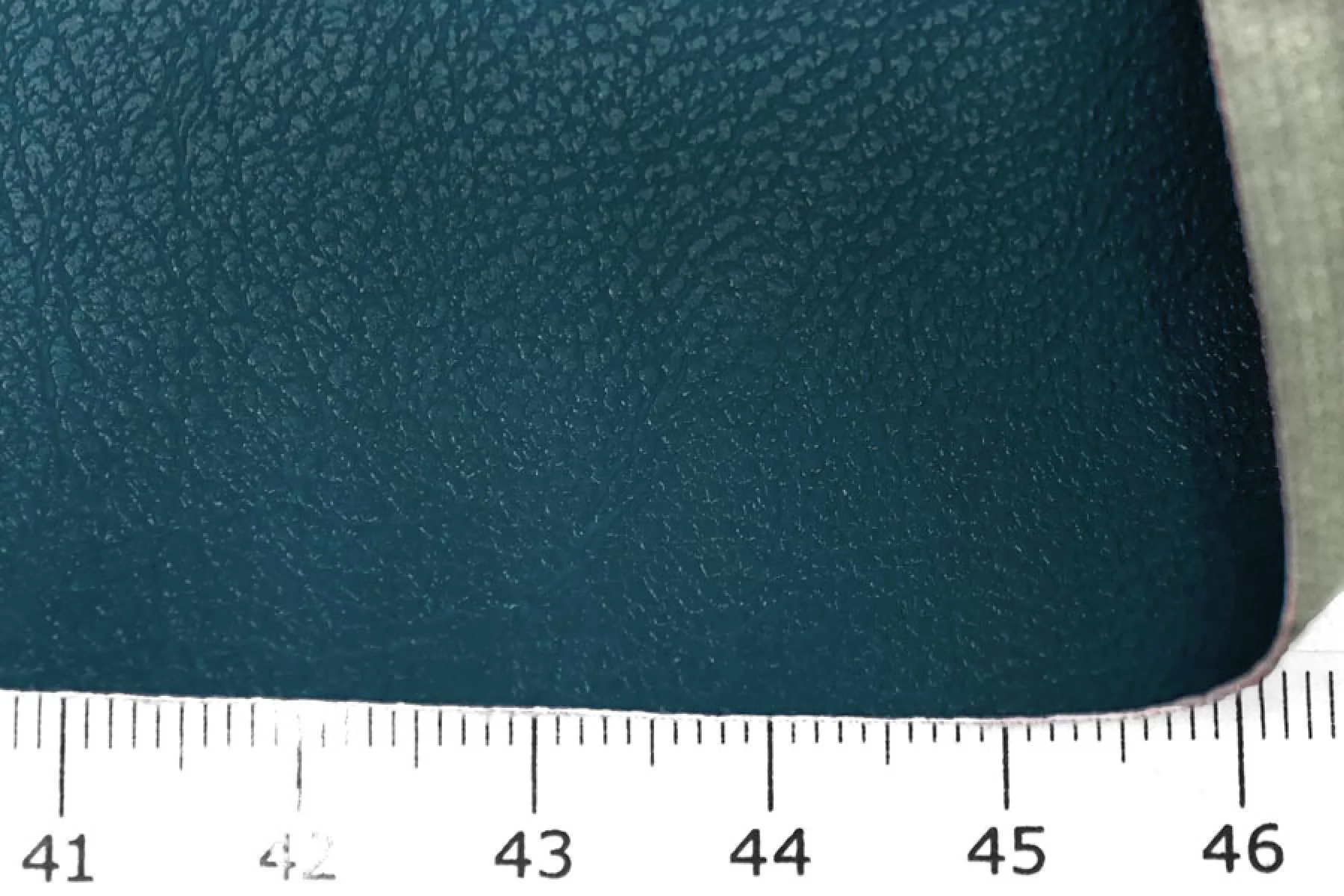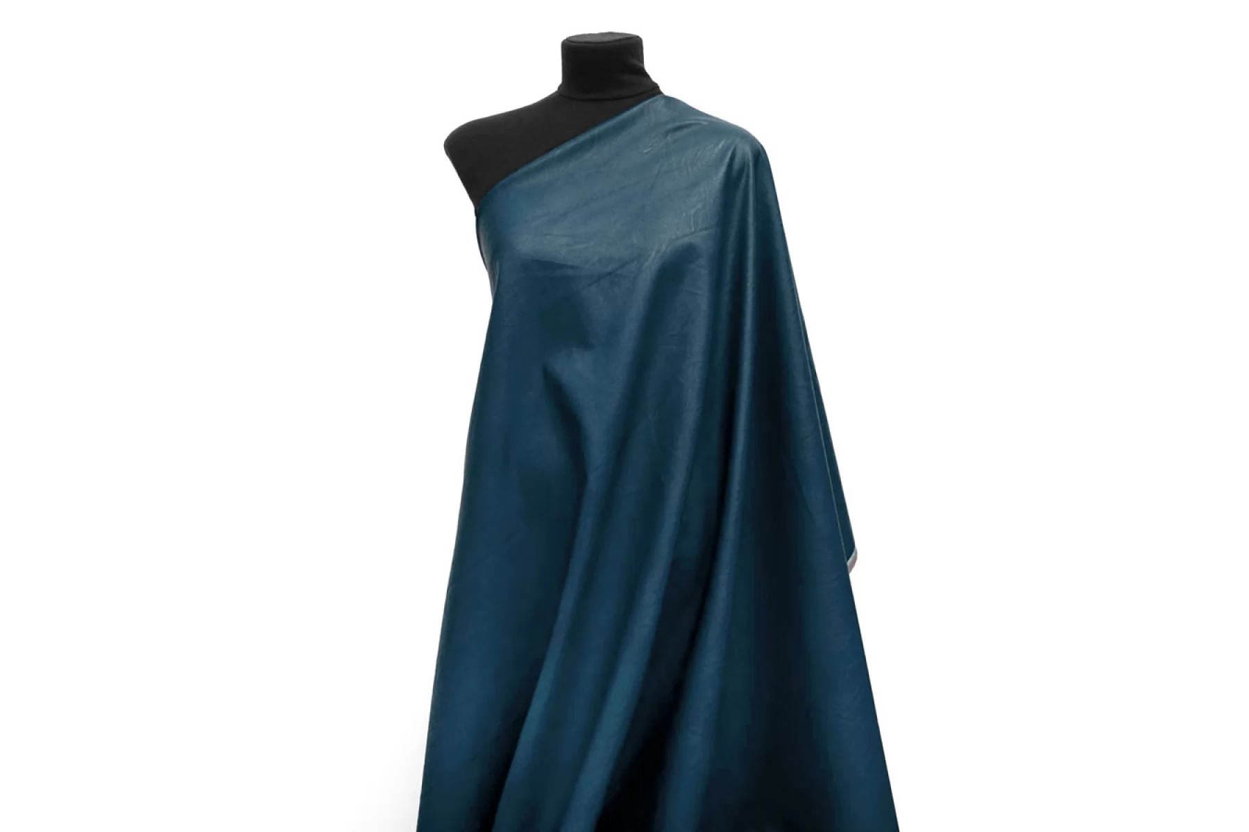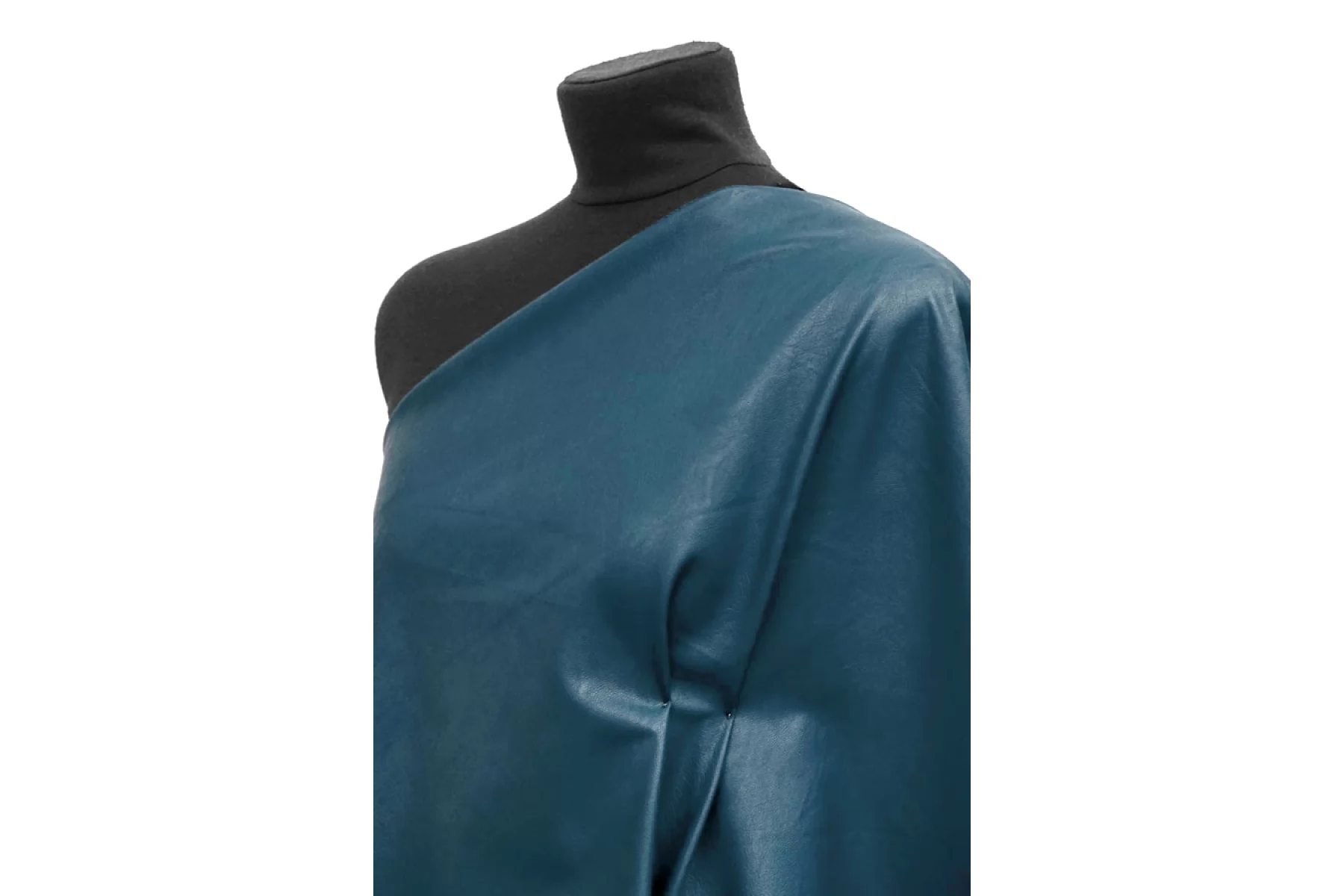 Итальянская экокожа на вискозной основе приятного оттенка петрроль. Не просвечивает. Средней плотности, из-за натуральной основы может мяться, но хорошо отпаривается. Пластичная, гладкая, немного тянется. Можно сшить тонкую кожанку для теплой погоды, плотную рубашку, платье, сарафан, шорты, брюк, мягкий пиджак.