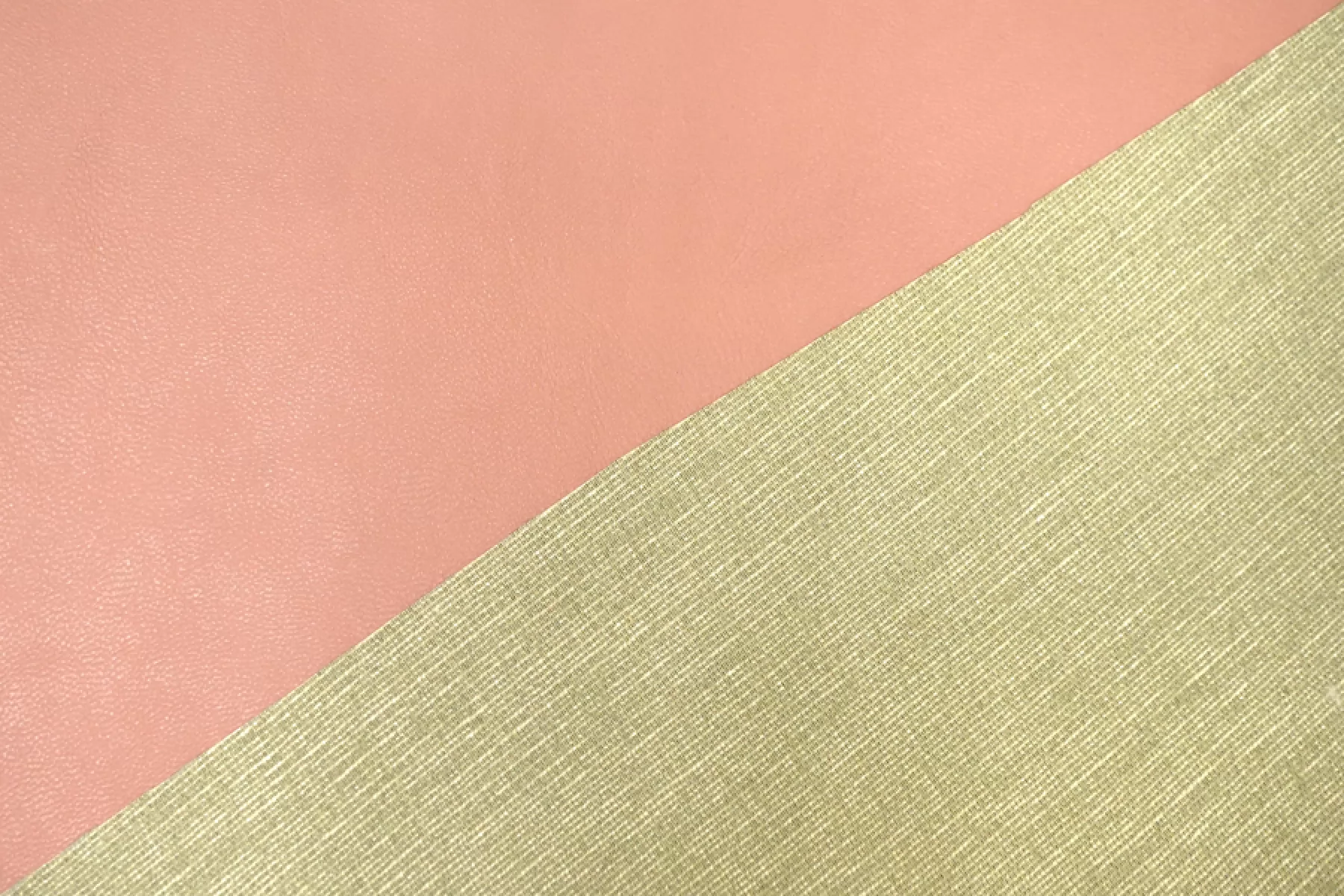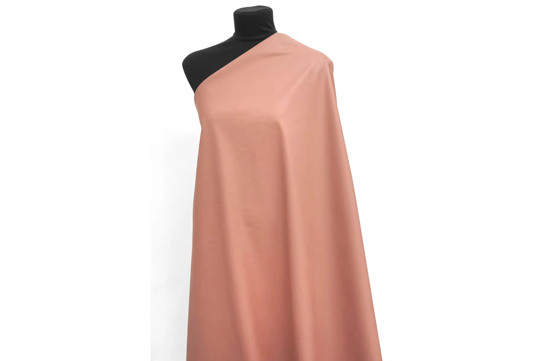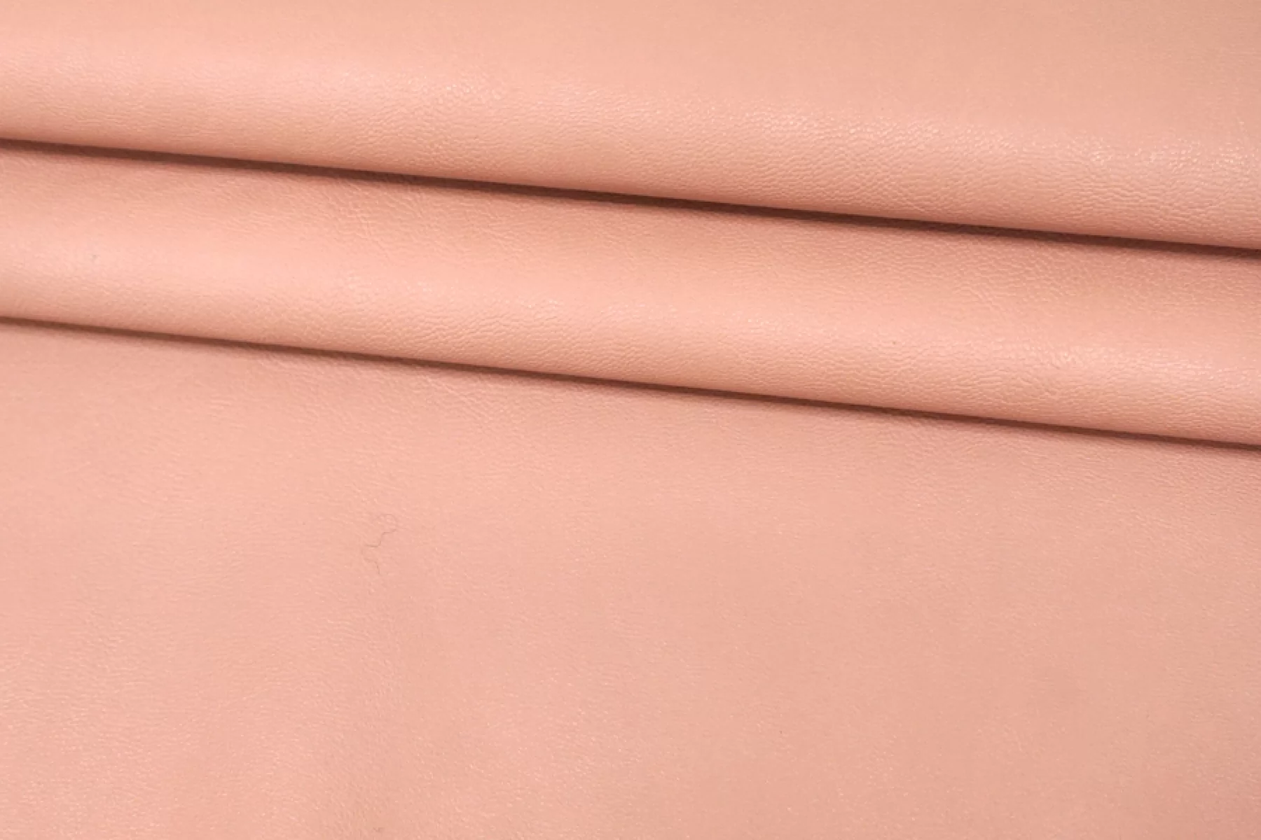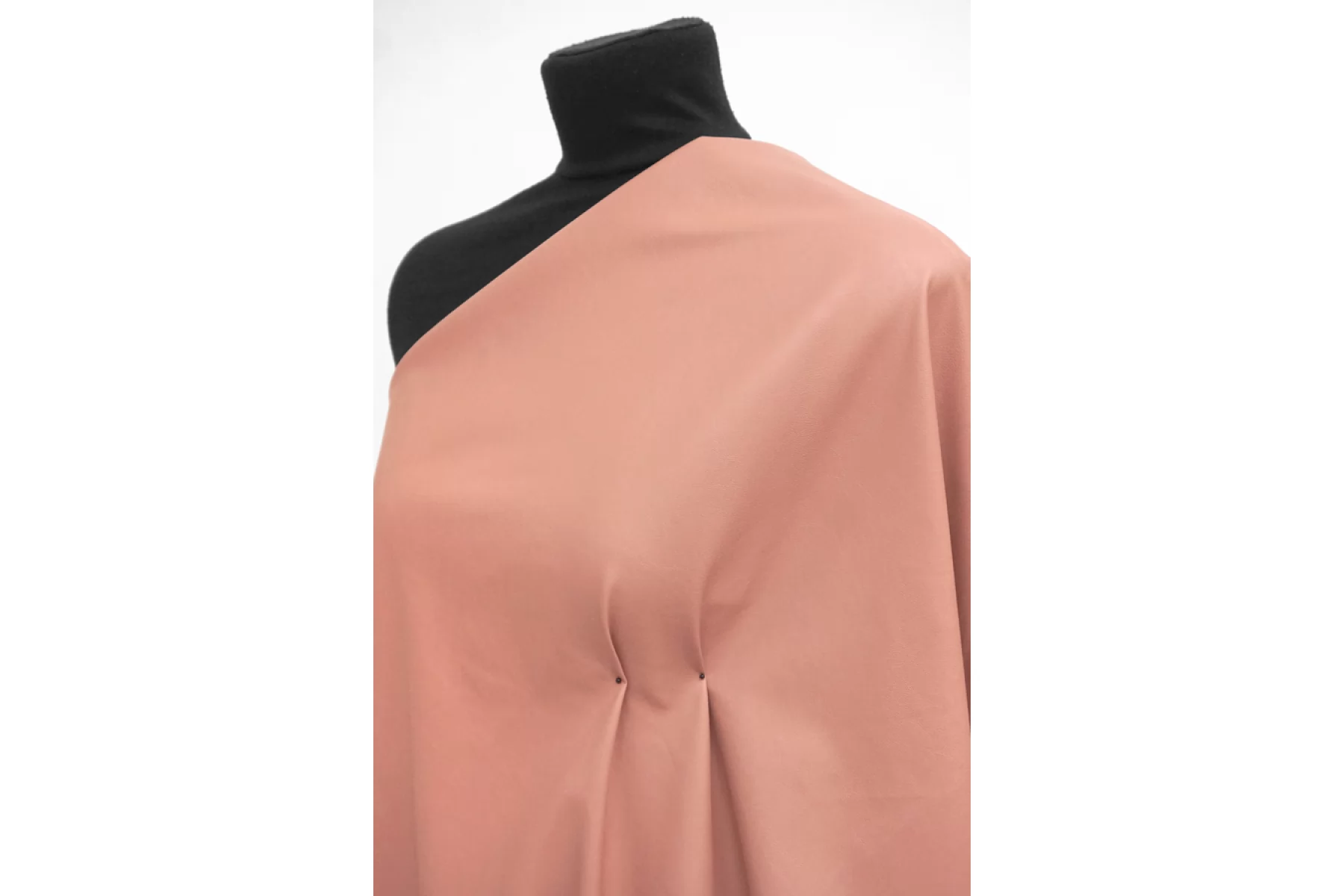 Итальянская экокожа на вискозной, серо-зеленоватого оттенка, основе в пудрово-розовом оттенке. Тактильно приятная и мягкая, плотненькая. Не просвечивает. Из-за натуральной основы может сминаться, но хорошо отпаривается. Пластичная, гладкая, неплохо тянется за счет плетения. Хорошо держит форму. Прекрасный вариант для весенней, осенней одежды и не только. Отличный вариант на юбки, платья, жакеты, куртки, жилеты, шорты, плащи и другое!