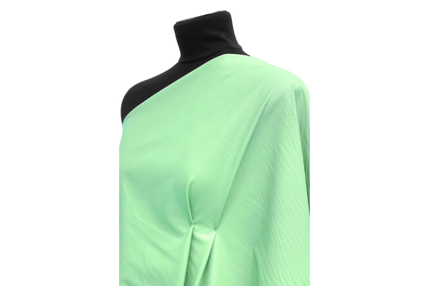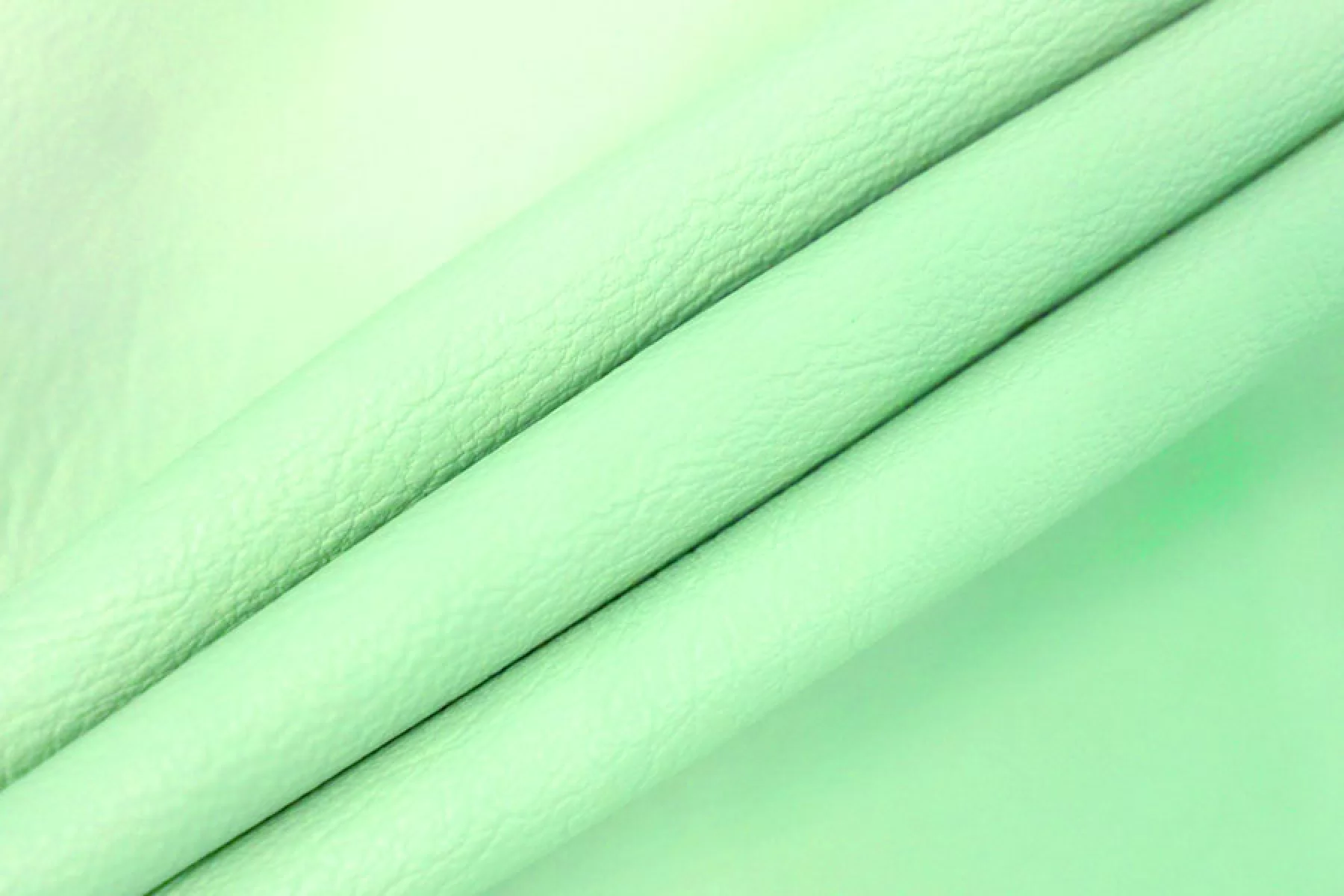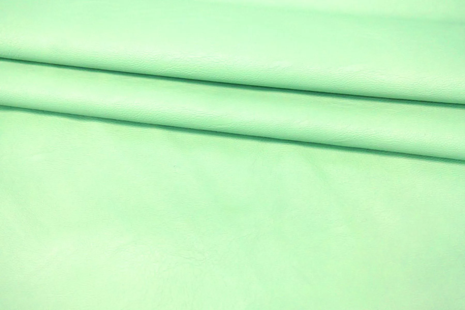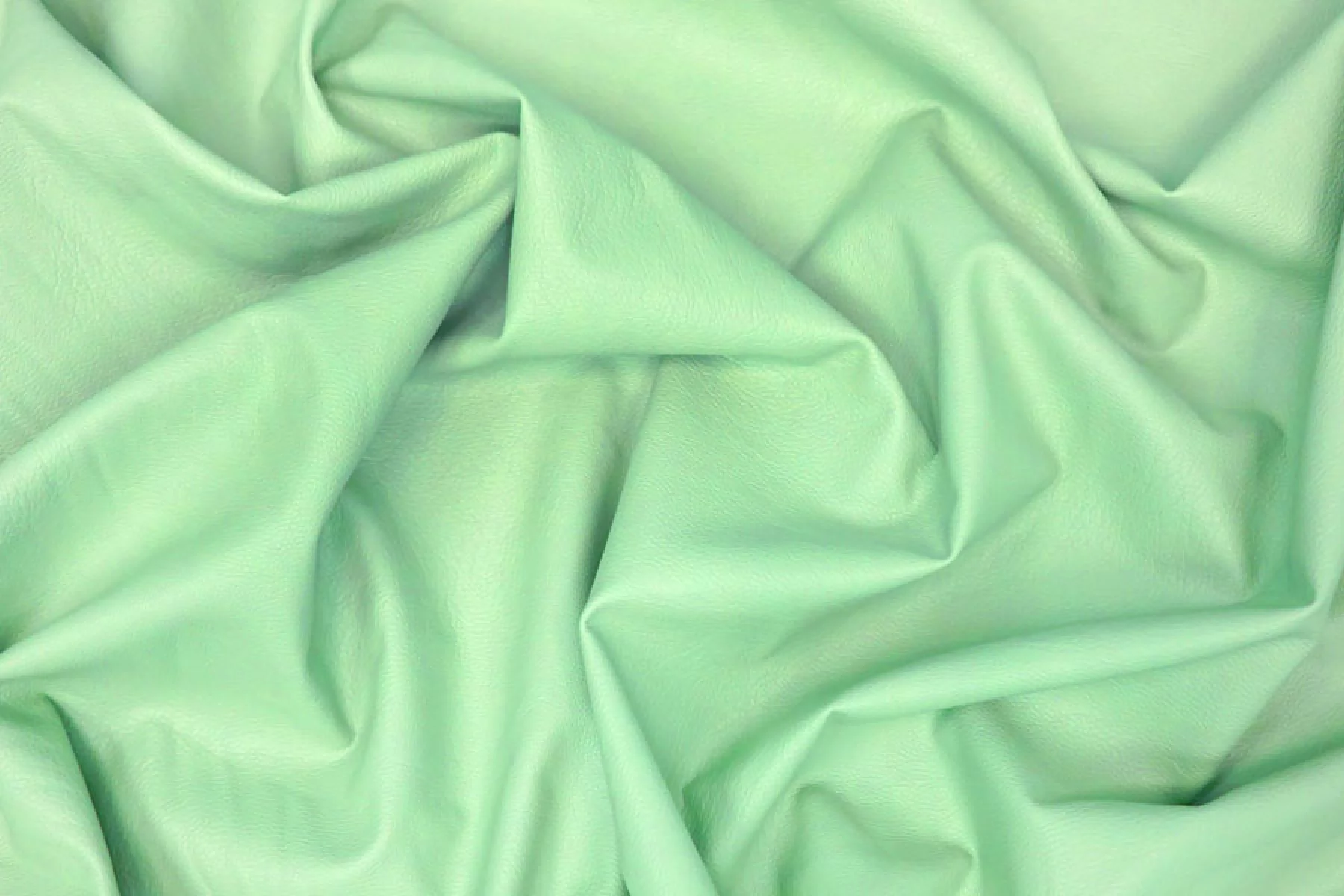 Экокожа на вискозной основе светлого разбеленного зеленого оттенка, изнаночная сторона - светлая. Не просвечивает. Плотненькая, из-за натуральной основы может слегка мяться, но восстанавливается и хорошо отпаривается. Пластичная, слегка фактурная, со средней "зернистостью", с красивым лоском, немного тянется за счет плетения. Мягкая, приятная как с лицевой, так и с изнаночной стороны. Неплохо держит форму. Классный вариант для весенней, осенней одежды и не только. Отлично подойдет на юбки, платья, жакеты, куртки, жилеты, шорты и другие варианты!