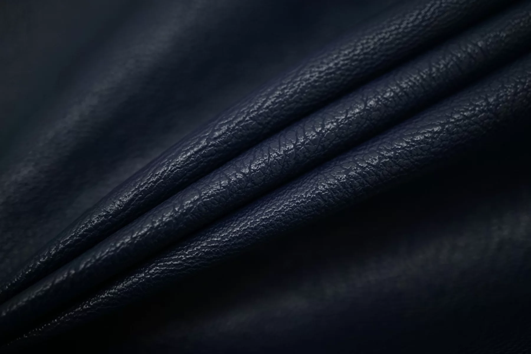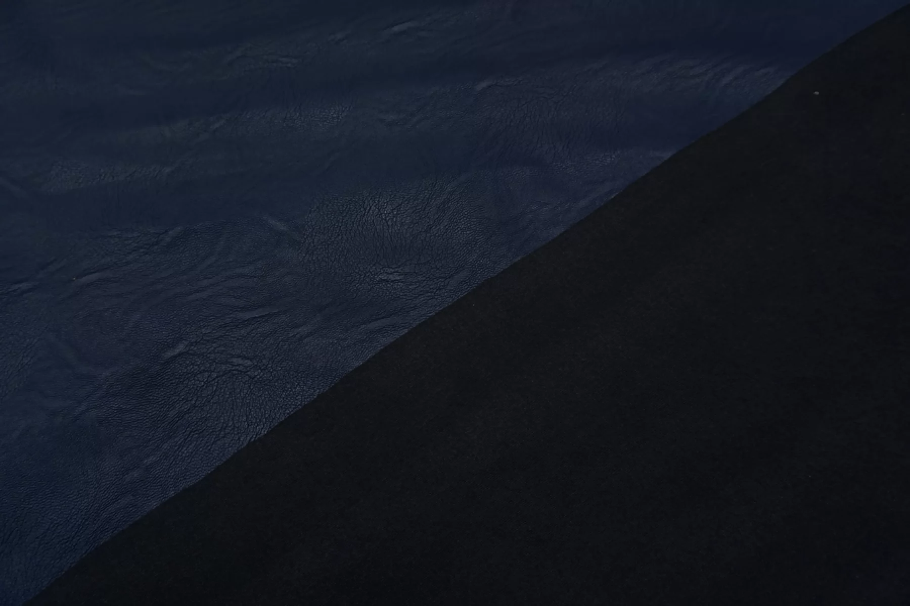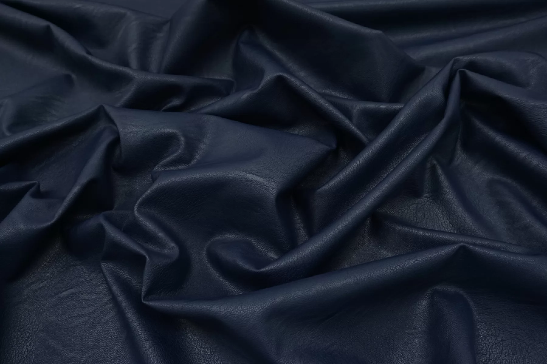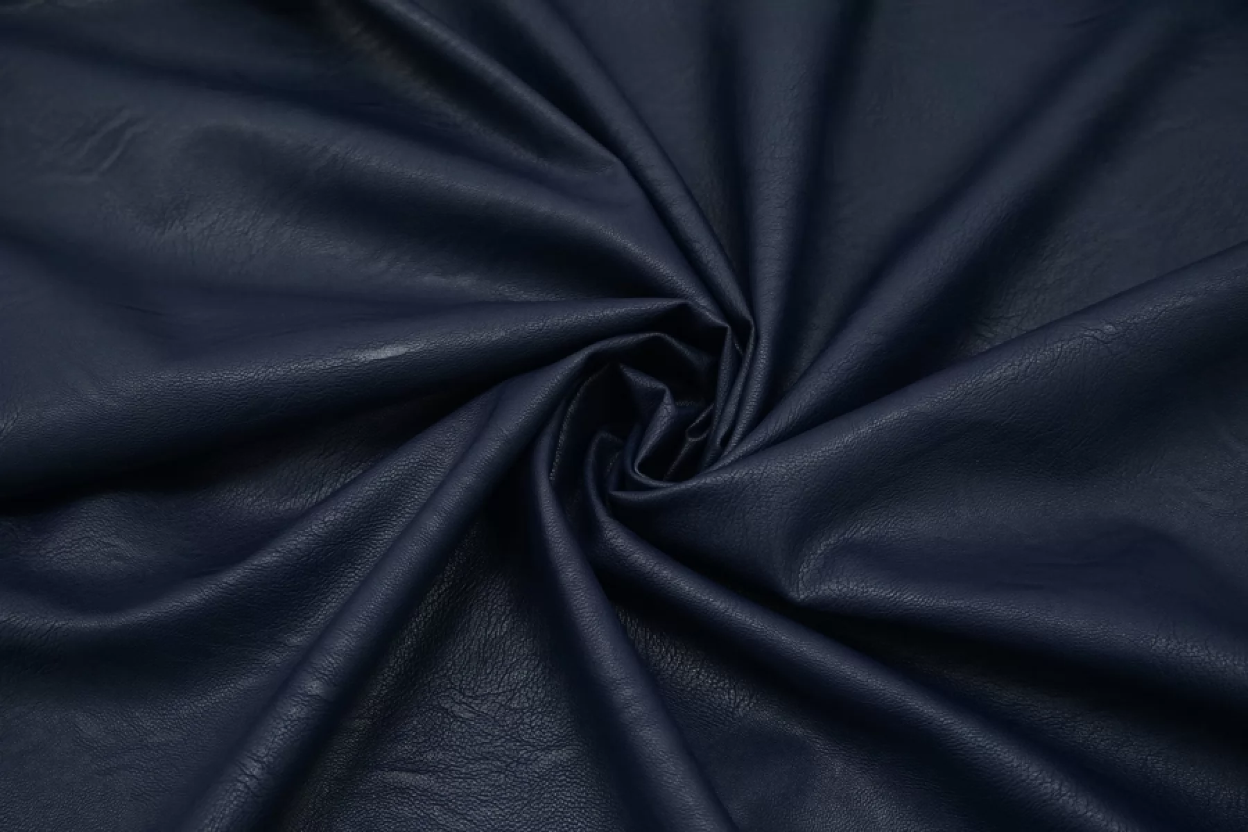 Итальянская экокожа на вискозной основе в темно-синем цвете. Не просвечивает. Средней плотности, из-за натуральной основы может мяться, но хорошо отпаривается. Пластичная, гладкая, немного тянется. Можно сшить тонкую кожанку для теплой погоды, плотную рубашку, платье, сарафан, шорты, брюк, мягкий пиджак.