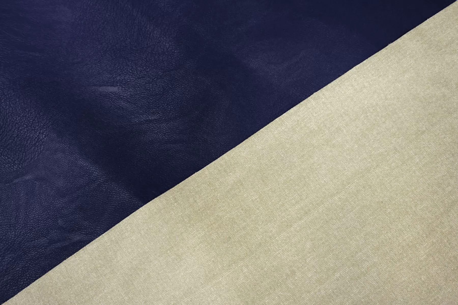 Итальянская экокожа на вискозной основе синего цвета, изнаночная сторона - светлая. Не просвечивает. С матовым лоском. Тонкая, из-за натуральной основы может мяться, но хорошо отпаривается. Пластичная, гладкая, немного тянется. Форму немного держит. Можно сшить тонкую кожанку для теплой погоды, плотную рубашку, платье, сарафан, шорты, брюк, мягкий пиджак.