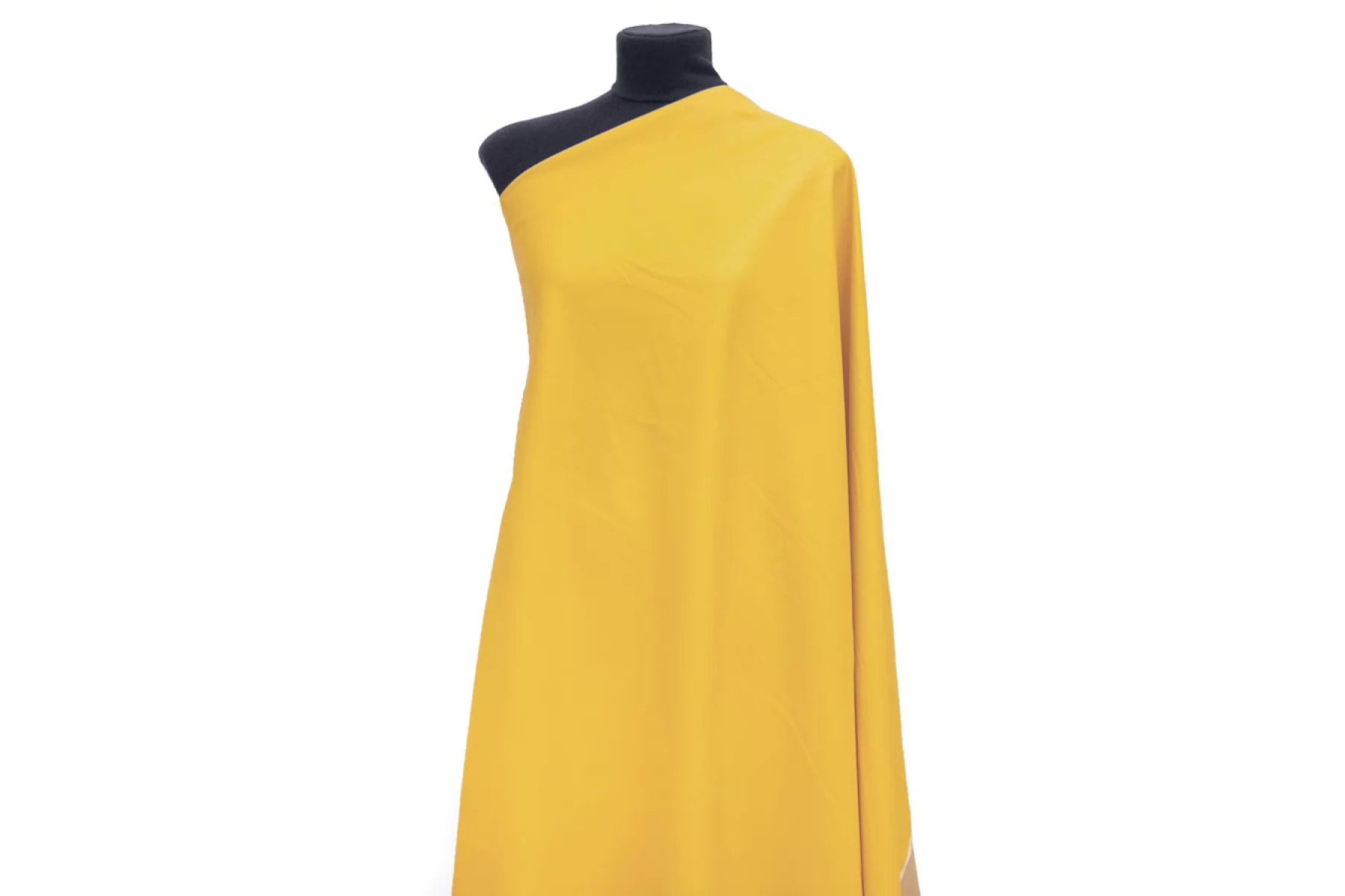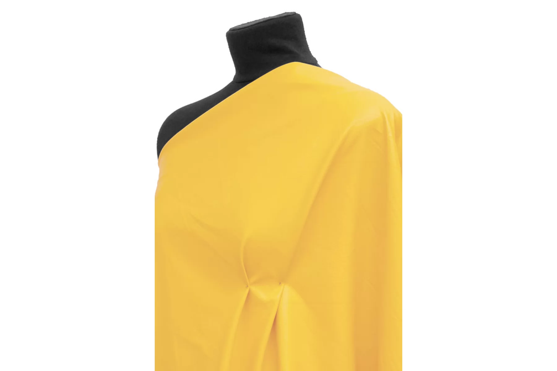 Экокожа на вискозной основе желтого цвета. Изнаночная сторона - светлая. Не просвечивает. Достаточно плотненькая, из-за натуральной основы может слегка мяться, но восстанавливается и хорошо отпаривается. Пластичная, слегка фактурная, с мелкой "зернистостью", матовая, немного тянется за счет плетения. Мягкая, приятная как с лицевой, так и с изнаночной стороны. Неплохо держит форму. Классный вариант для весенней, осенней одежды и не только. Отлично подойдет на юбки, платья, жакеты, куртки, жилеты, шорты и другие варианты!