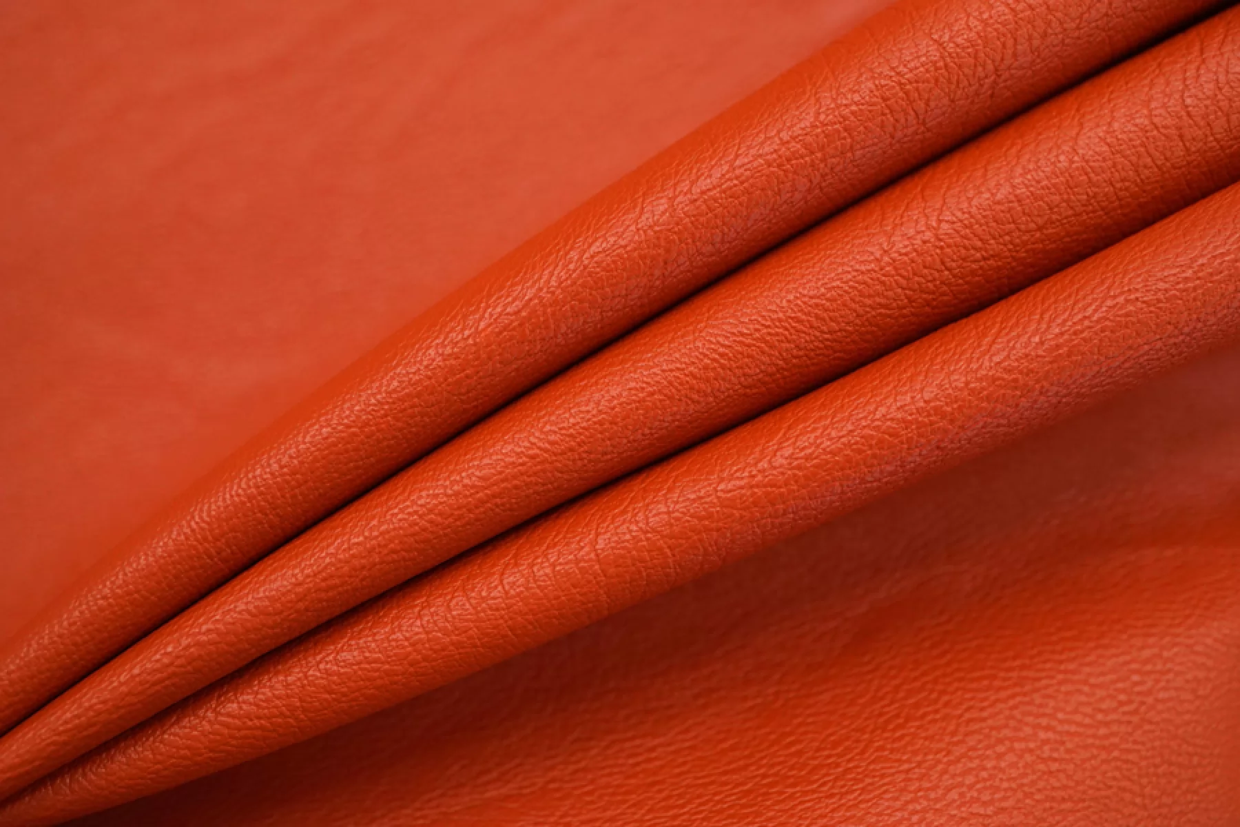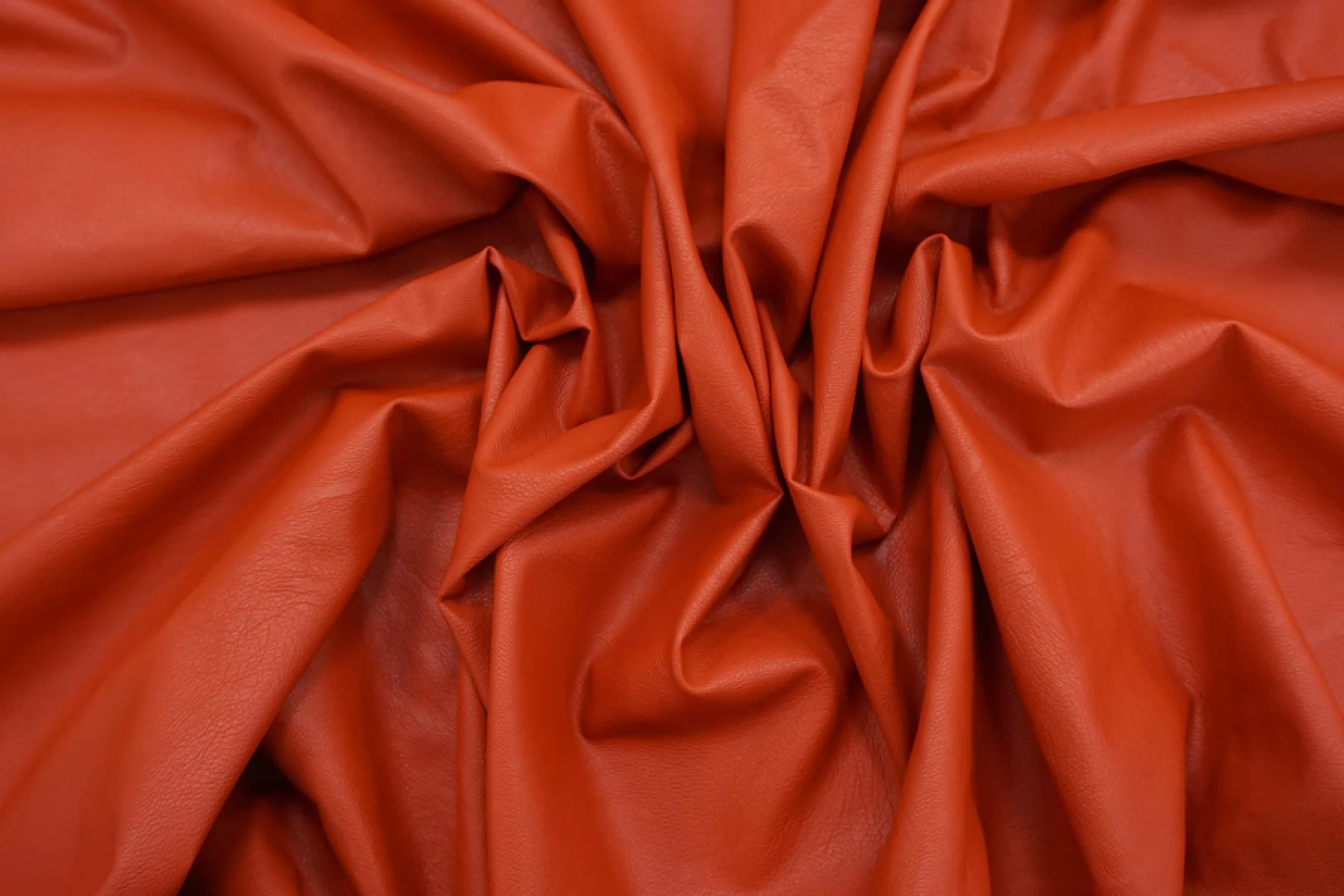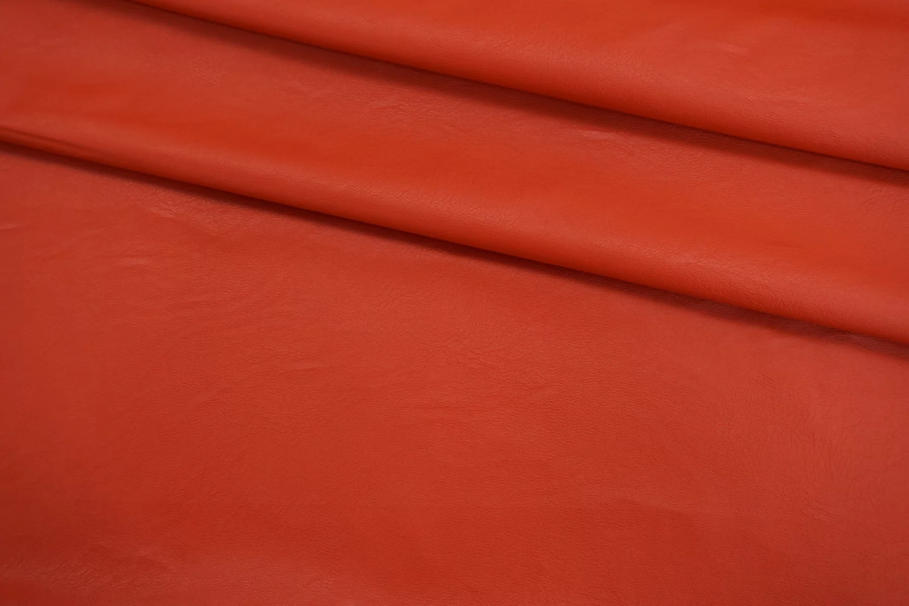 Итальянская экокожа на вискозной основе в насыщенном, кирпичном оттенке. Не просвечивает. Тонкая, из-за натуральной основы может мяться, но хорошо отпаривается. Пластичная, эластичная, гладкая, немного тянется. Можно сшить рубашку, платье, юбку, брюки, шорты.