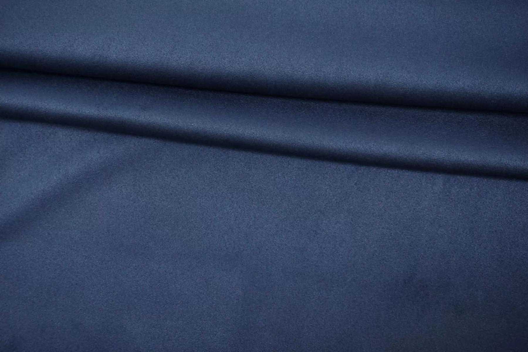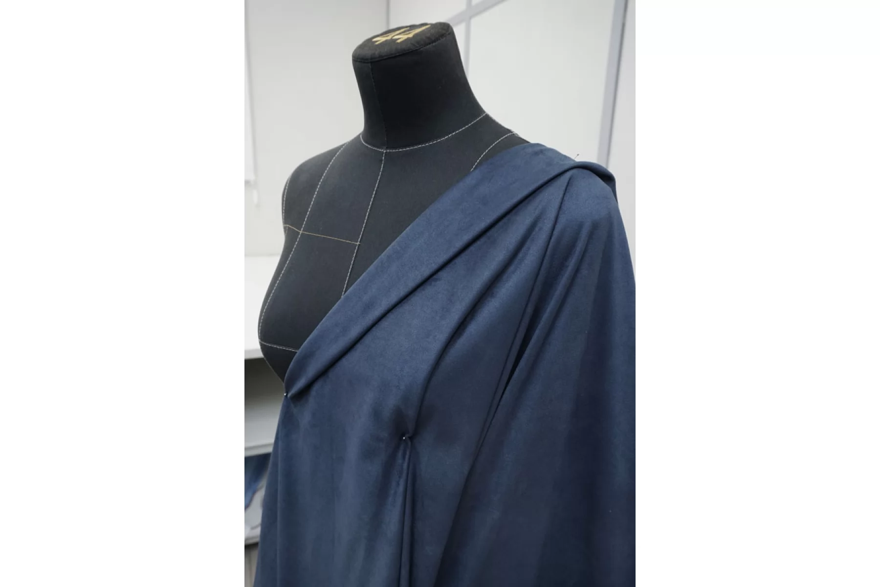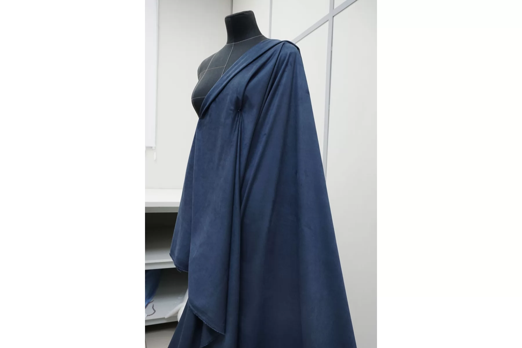 Искусственная замша костюмно-плательной плотности приглушённого, неяркого синего оттенка. Полотно - трикотажного плетения. Короткий редкий ворс с обеих сторон. Тактильно очень приятная и очень мягкая. Тонкая. Упруго тянется за счет трикотажной основы. Не просвечивает. Обладает красивым лоском. Срезы не осыпаются. Слегка сминается, но восстанавливается. Форму держит слабо, но отлично драпируется и смотрится в складках. Пластичная. Шьем юбки, платья, кардиганы, брюк и не только.