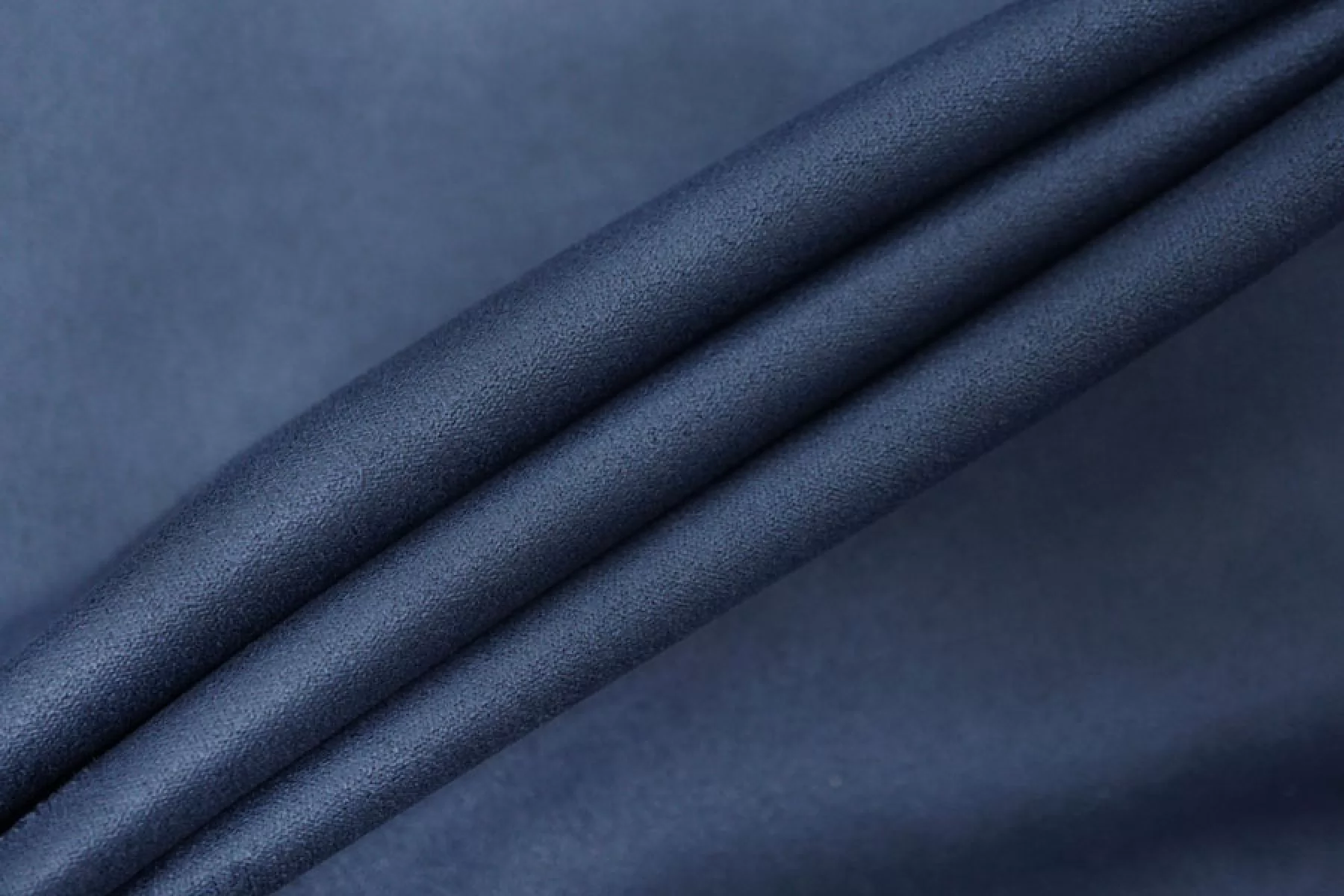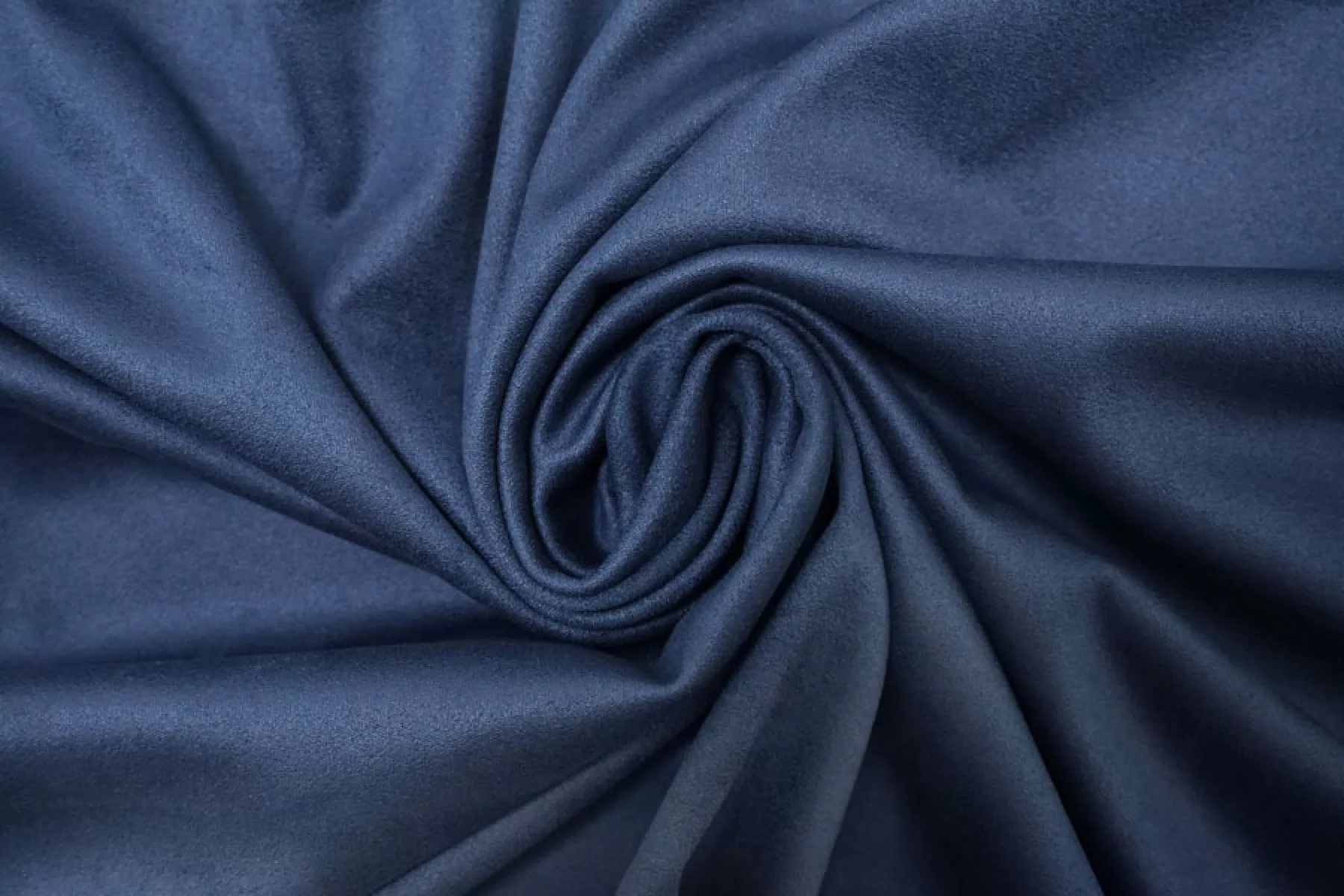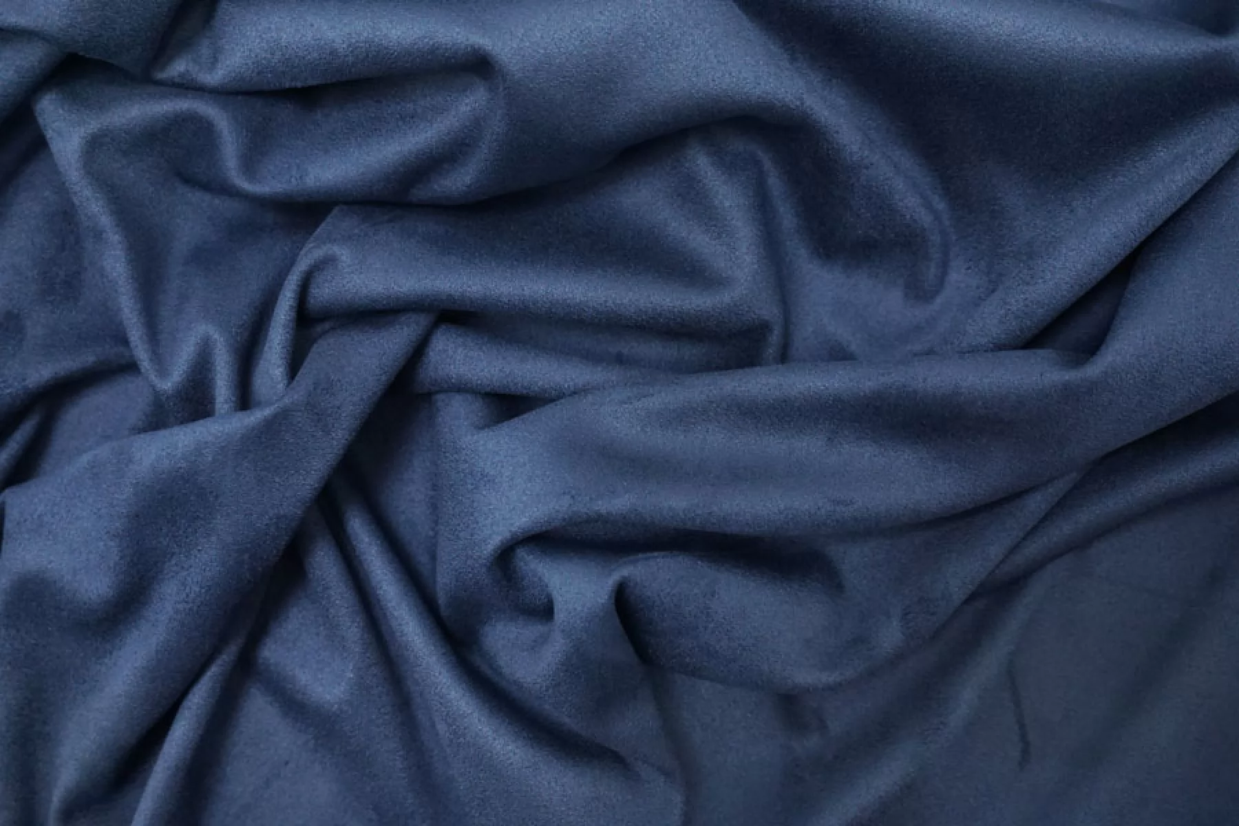 Искусственная замша костюмно-плательной плотности приглушённого, неяркого синего оттенка. Полотно - трикотажного плетения. Короткий редкий ворс с обеих сторон. Тактильно очень приятная и очень мягкая. Тонкая. Упруго тянется за счет трикотажной основы. Не просвечивает. Обладает красивым лоском. Срезы не осыпаются. Слегка сминается, но восстанавливается. Форму держит слабо, но отлично драпируется и смотрится в складках. Пластичная. Шьем юбки, платья, кардиганы, брюк и не только.