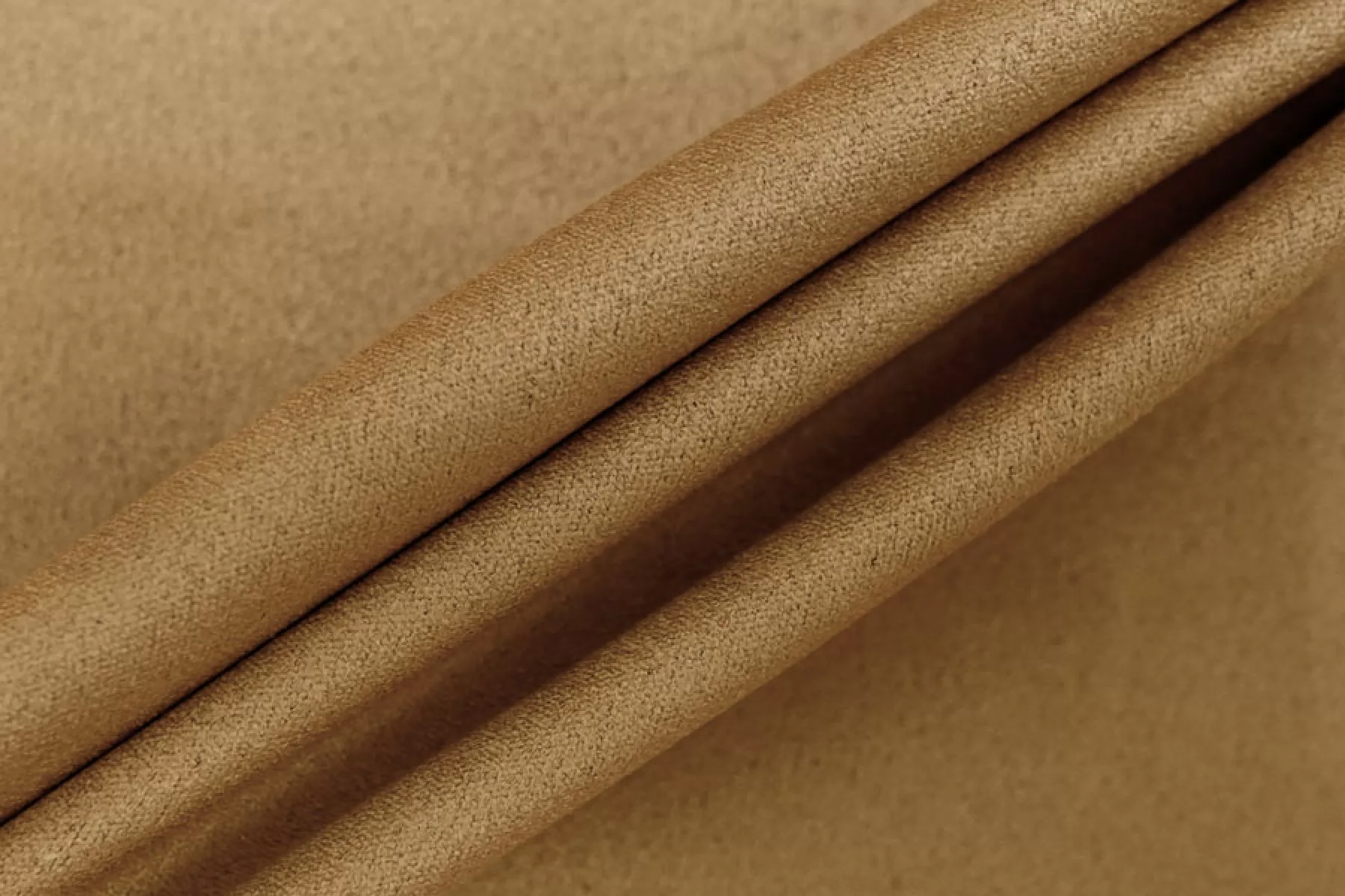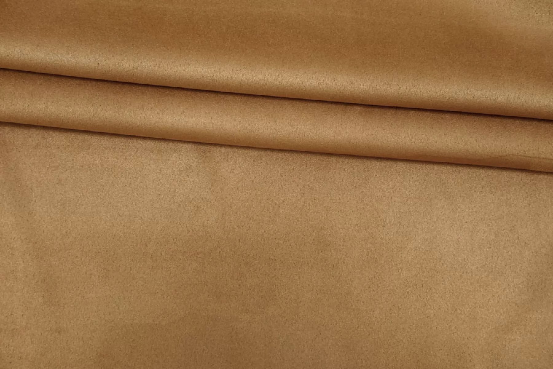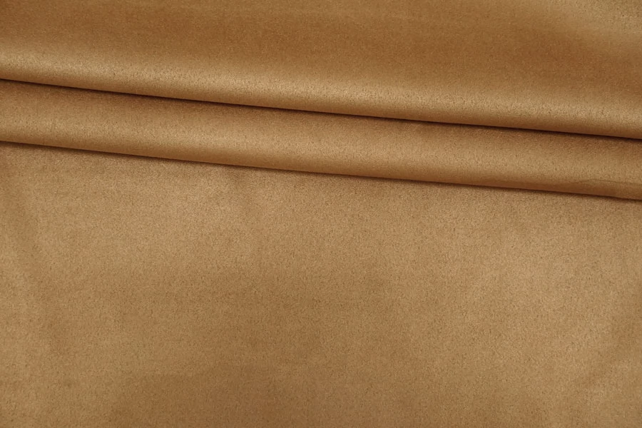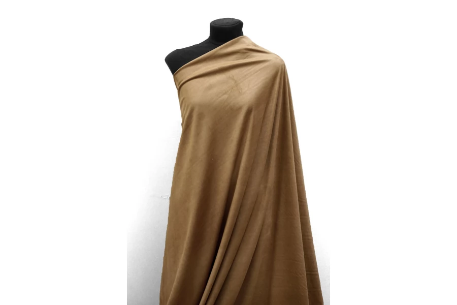 Шикарная экозамша в оттенке кэмел (песочно-бежевый), костюмно-плательной плотности. Гладкая, бархатистая наощупь, с мягким лоском. Обе стороны с мелким редким ворсом. Тонкая, пластичная. Немного держит форму, не мнется, тянется. Можно сшить мягкий кардиган, плотную рубашку, платье, сарафан, шорты, брюки.