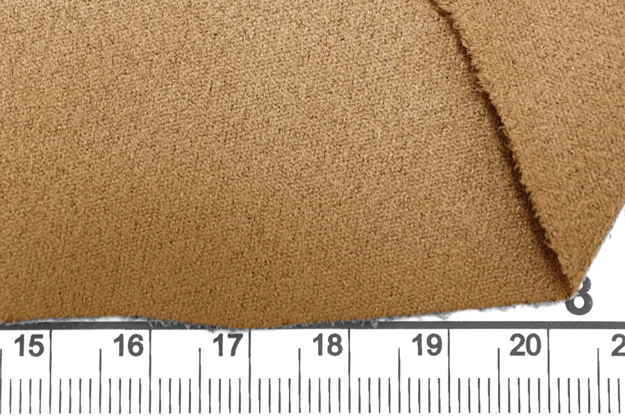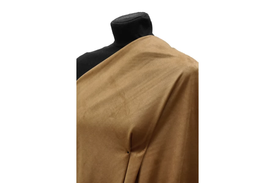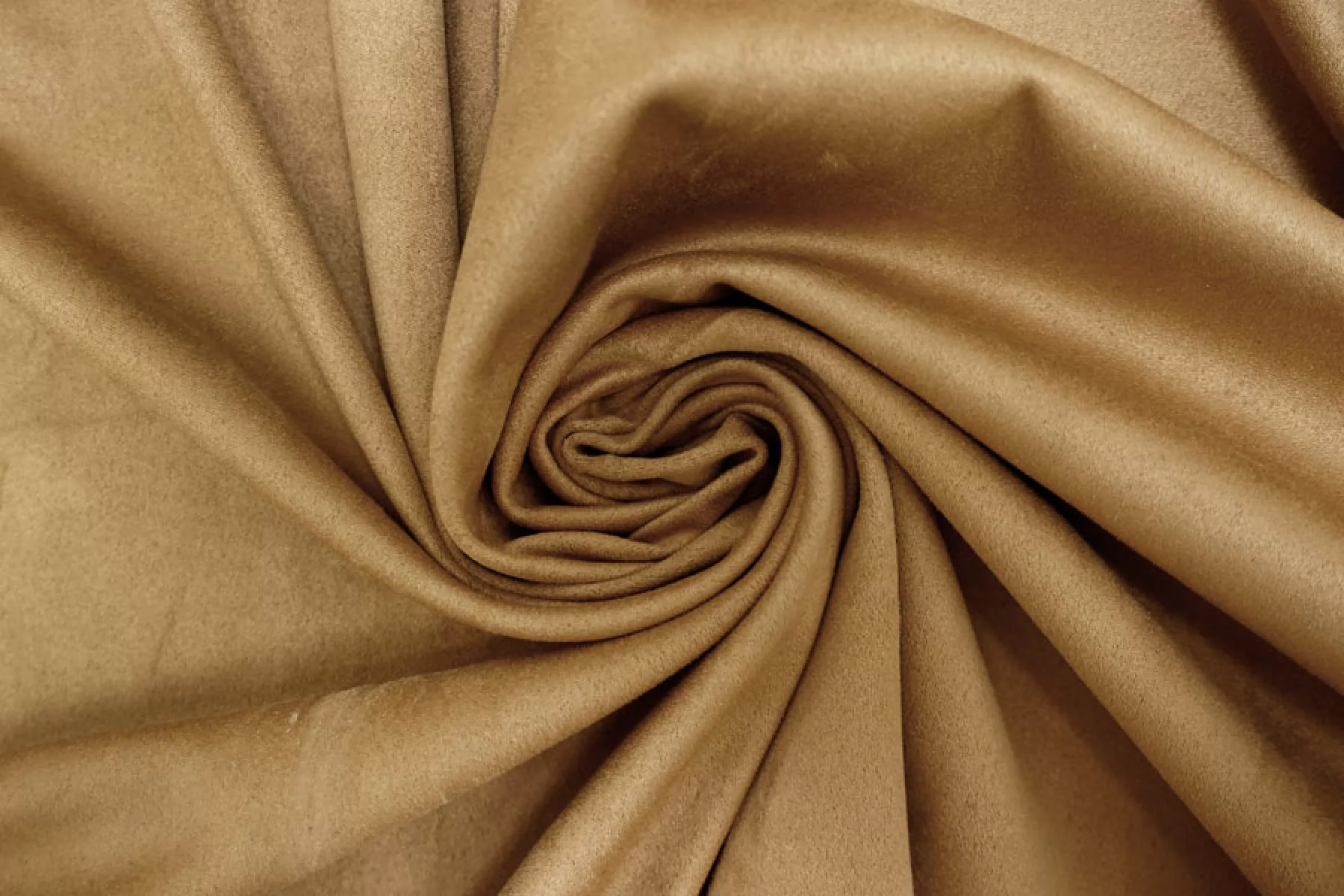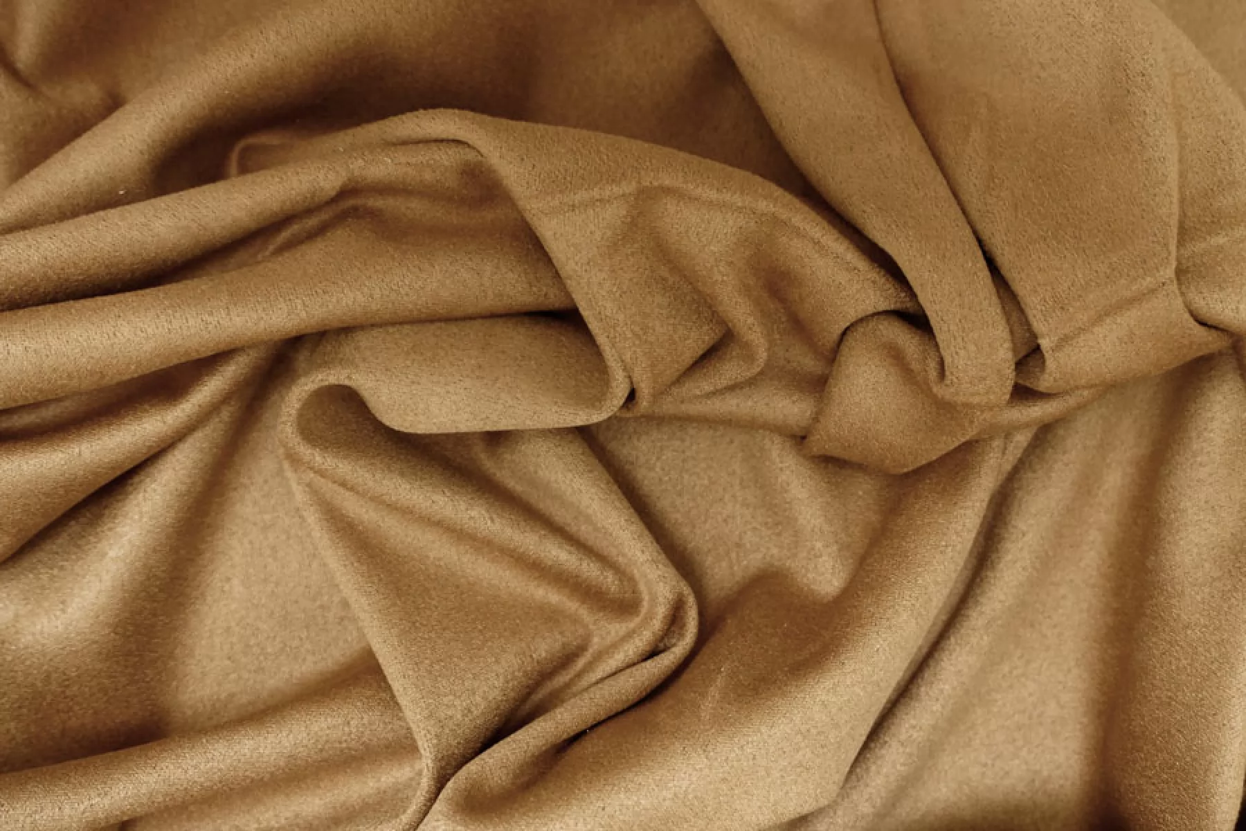 Шикарная экозамша в оттенке кэмел (песочно-бежевый), костюмно-плательной плотности. Гладкая, бархатистая наощупь, с мягким лоском. Обе стороны с мелким редким ворсом. Тонкая, пластичная. Немного держит форму, не мнется, тянется. Можно сшить мягкий кардиган, плотную рубашку, платье, сарафан, шорты, брюки.