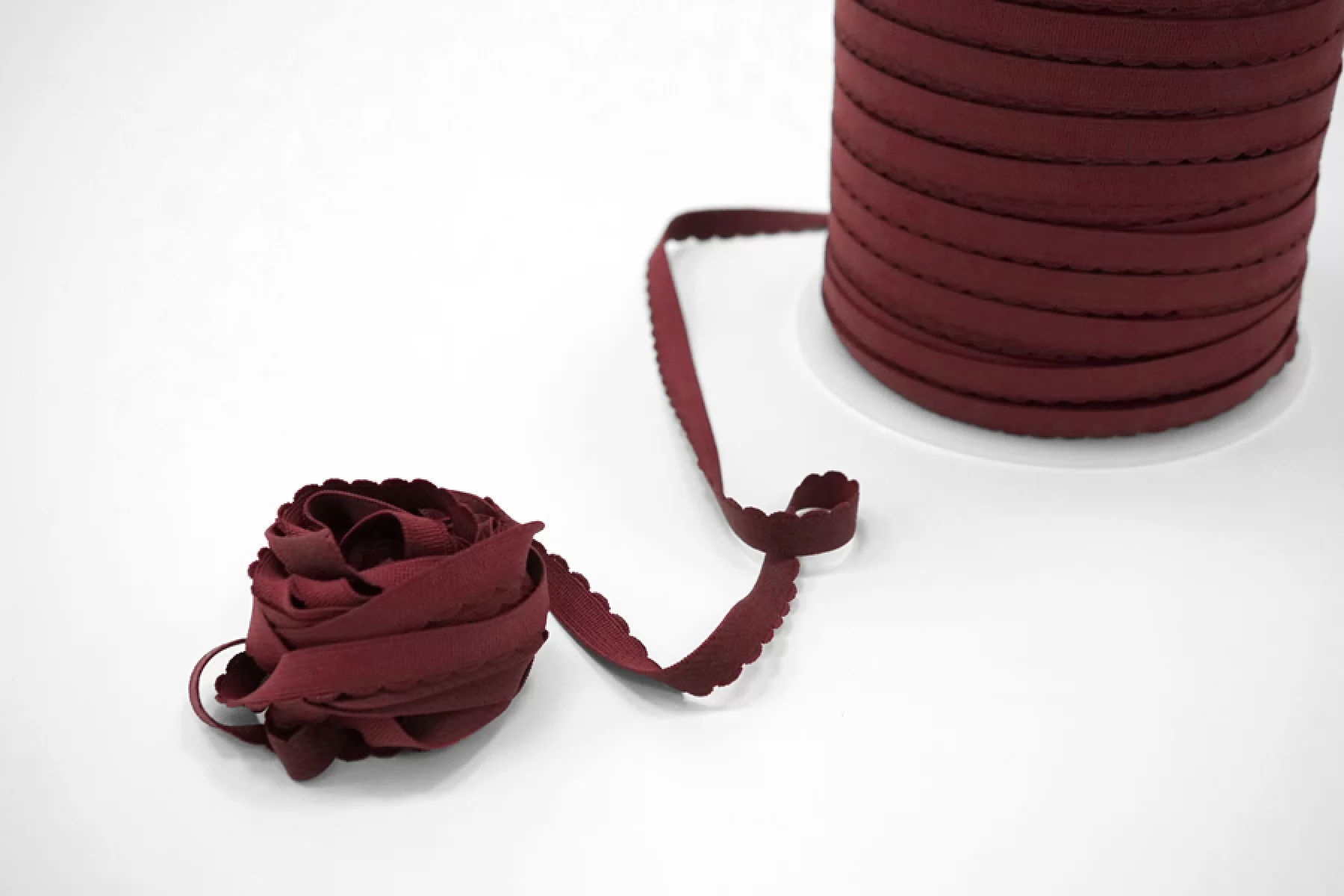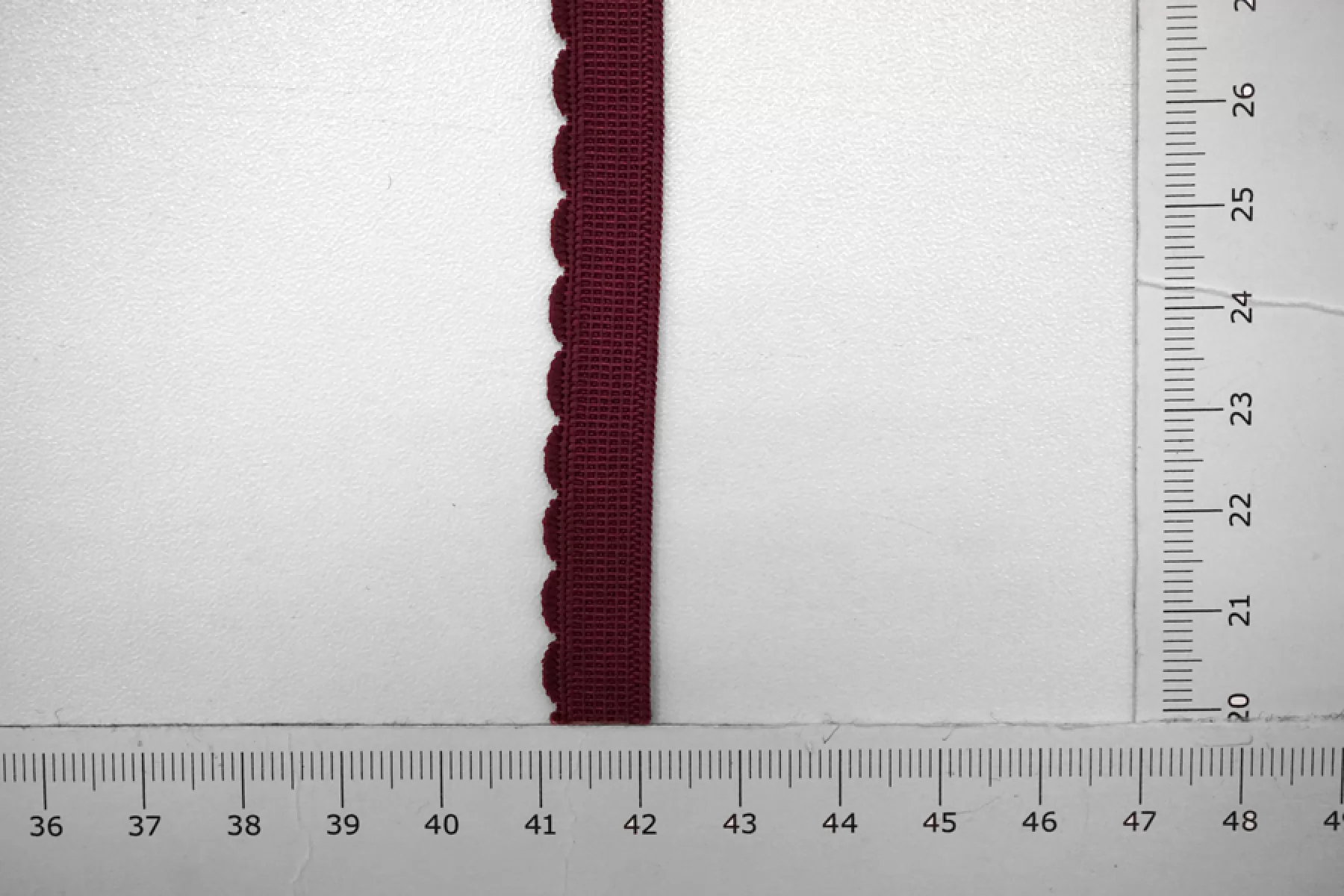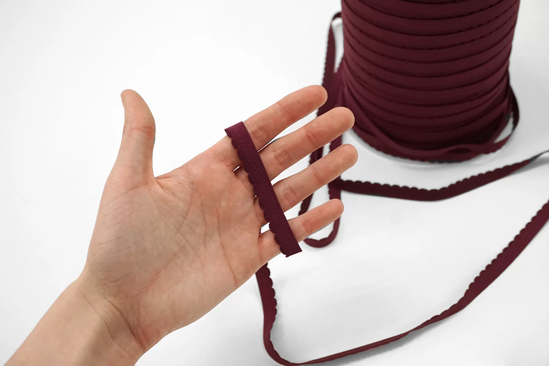 Резинка бельевая мягкая, эластичная, в глубоком винном цвете, с одной стороны имеет ажурный край. Подойдет для пошива и декорирования женского белья, носочно-чулочных изделий, детской одежды и окантовки краёв.