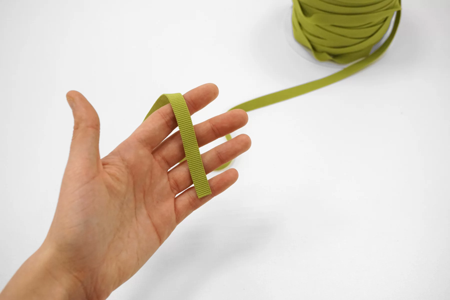 Резинка наружная, декоративная, в салатовом цвете, с репсовым плетением. Подойдет для отделки юбок, брюк и аксессуаров.