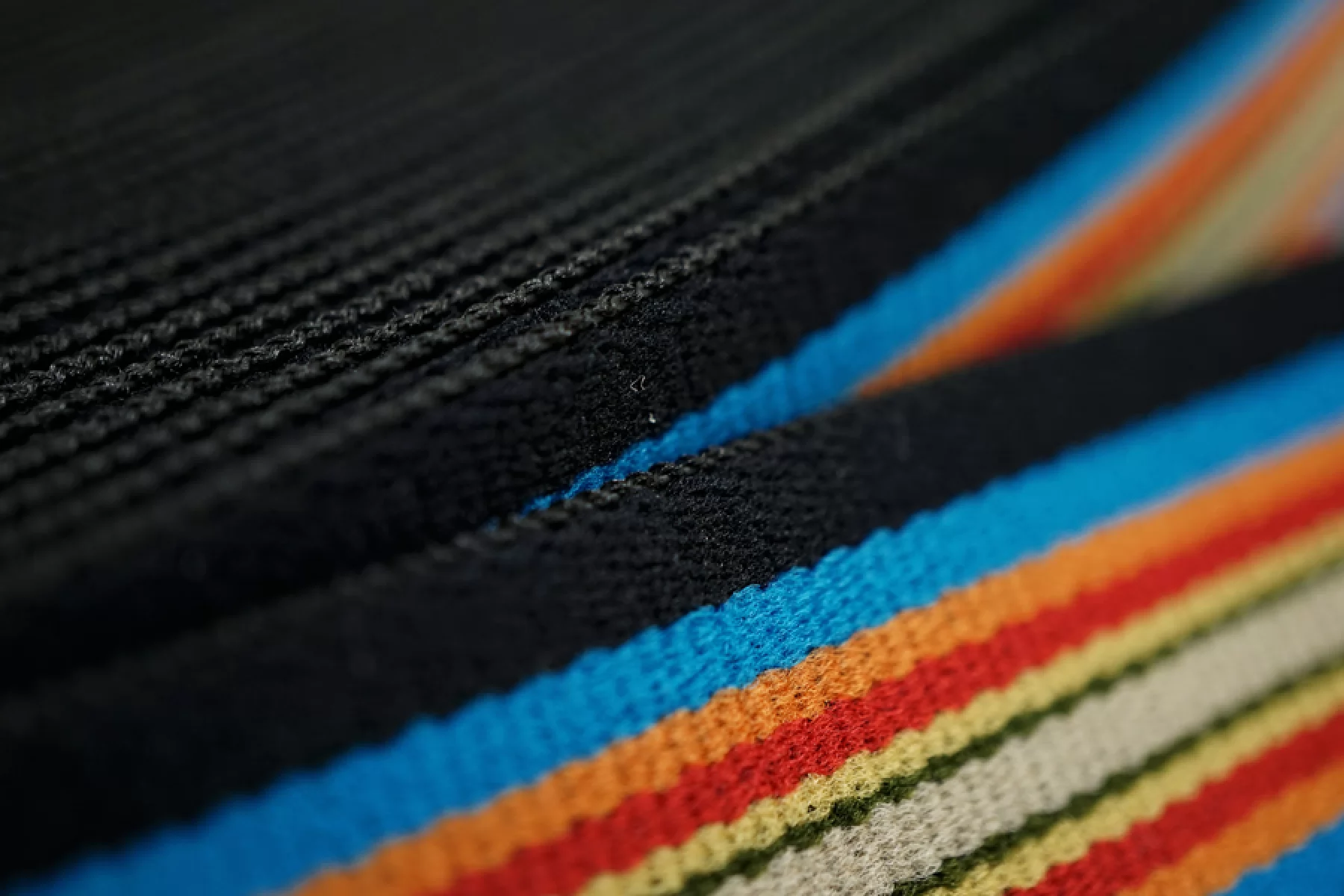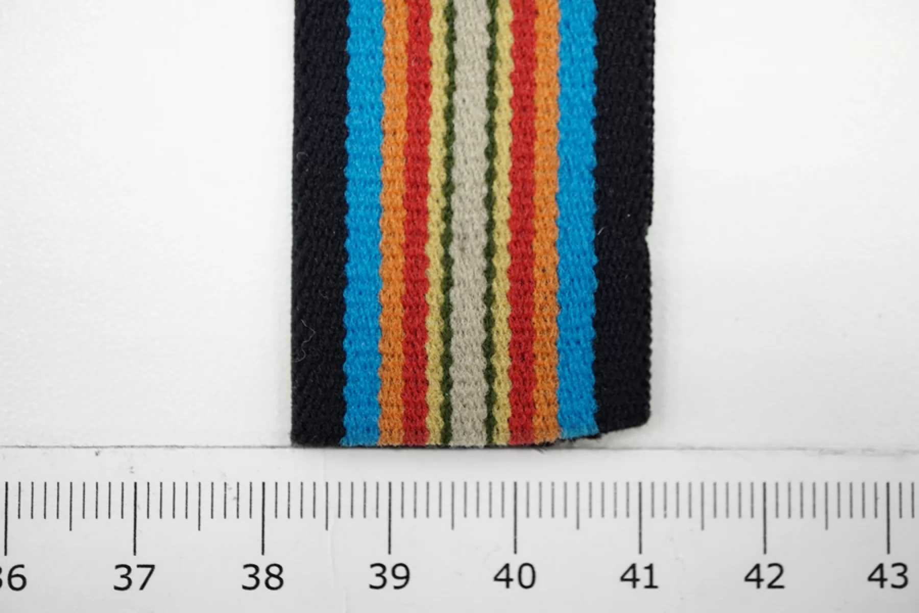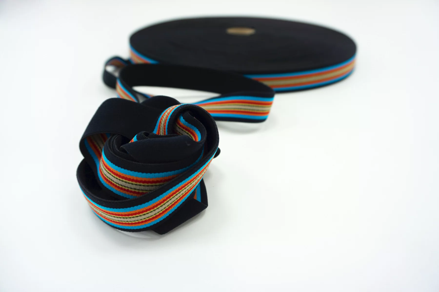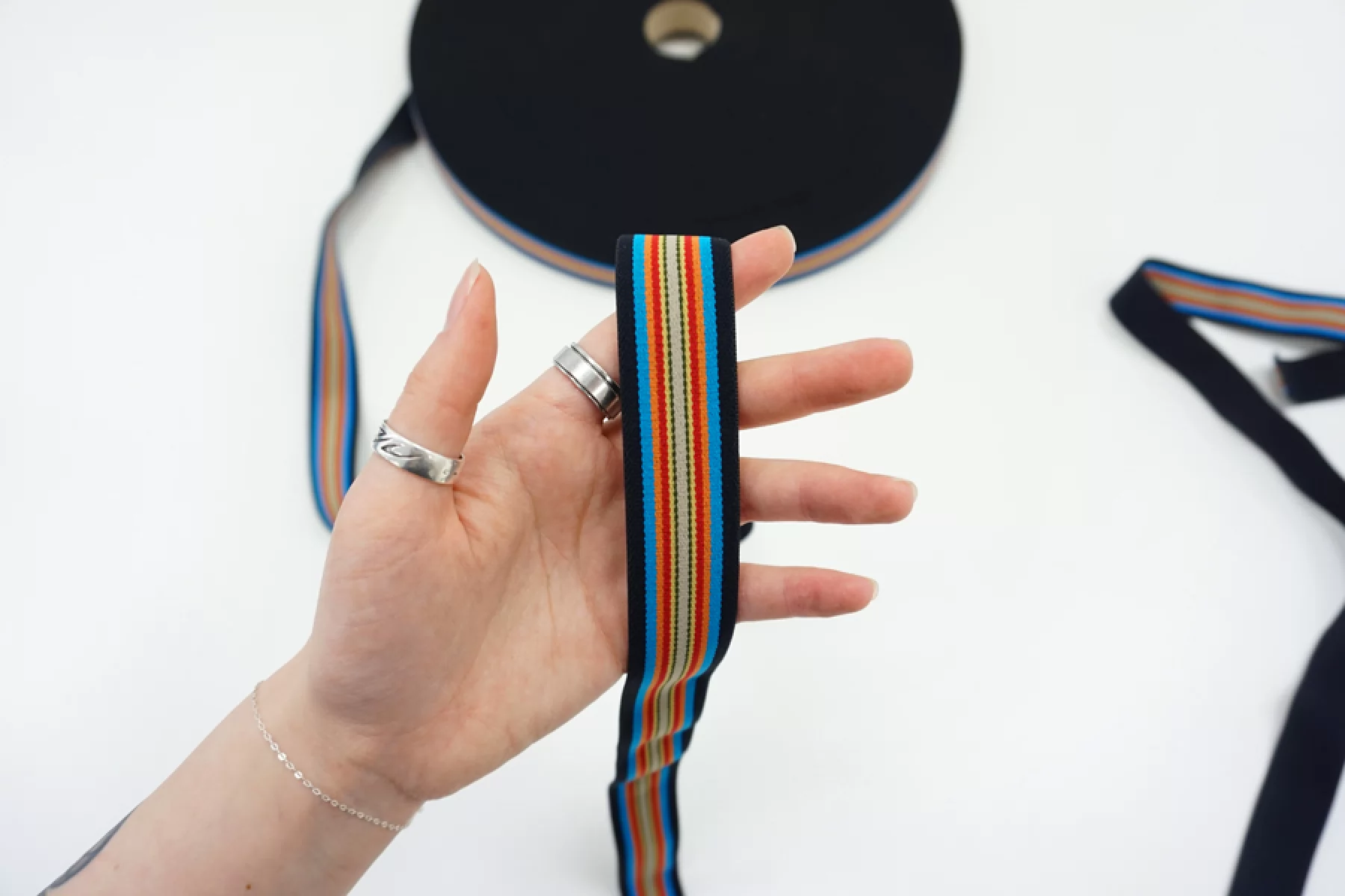 Упругая резинка с полосами разных цветов, шириной 27 мм, плотная. Немного шершавая, но приятная наощупь. Подойдет для отделки юбок, брюк, аксессуаров.