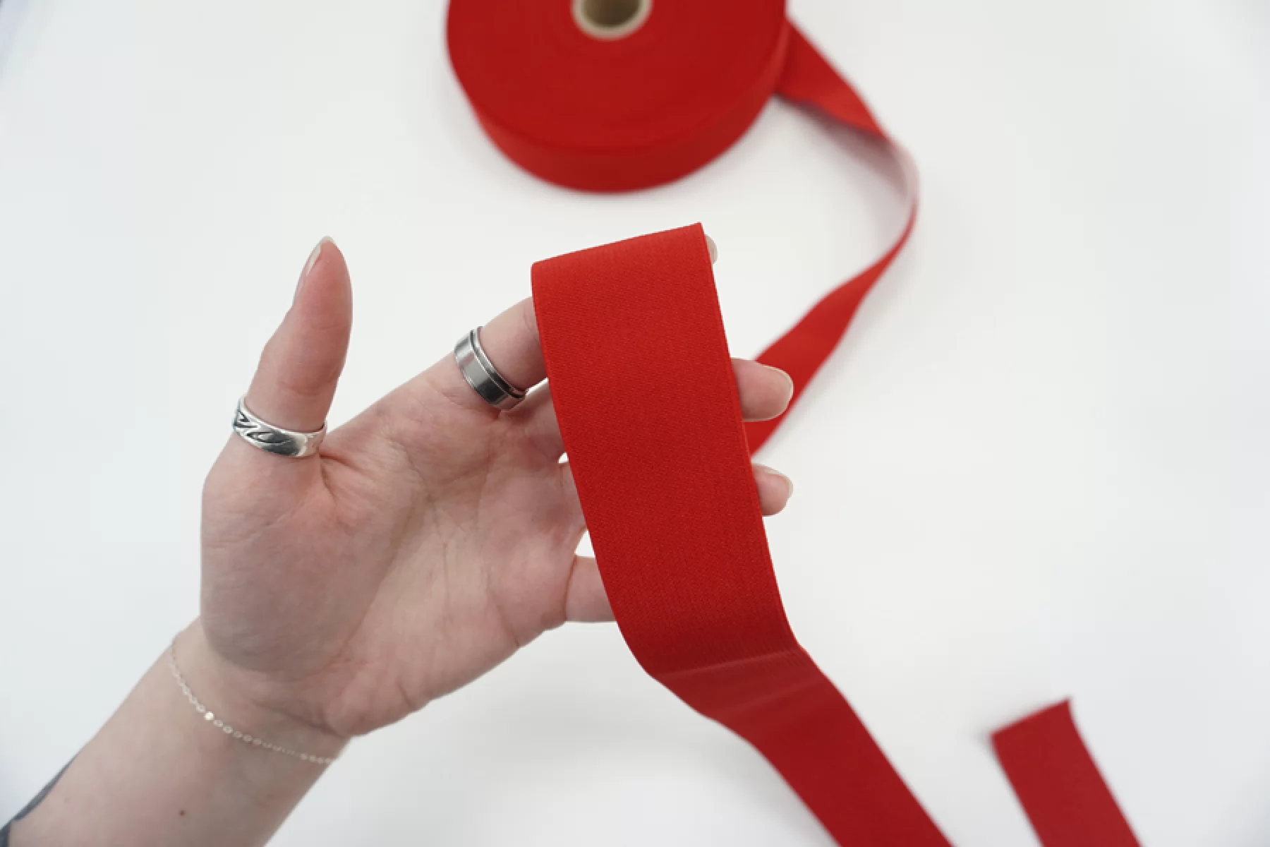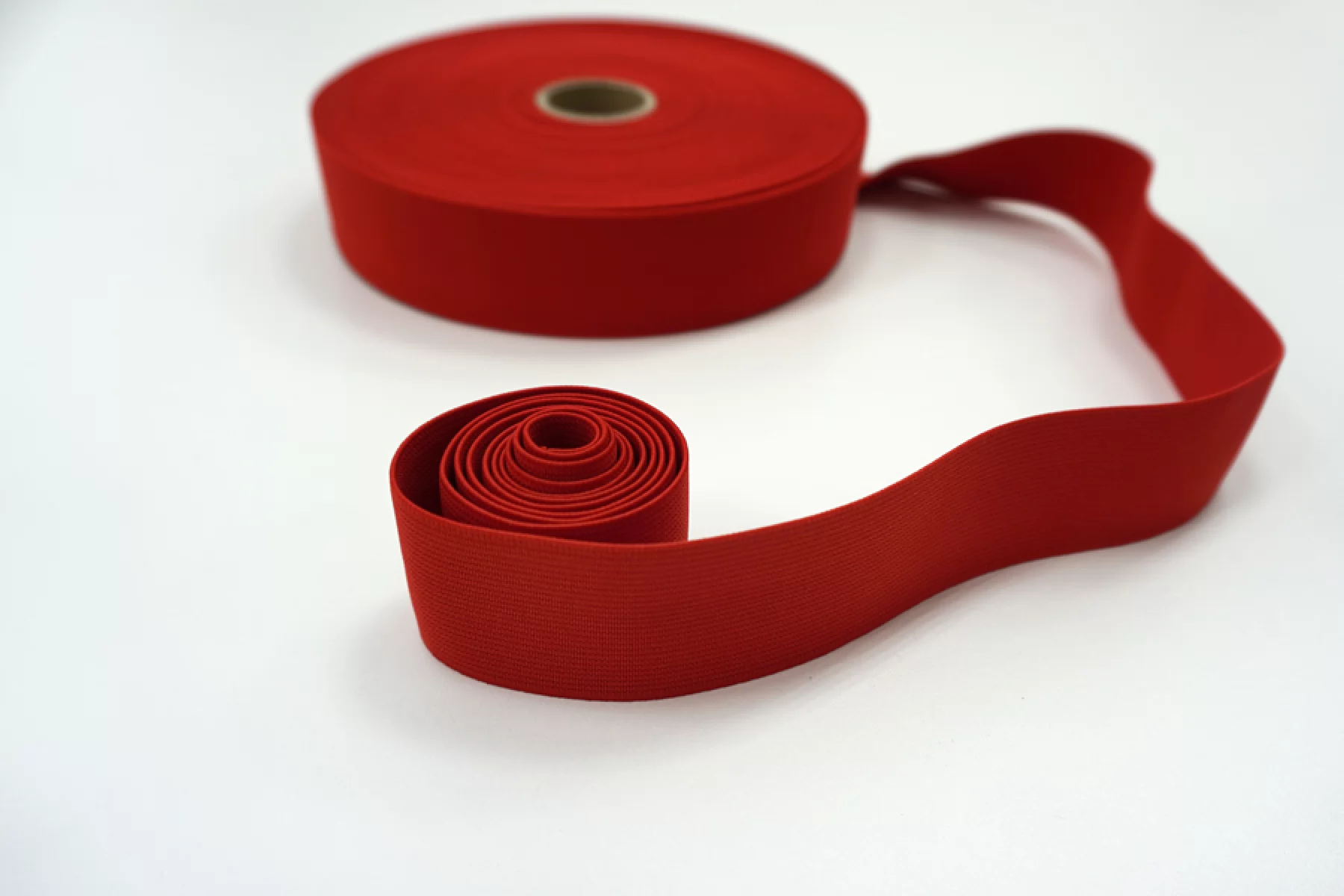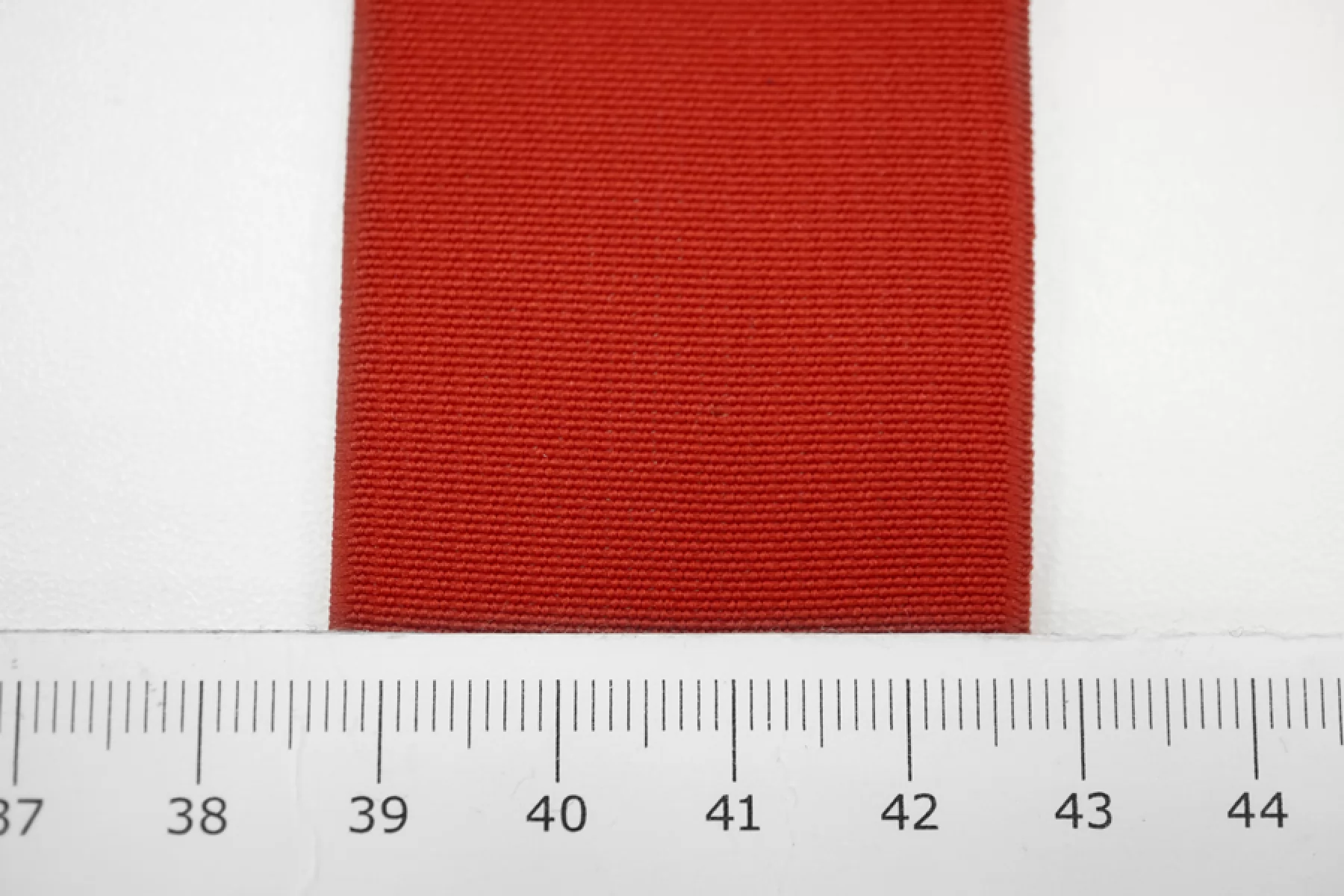 Упругая резинка красного цвета, шириной 40 мм, плотная, тугая. Подойдет для отделки юбок, брюк, ремней и других аксессуаров.
