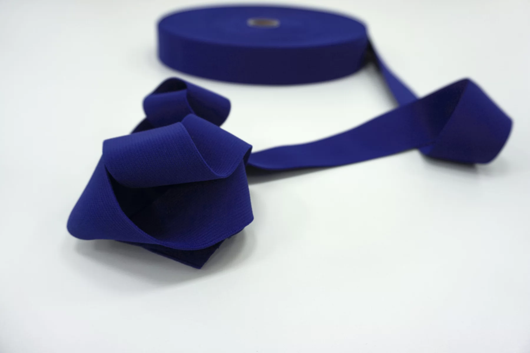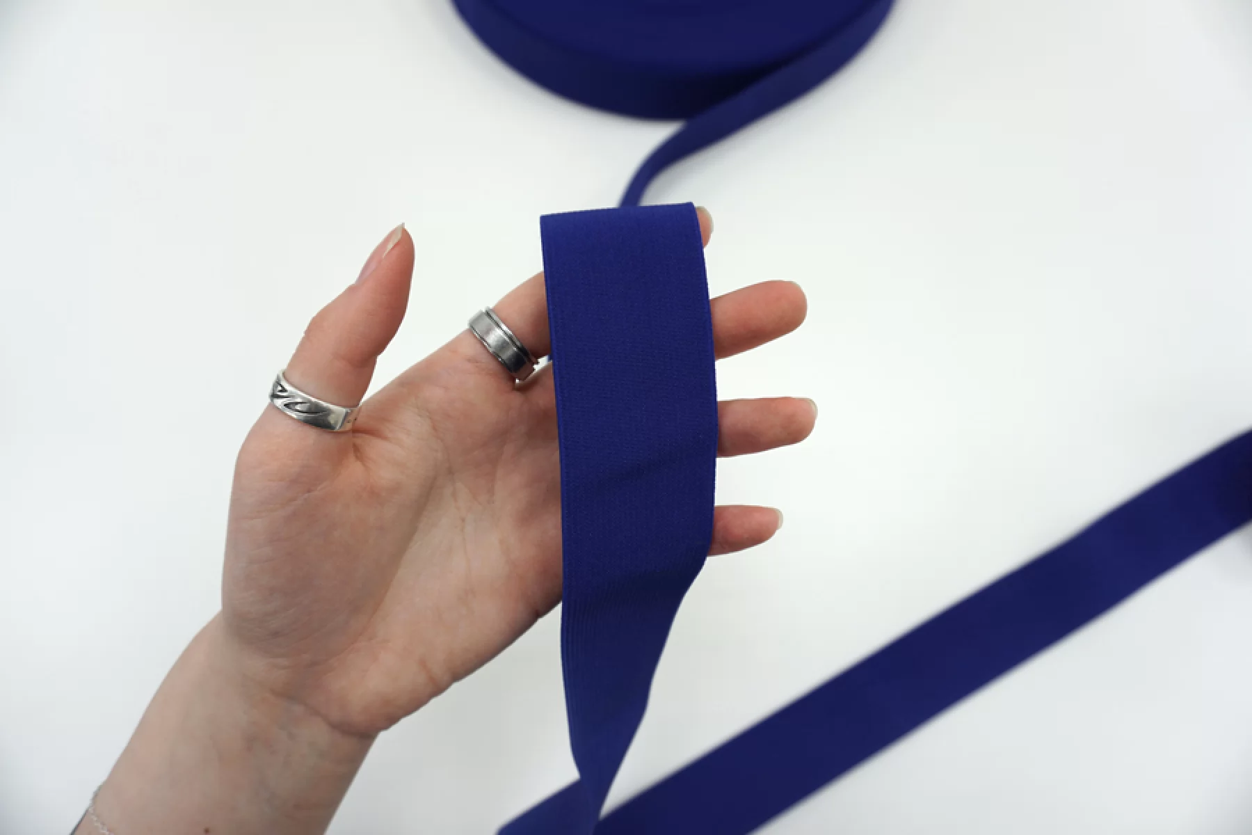 Упругая резинка синего цвета, шириной 27 мм, плотная, тугая. Подойдет для отделки юбок, брюк, ремней и других аксессуаров.