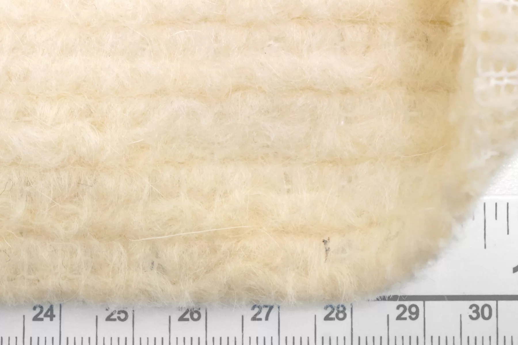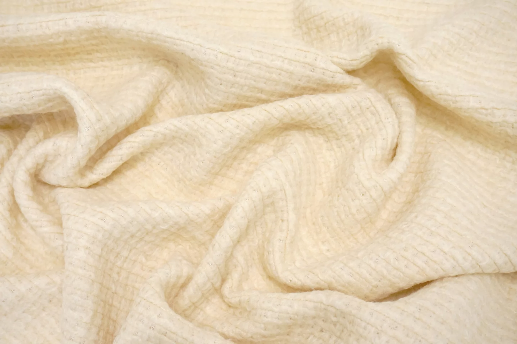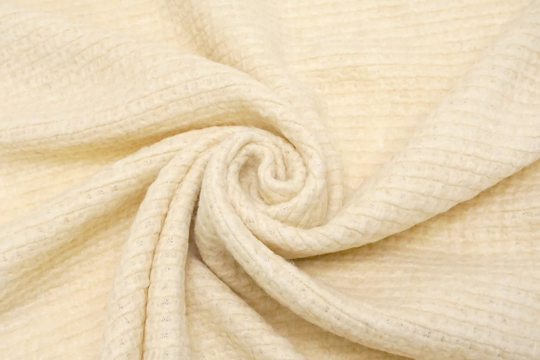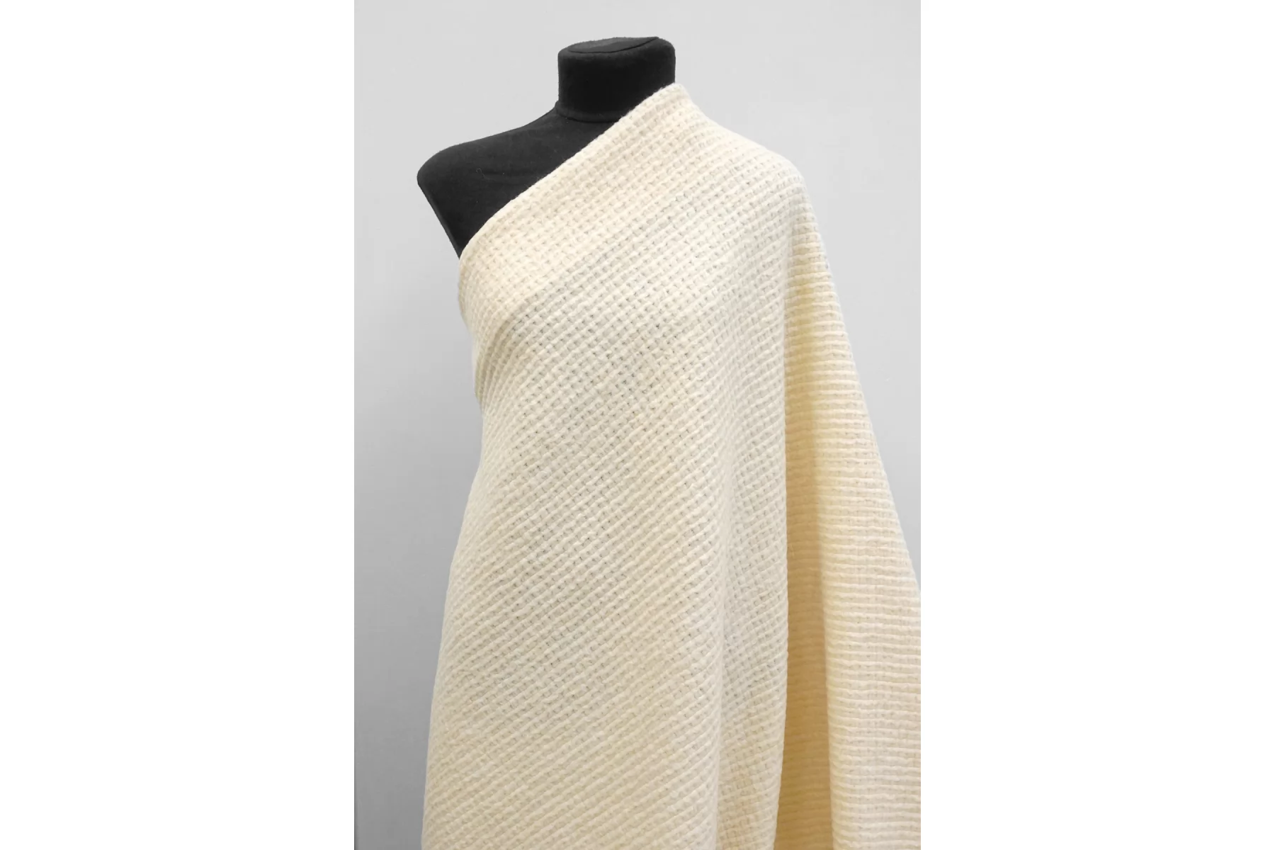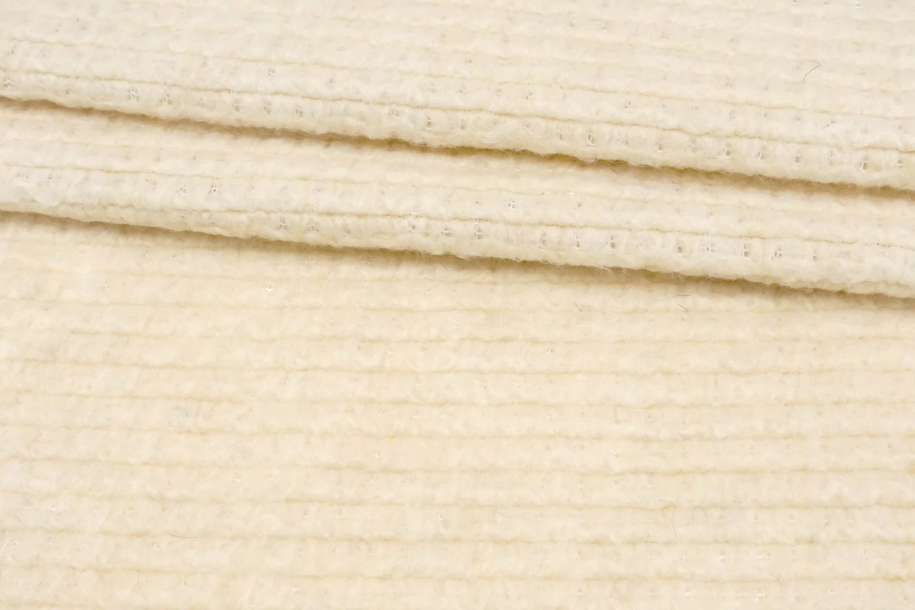 Классный фактурный шерстяной трикотаж в нежном сливочном оттенке. Мягкий, с прижатым ворсом. Немного покалывает. Плетение не плотное, немного просвечивает. Толстенький, примерно 5 мм. Форм держит, довольно пластичен. Стабильный, особо не тянется. Подойдет на мягкие жакеты, кофты, бомберы, костюмы. Учитывайте возможную усадку. Уход деликатный.
