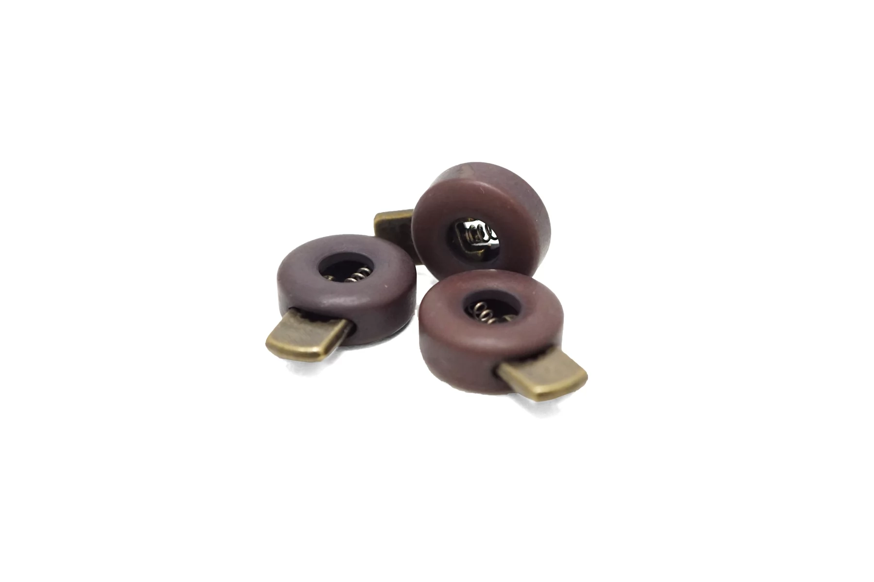 Фиксатор для шнурка пластик с металлом. Цвет - коричневый с бронзой, круглой формы с одним отверстием (диаметр отверстия 5 мм.).