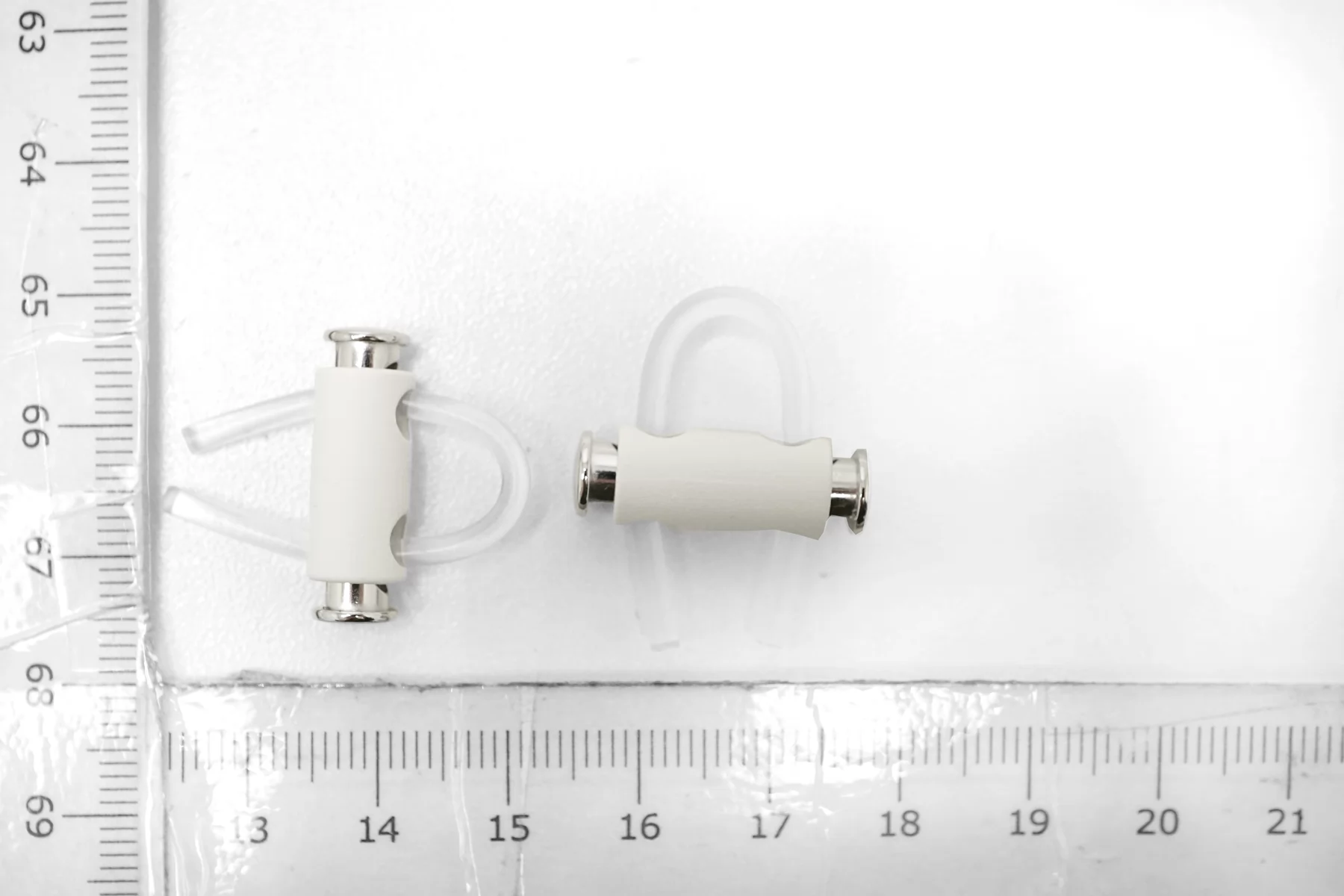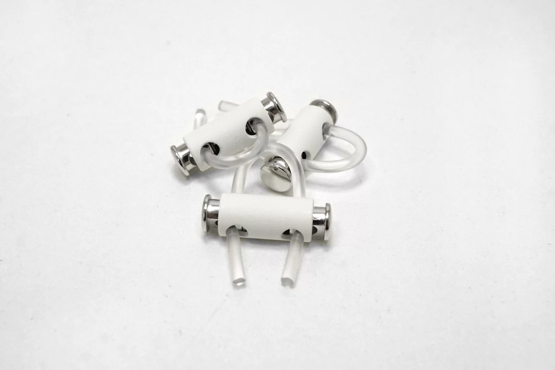 Металлический фиксатор для шнурка. Цвет - белый, цилиндрической формы с двумя отверстиями (диаметр отверстия 2 мм.).