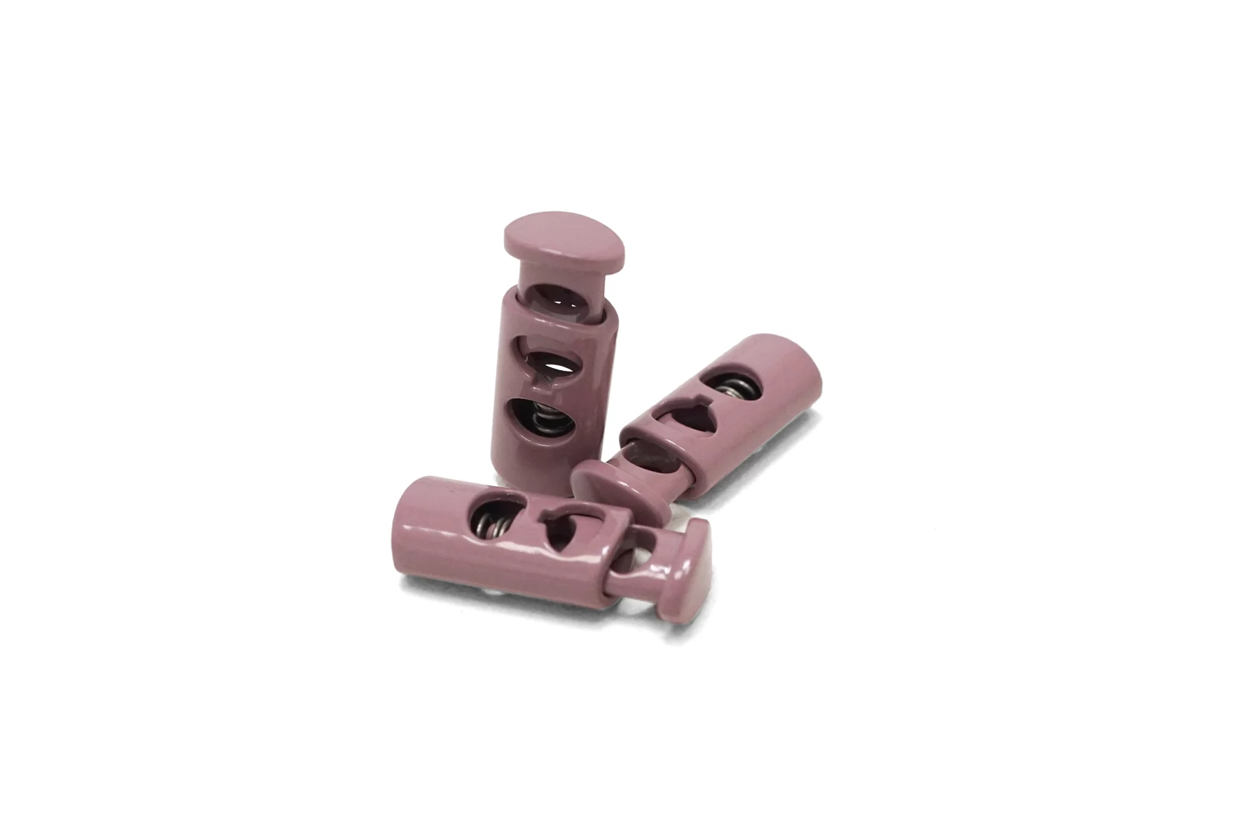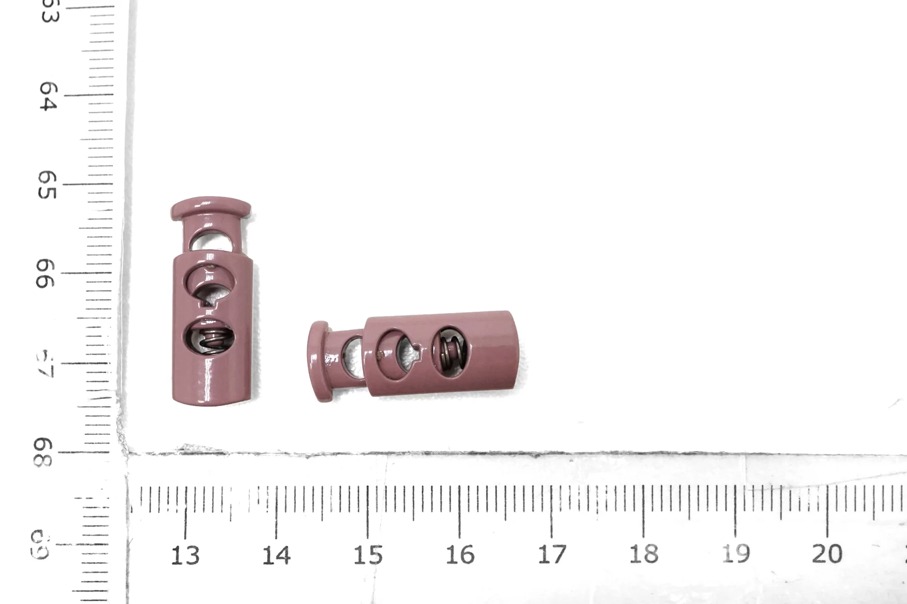 Металлический фиксатор для шнурка. Цвет - розовый, цилиндрической формы с двумя отверстиями (диаметр отверстия 4 мм.).