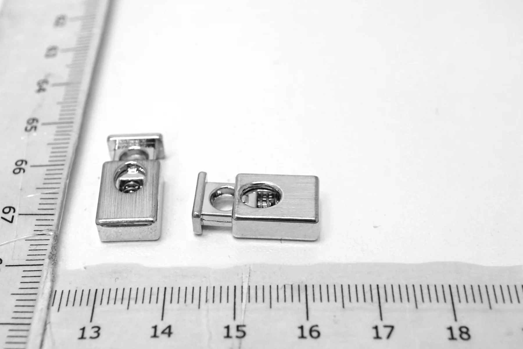 Металлический фиксатор для шнурка. Цвет -серебряный, прямоугольной формы с одним отверстием (диаметр отверстия 5 мм.).