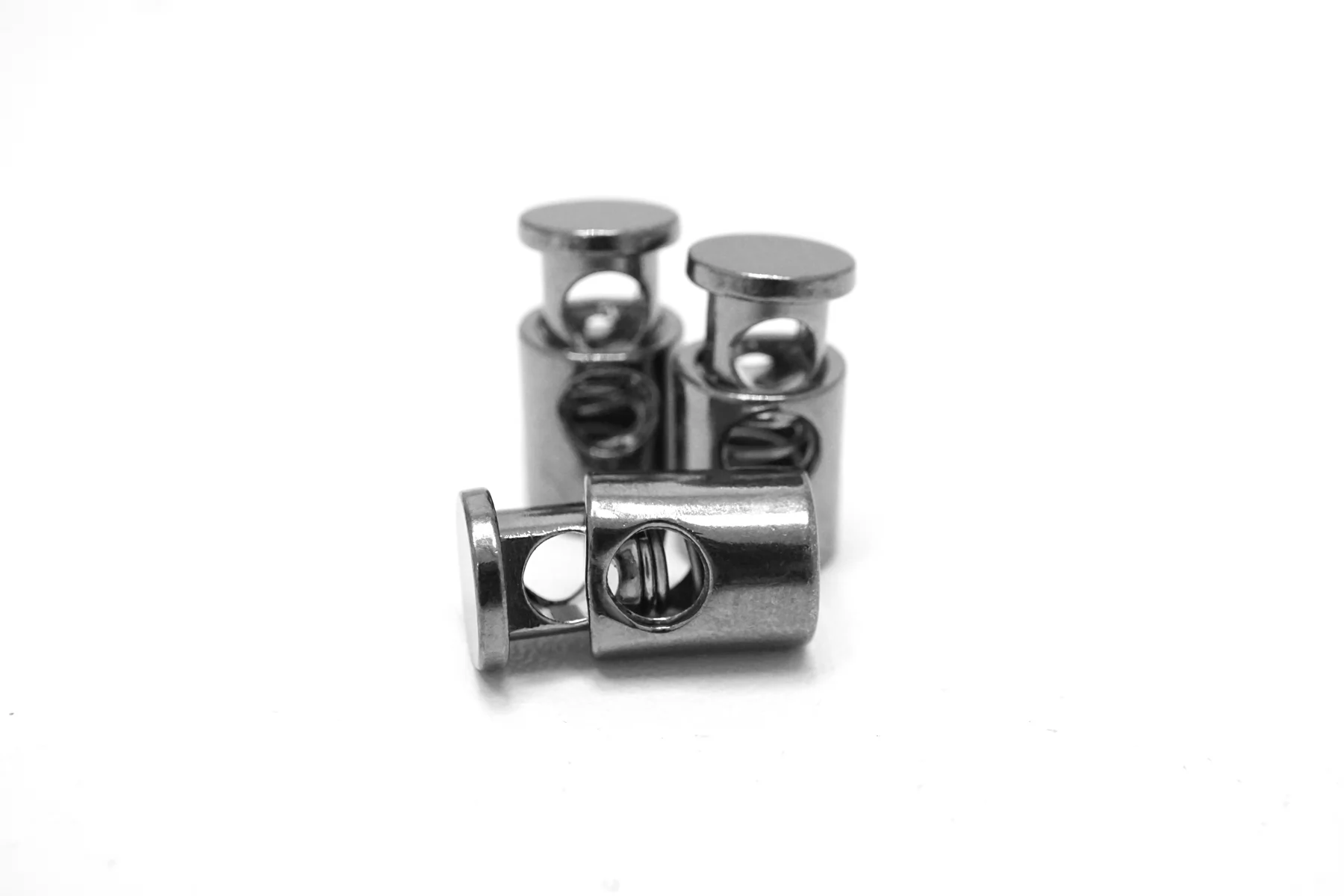 Металлический фиксатор для шнурка. Цвет - серебряный, цилиндрической формы с одним отверстием (диаметр отверстия 5 мм.).