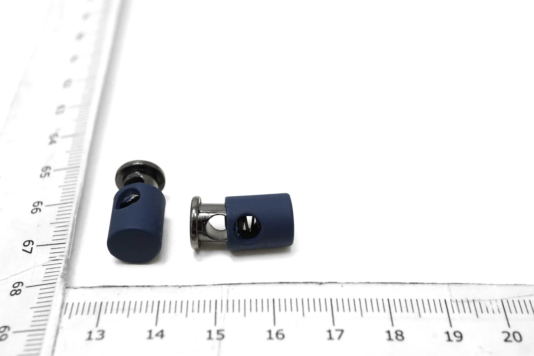 Металлический фиксатор для шнурка. Цвет - синий, цилиндрической формы с одним отверстием (диаметр отверстия 5 мм.).