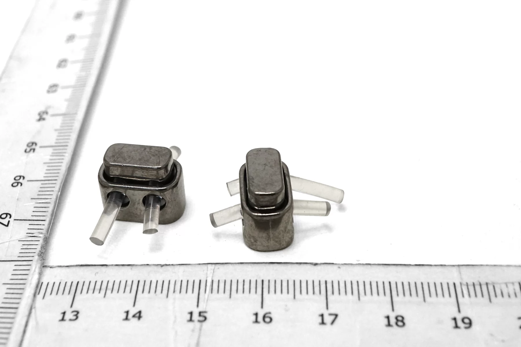 Металлический фиксатор для шнурка. Цвет - темный никель, прямоугольной формы с двумя отверстиями (диаметр отверстия 3 мм.).